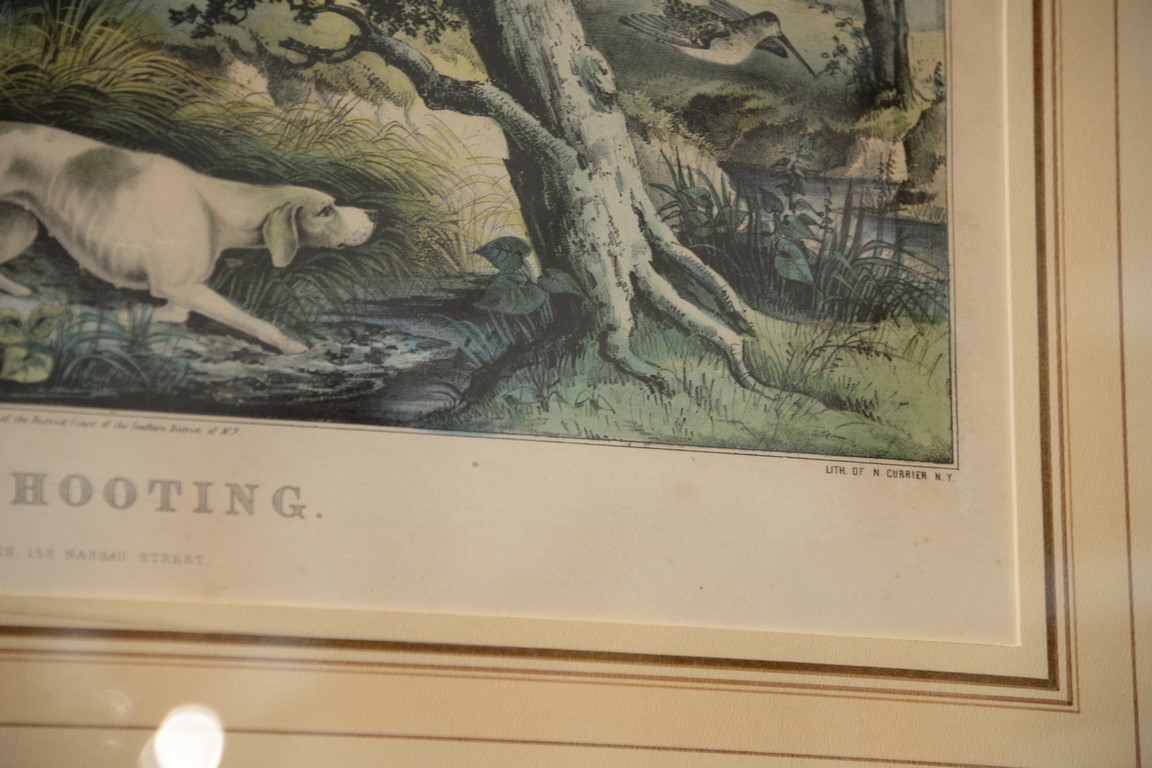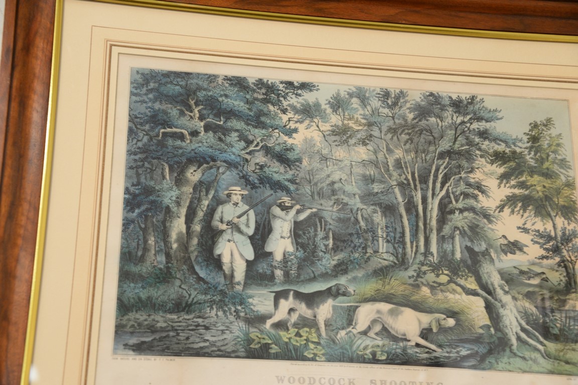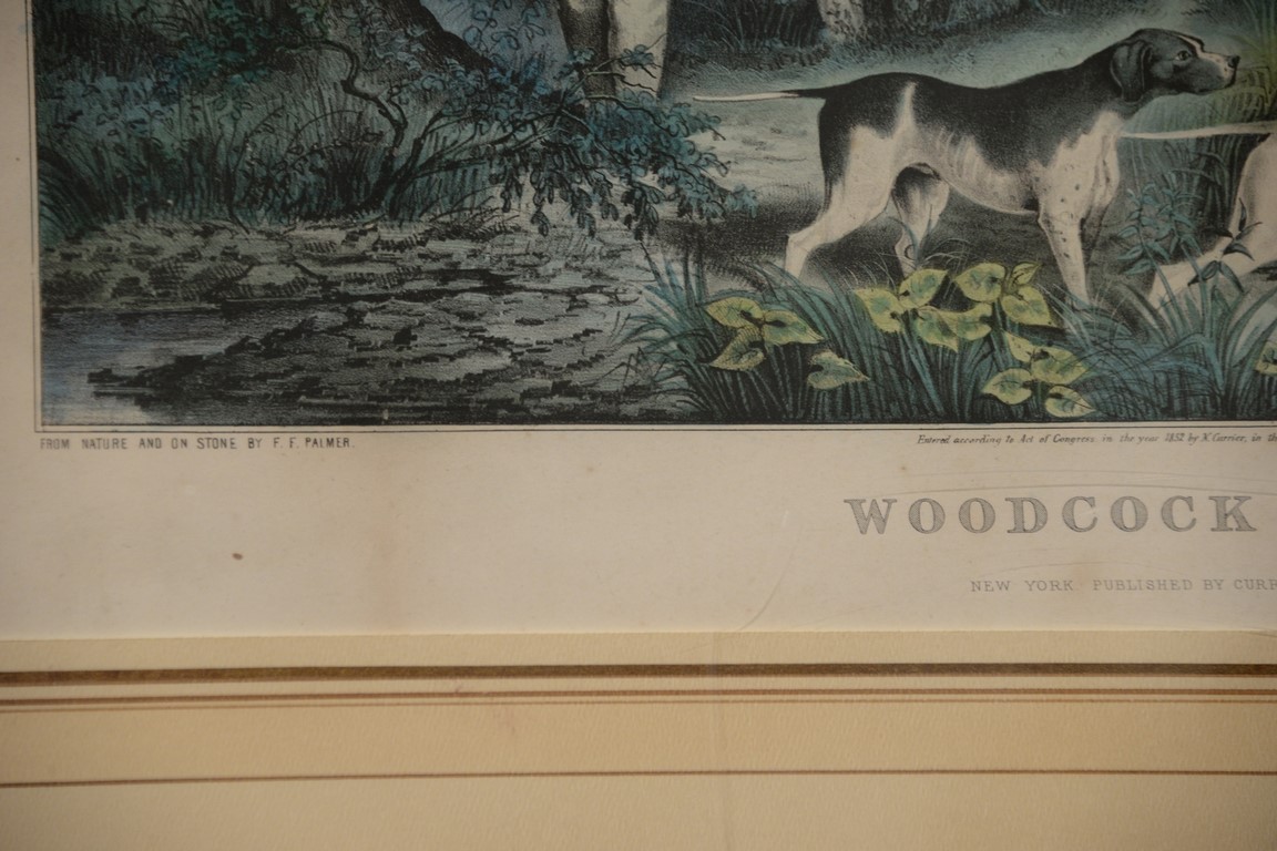 Lot 246: Nathaniel Currier, two hand colored lithographs, After F.F. Palmer 1852, Woodcock Shooting, by N. Currier, sight size 15 1/4 x 21…