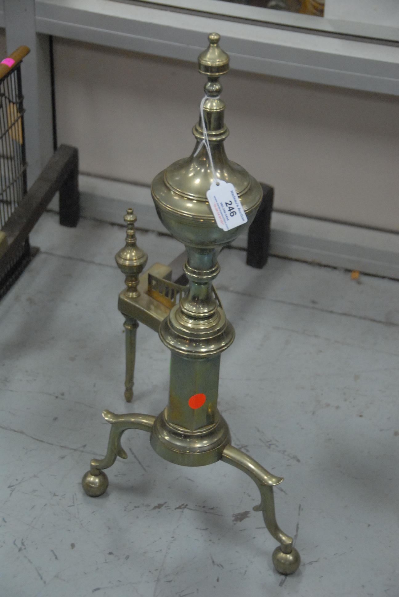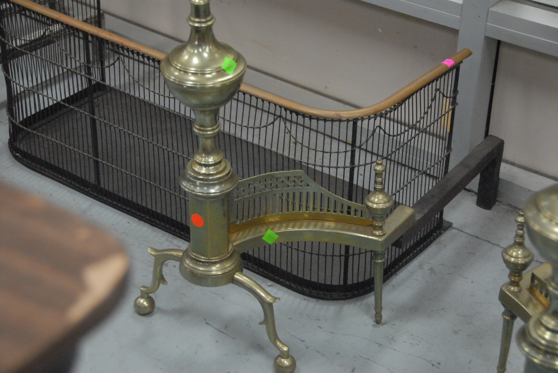 Lot 246: Pair of Federal brass andirons having turned finials over urns on spurred legs and ball feet, each with pierced brass and log stops. ht. 23 1/2 in. Provenance: Property from a Private Collection Sold for the Benefit of the Virginia Hist