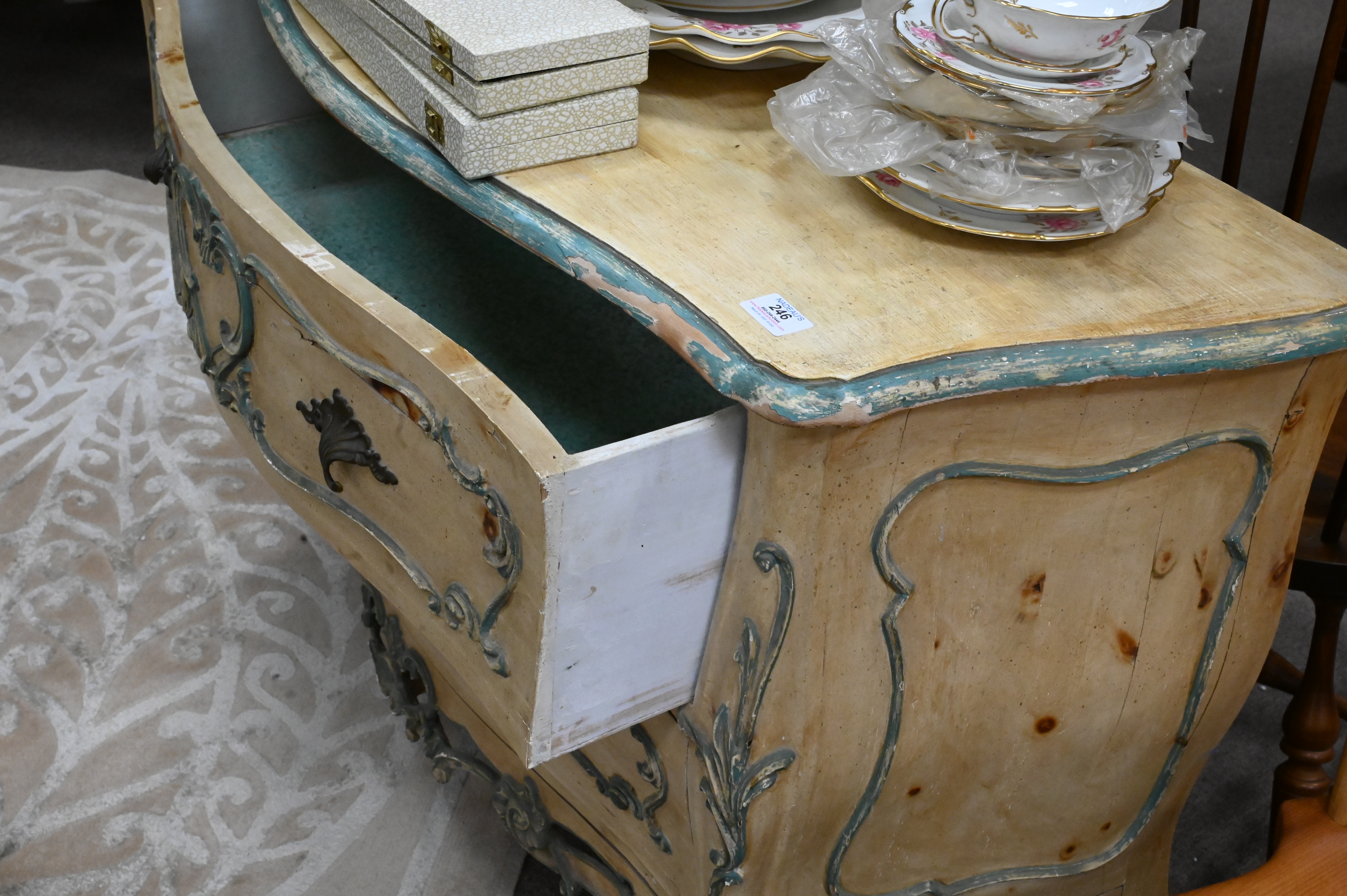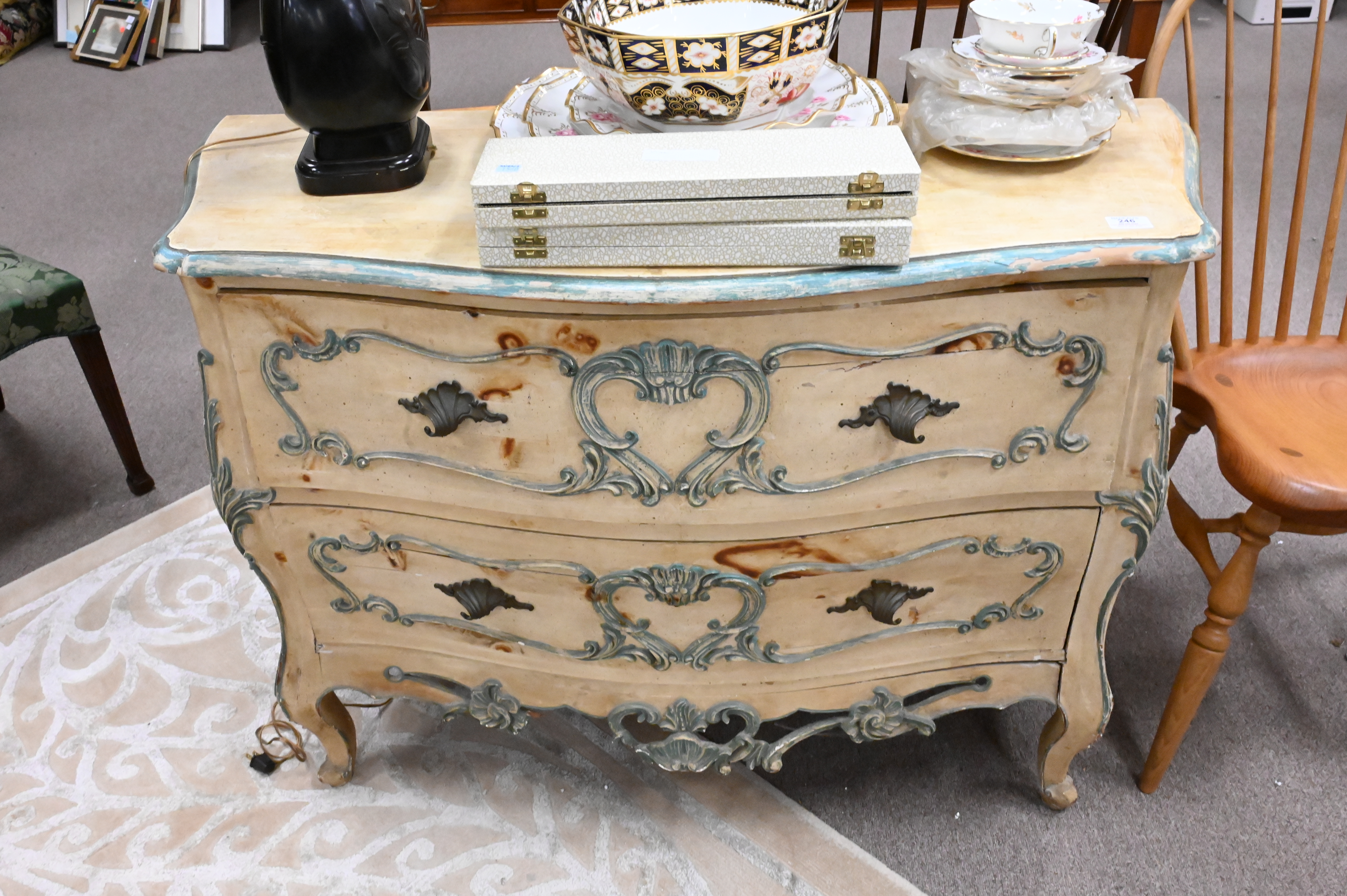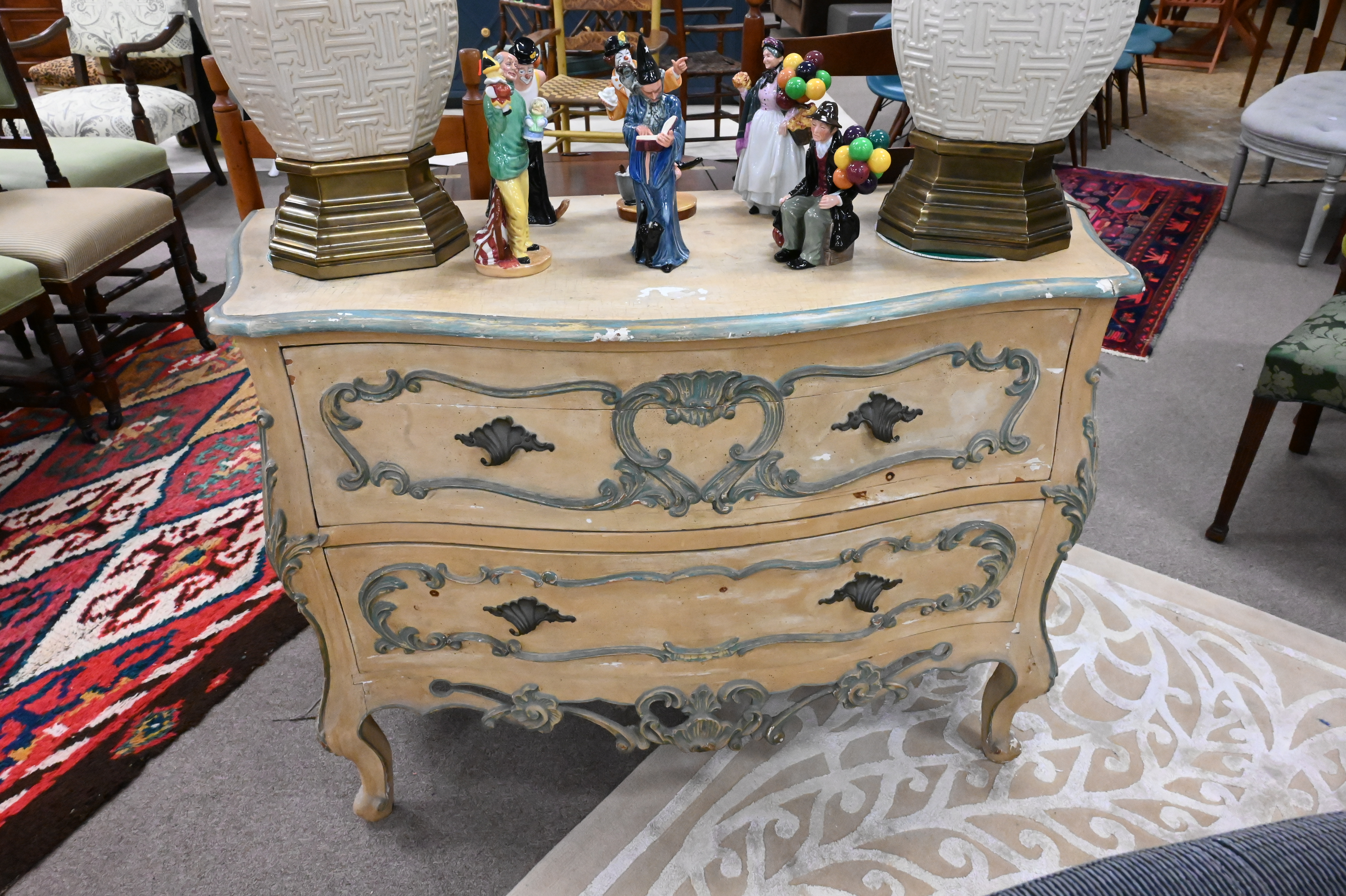 Pair of Louis XV Style Painted Commodes, each having shaped top over two large drawers set on cabriole legs, height 31 inches, having old paper label on back, top 17″ x 45″.