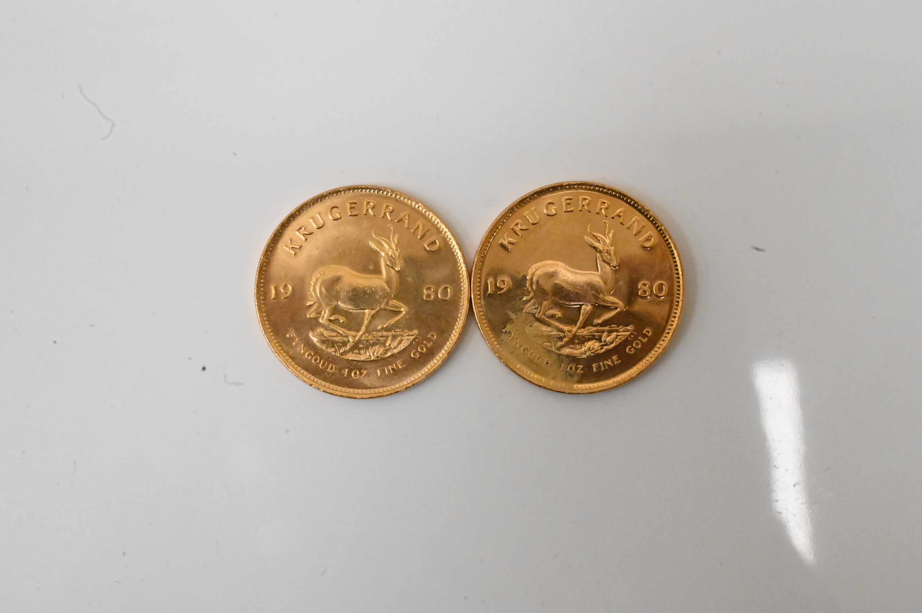 Two 1980 South African One Ounce Fine Gold Krugerrands, 2 oz total