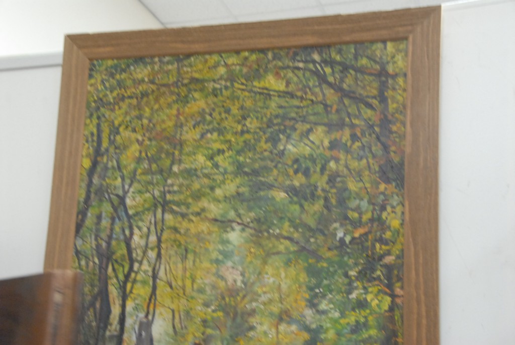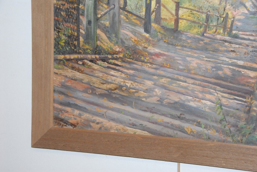 Two paintings oil on board of a fenced path in the woods signed lower left indistinctly and an oil on canvas still life.
