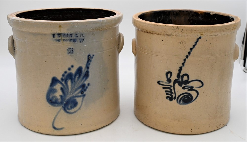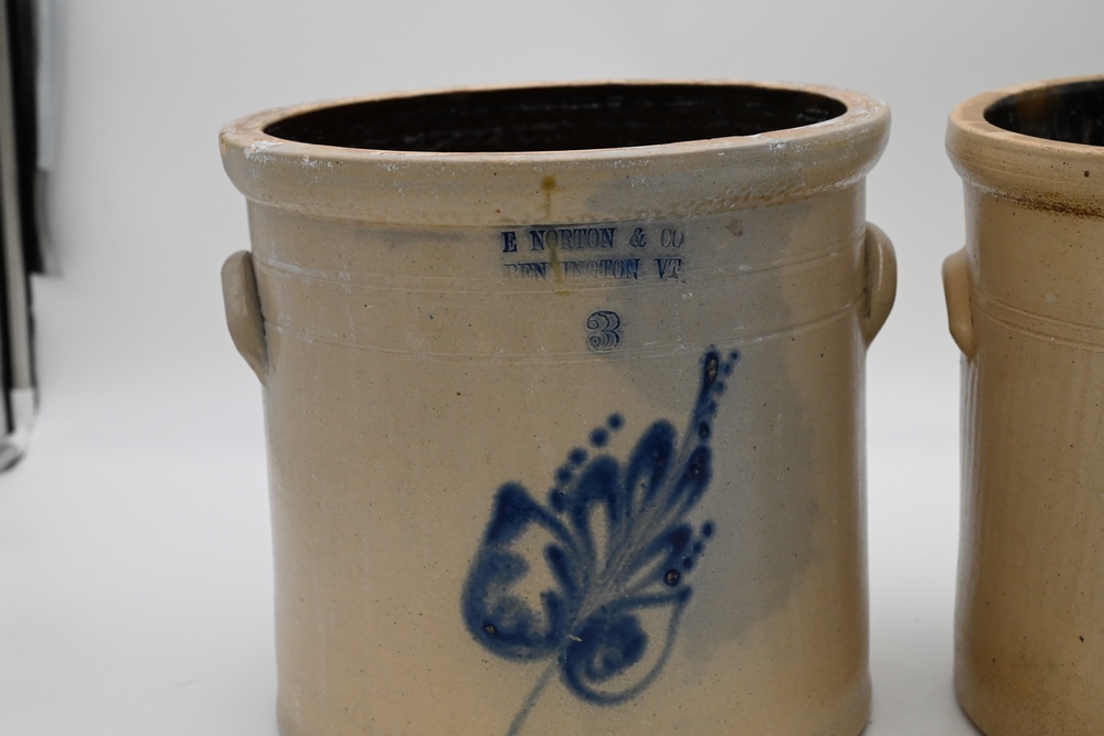 to include an E. Norton and Company three gallon crock, having cobalt flower, marked “E. Norton & Co., Bennington, VT”;