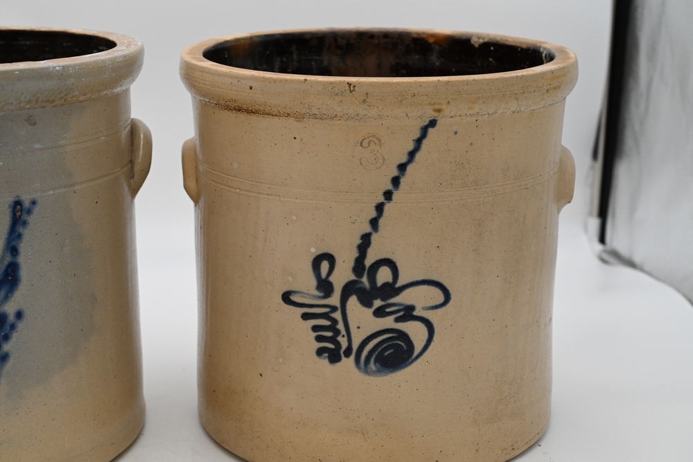 along with a three gallon stoneware crock, having cobalt flower form decoration,