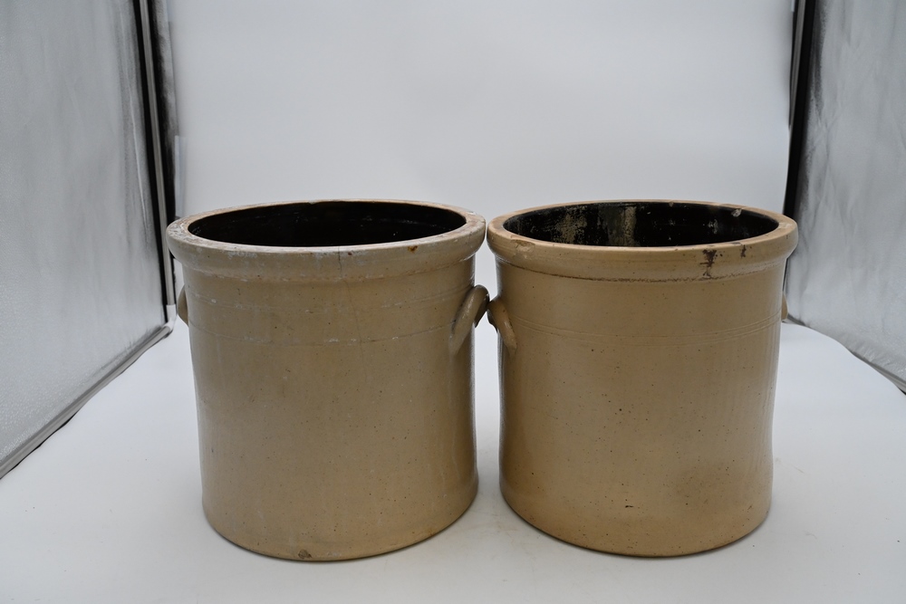 Lot 246: Two Piece Stoneware Lot to include an E. Norton and Company three gallon crock, having cobalt flower, marked “E. Norton & Co., Bennington, VT”; along with a three gallon stoneware crock, having cobalt flower form decoration, height 10 1/2 inches Provenance: Estate of Bruce Sasalla, East Hartford, Connecticut.