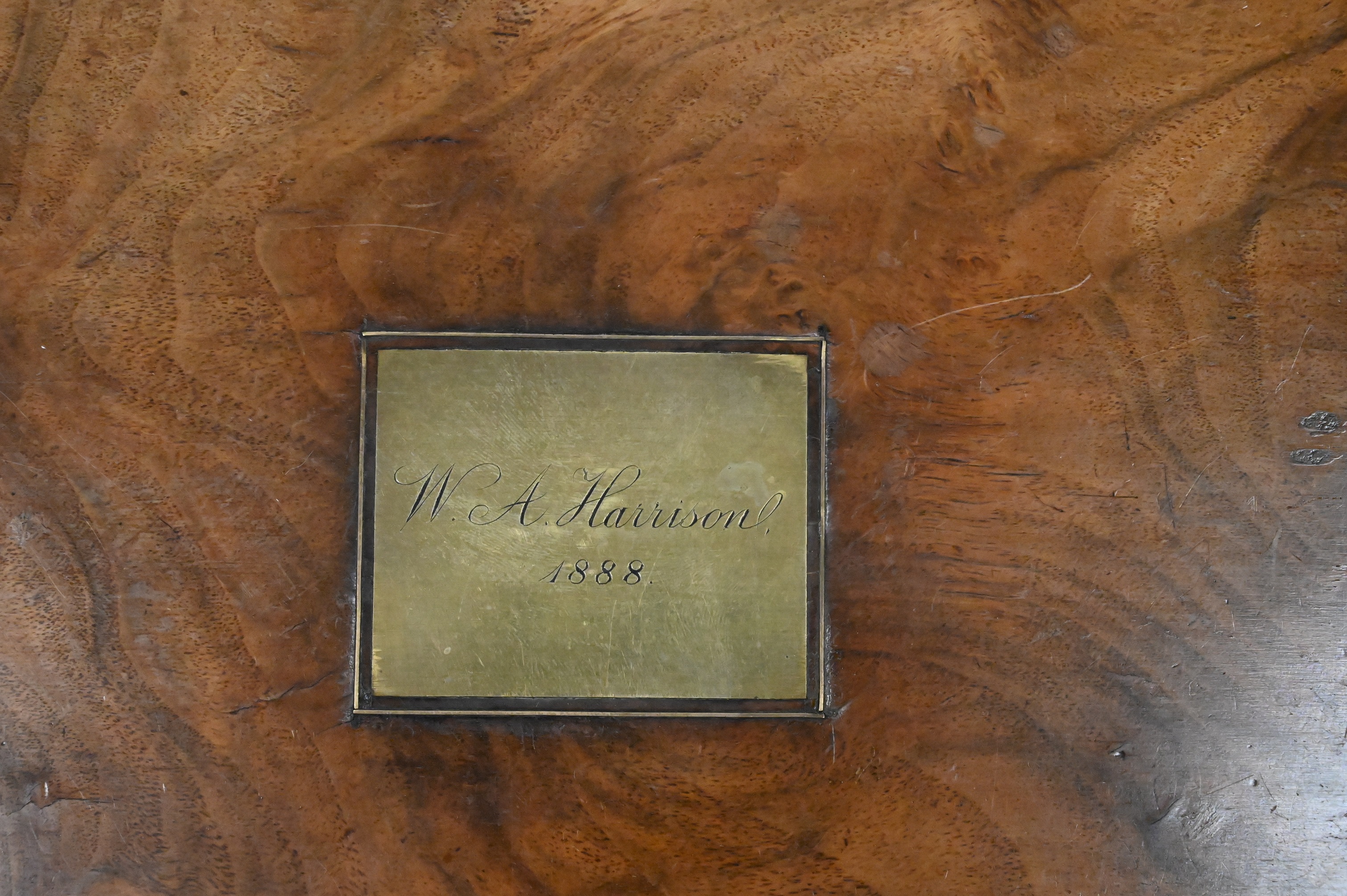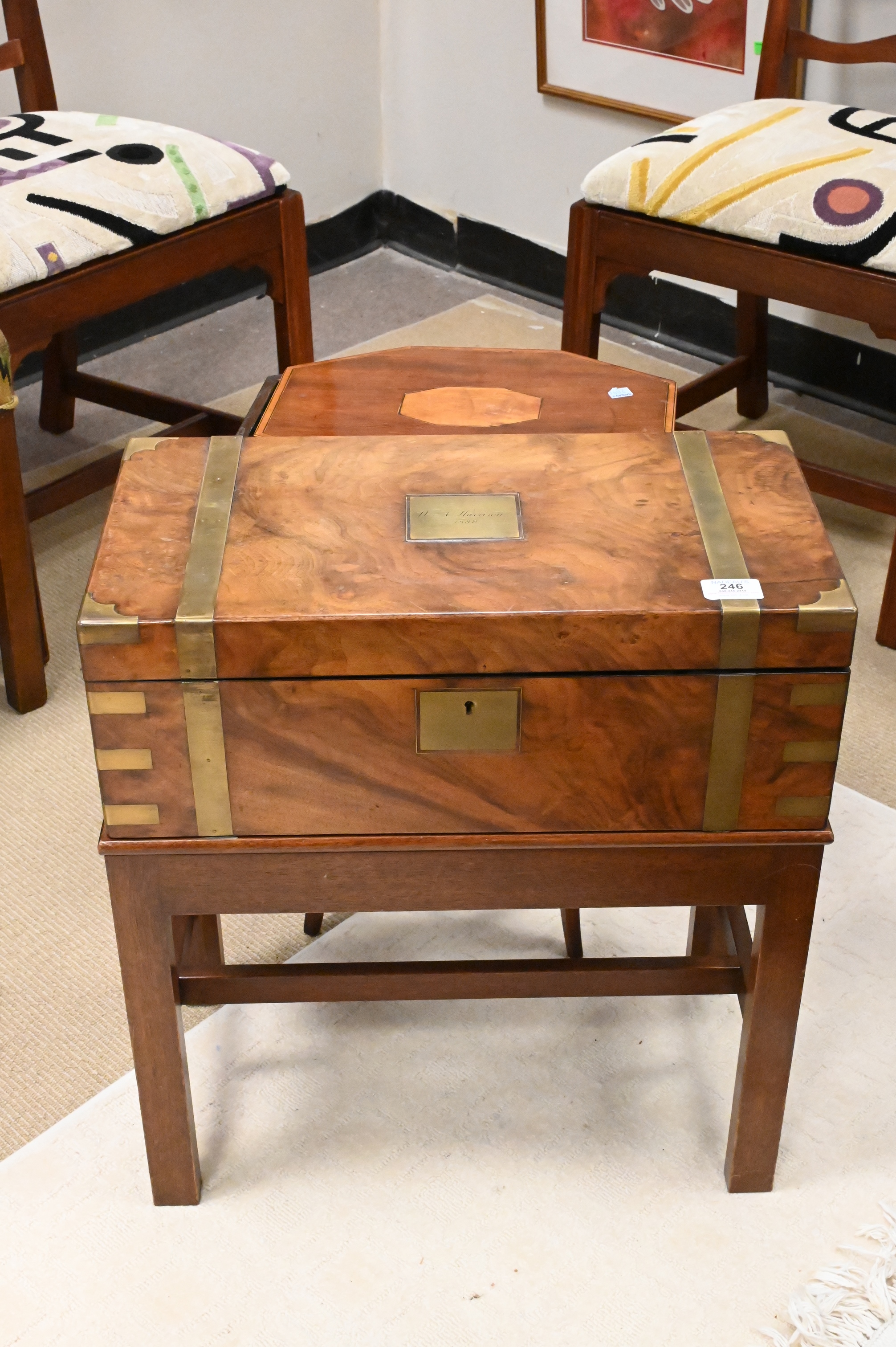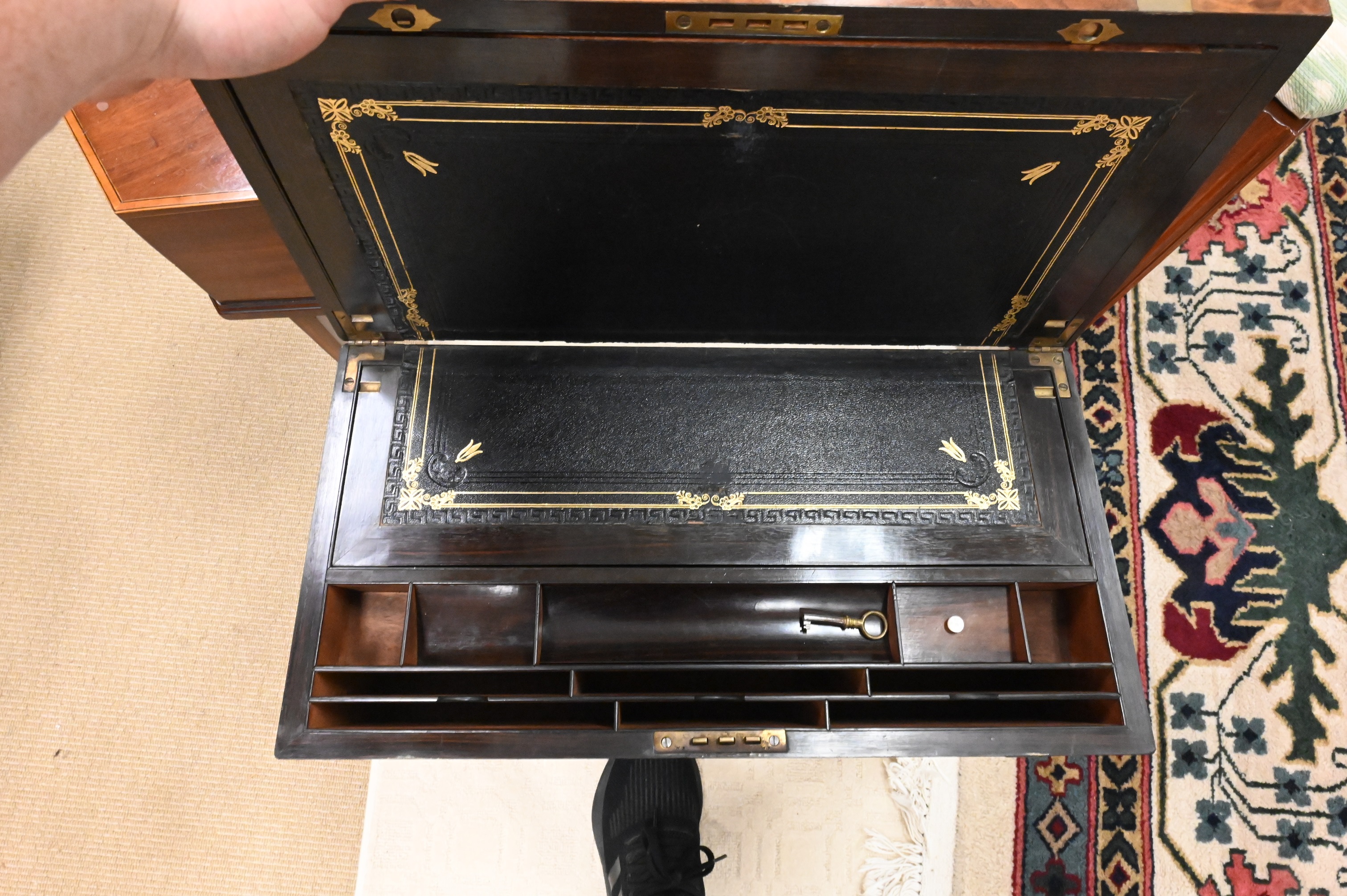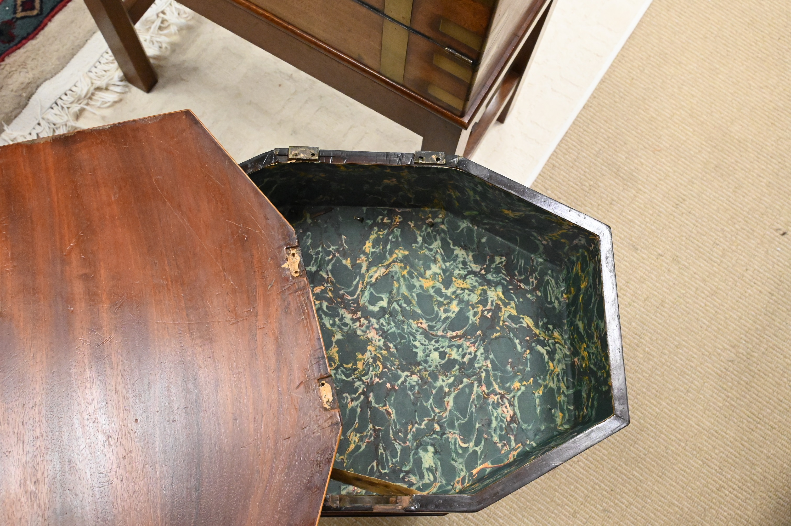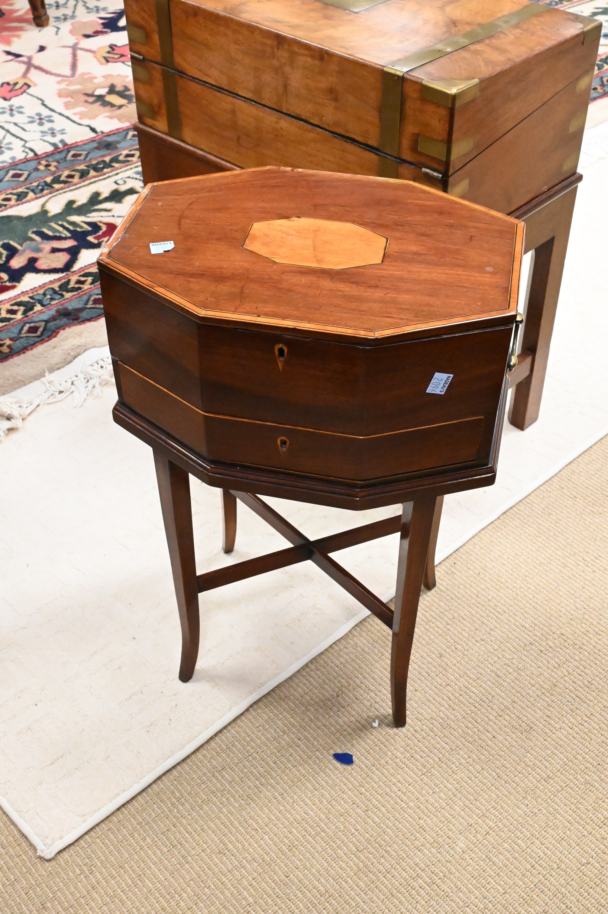 Two Small Mahogany Stands, a brass bound lap desk marked W.A. Harriston 1888 on stand (height 22 inches, top 10 1/2″ x 20″), along with an inlaid mahogany octagon stand lift top over one drawer, height 20 inches