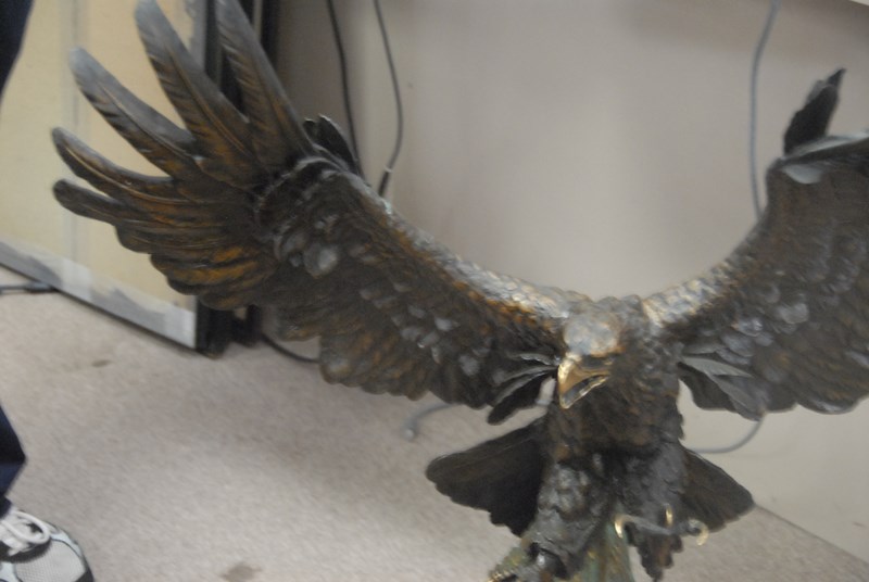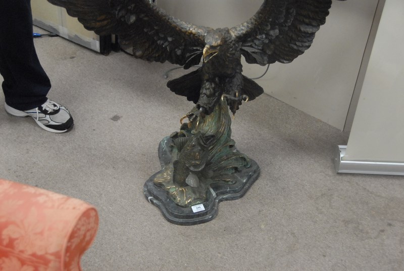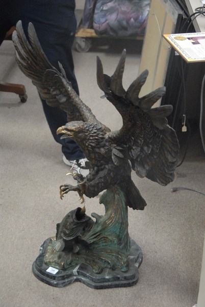 Lot 246: Who’s Catch bronze eagle and fish on marble base, signed at base Chope 22/25, ht. 37in. wd. 36in. dp. 20in.