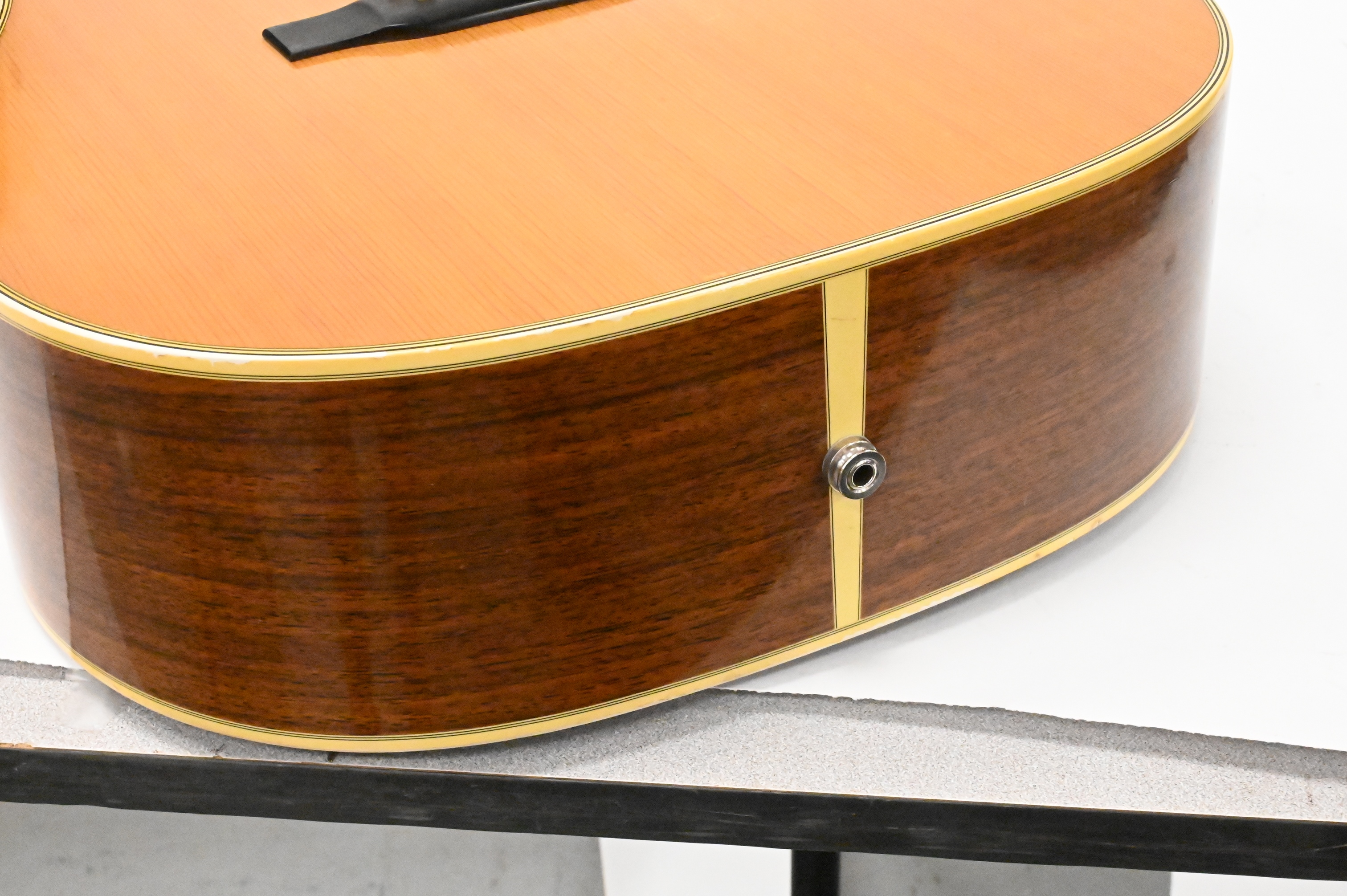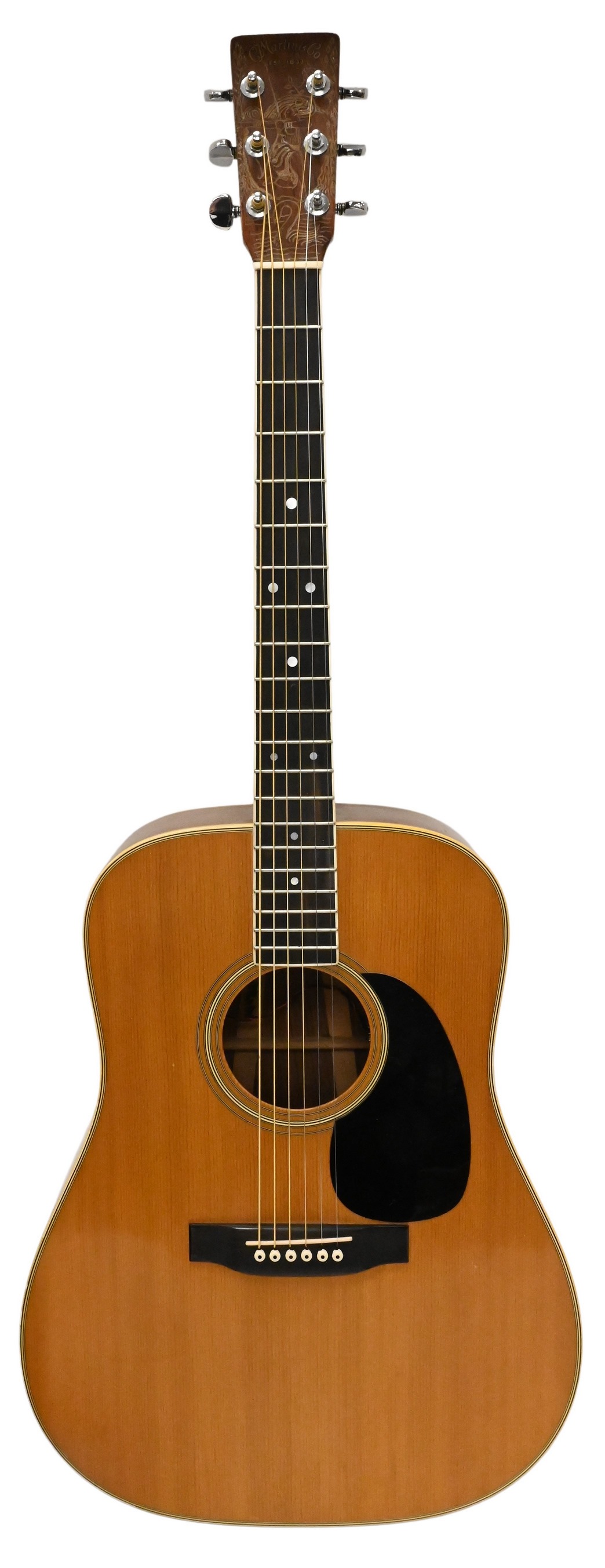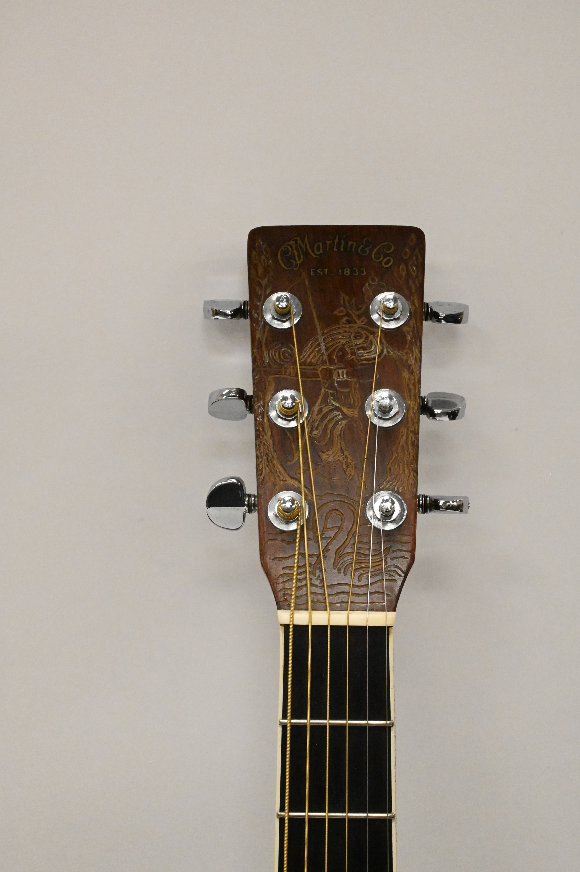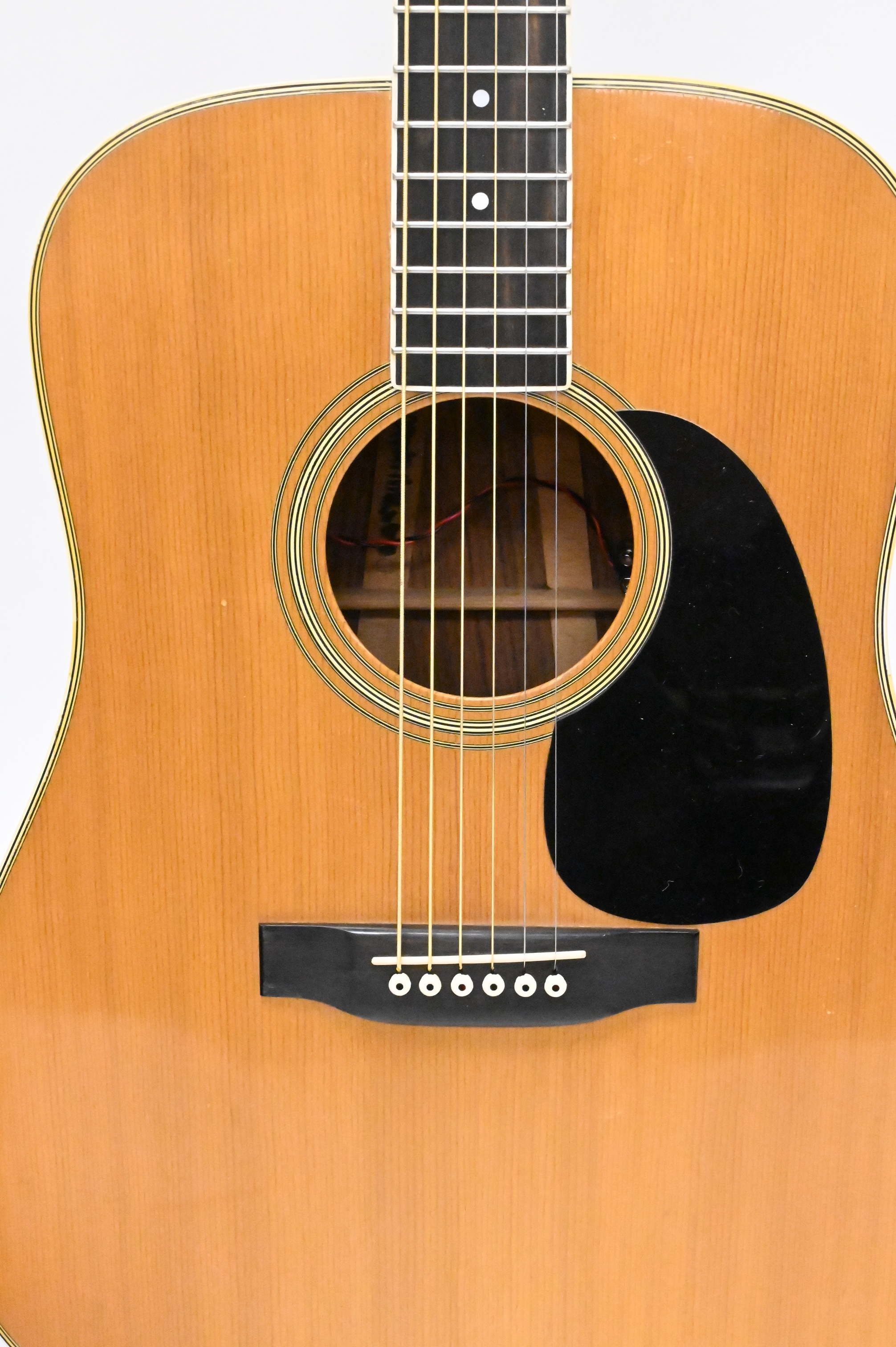 1973 Martin D-35 Guitar, serial #330709 with original hard shell case, Luthier installed Fishman Acoustic matrix pickup, and carved Native American design headstock, height 43 1/2 inches, width 17 inches.