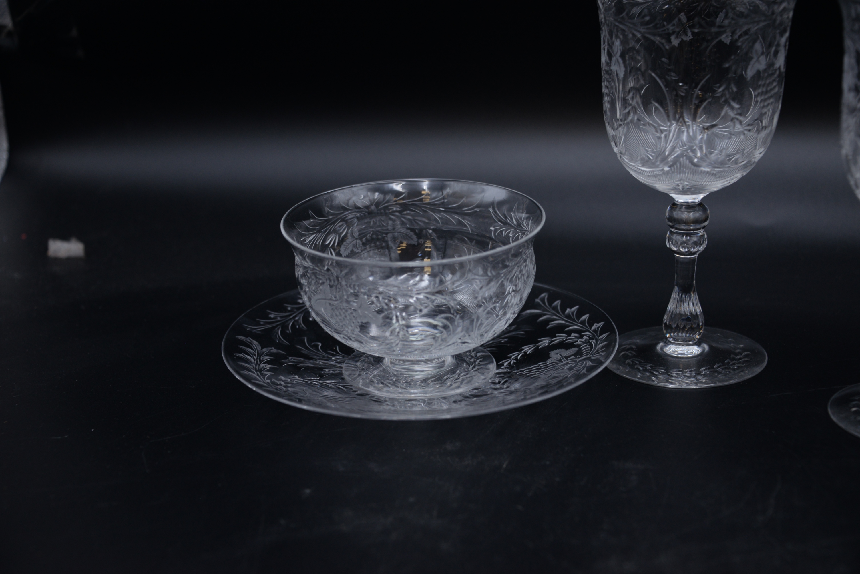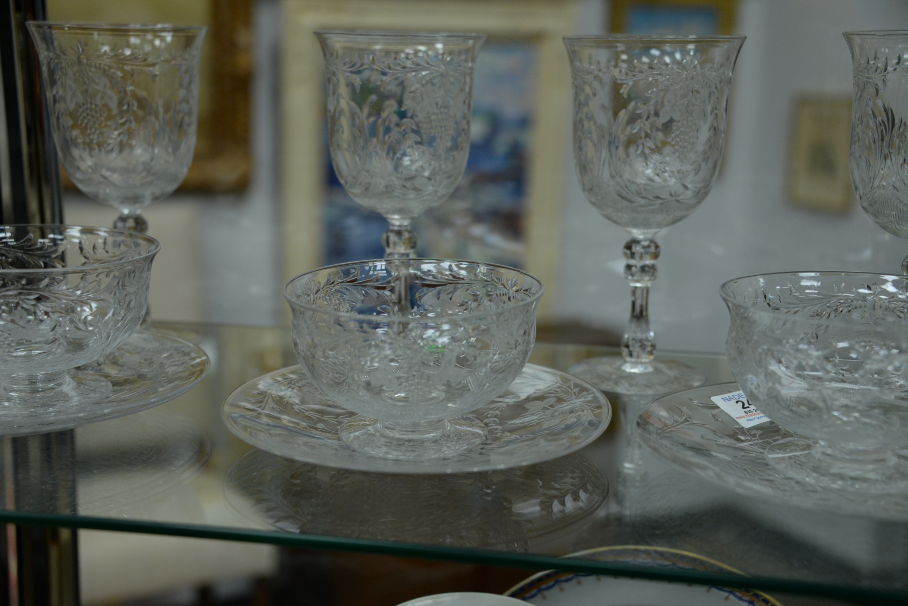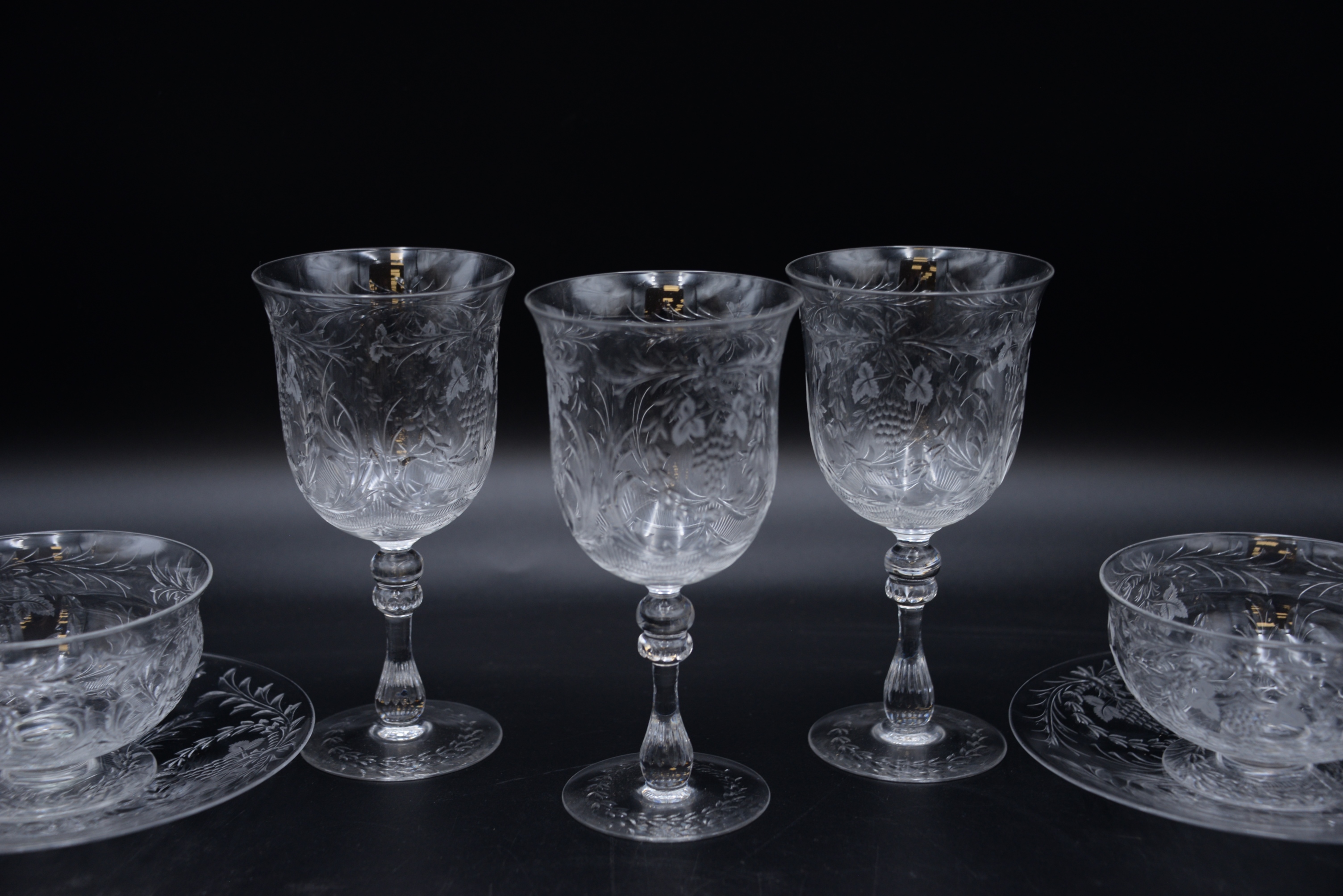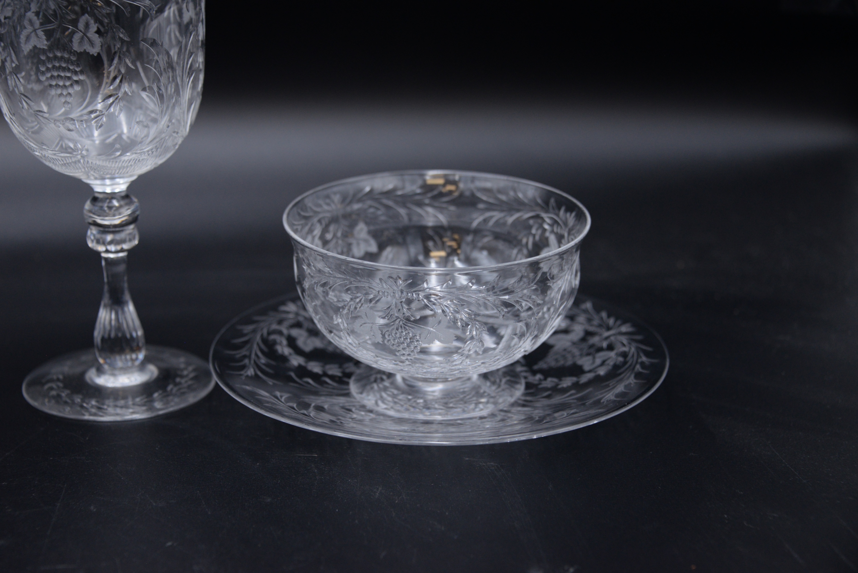 50 Piece Tudor Crystal Set, to include 12 stemmed goblets, height 7 1/2 inches; 12 hors d’oeuvre plates, diameter 7 inches; 12 footed finger bowls, diameter 5 inches; 14 plates; all with vine pattern style tudor, England goblet with top flake.