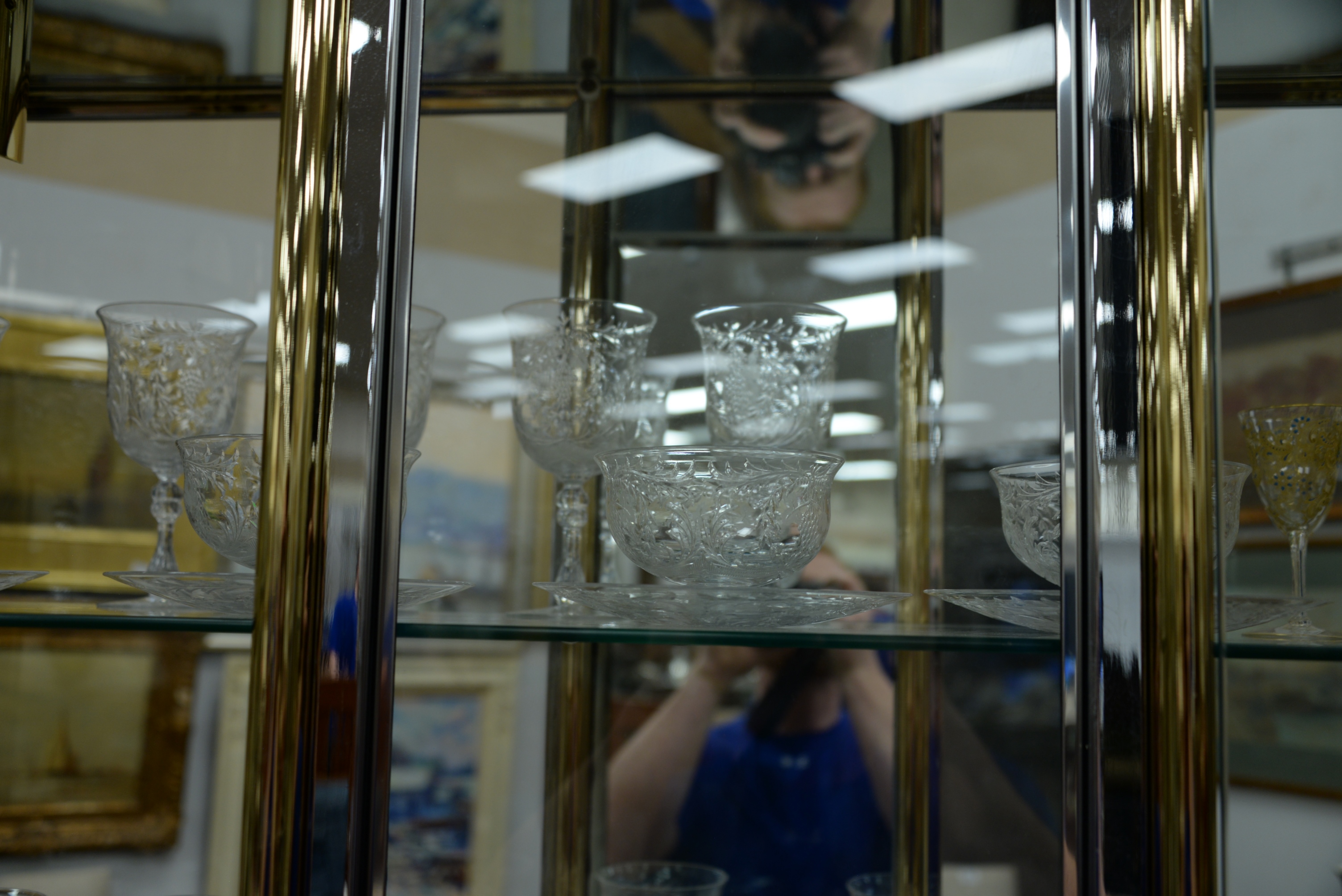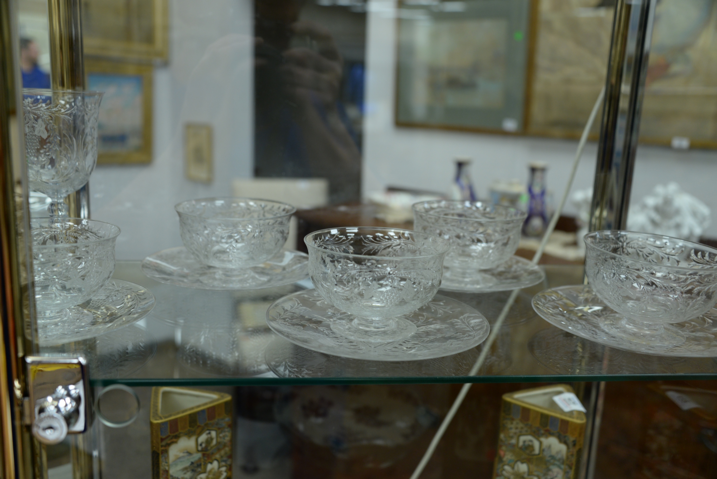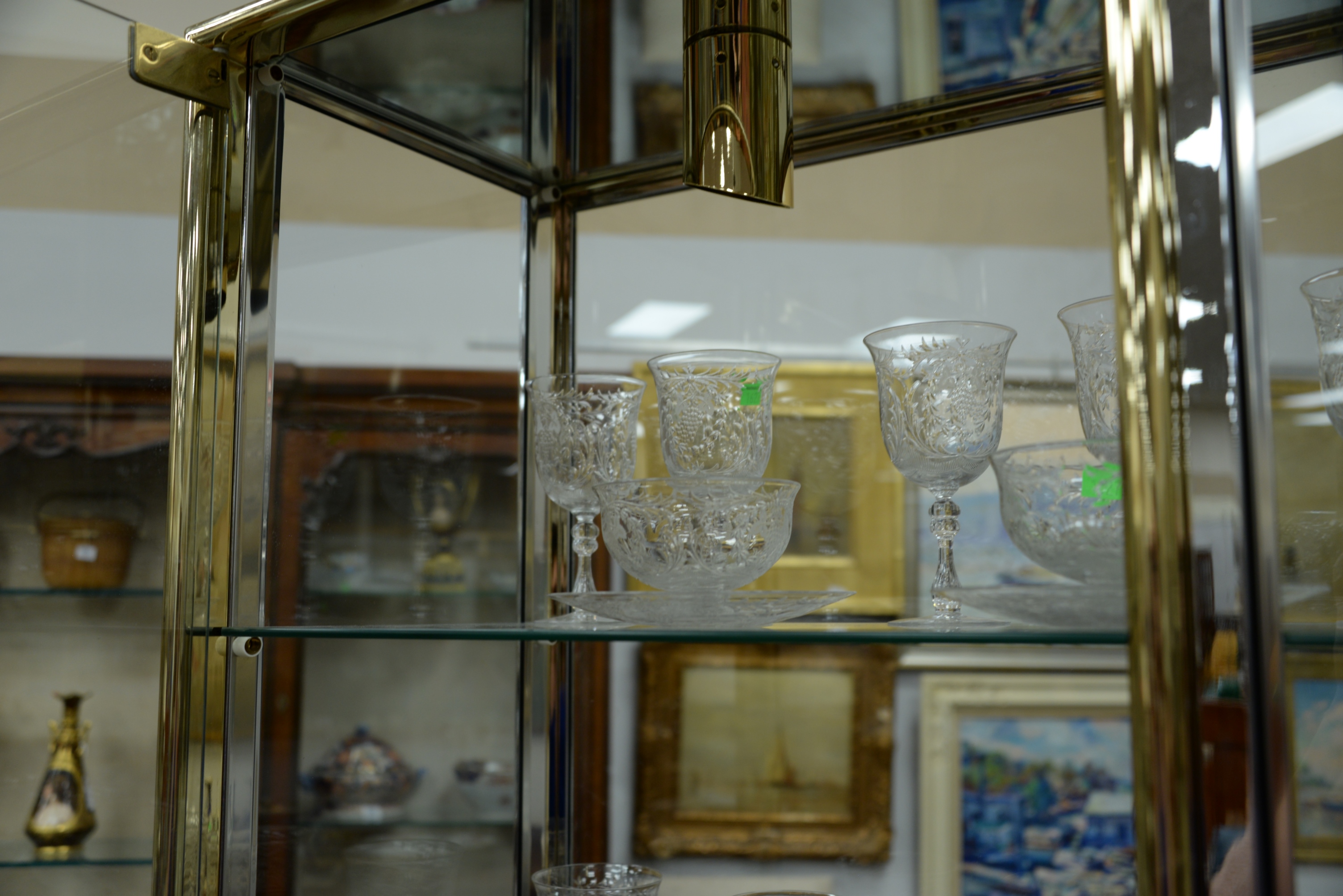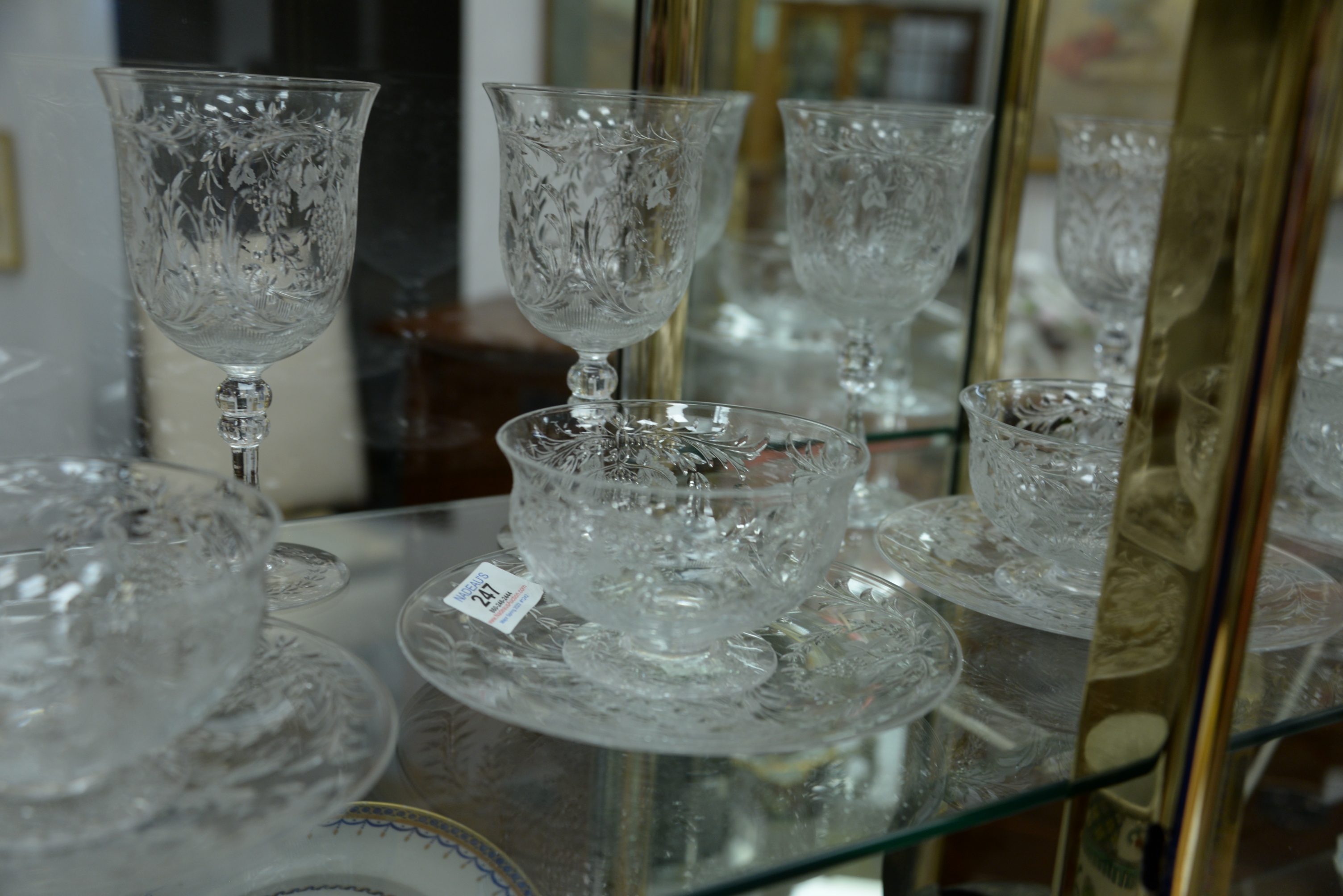 50 Piece Tudor Crystal Set, to include 12 stemmed goblets, height 7 1/2 inches; 12 hors d’oeuvre plates, diameter 7 inches; 12 footed finger bowls, diameter 5 inches; 14 plates; all with vine pattern style tudor, England goblet with top flake.