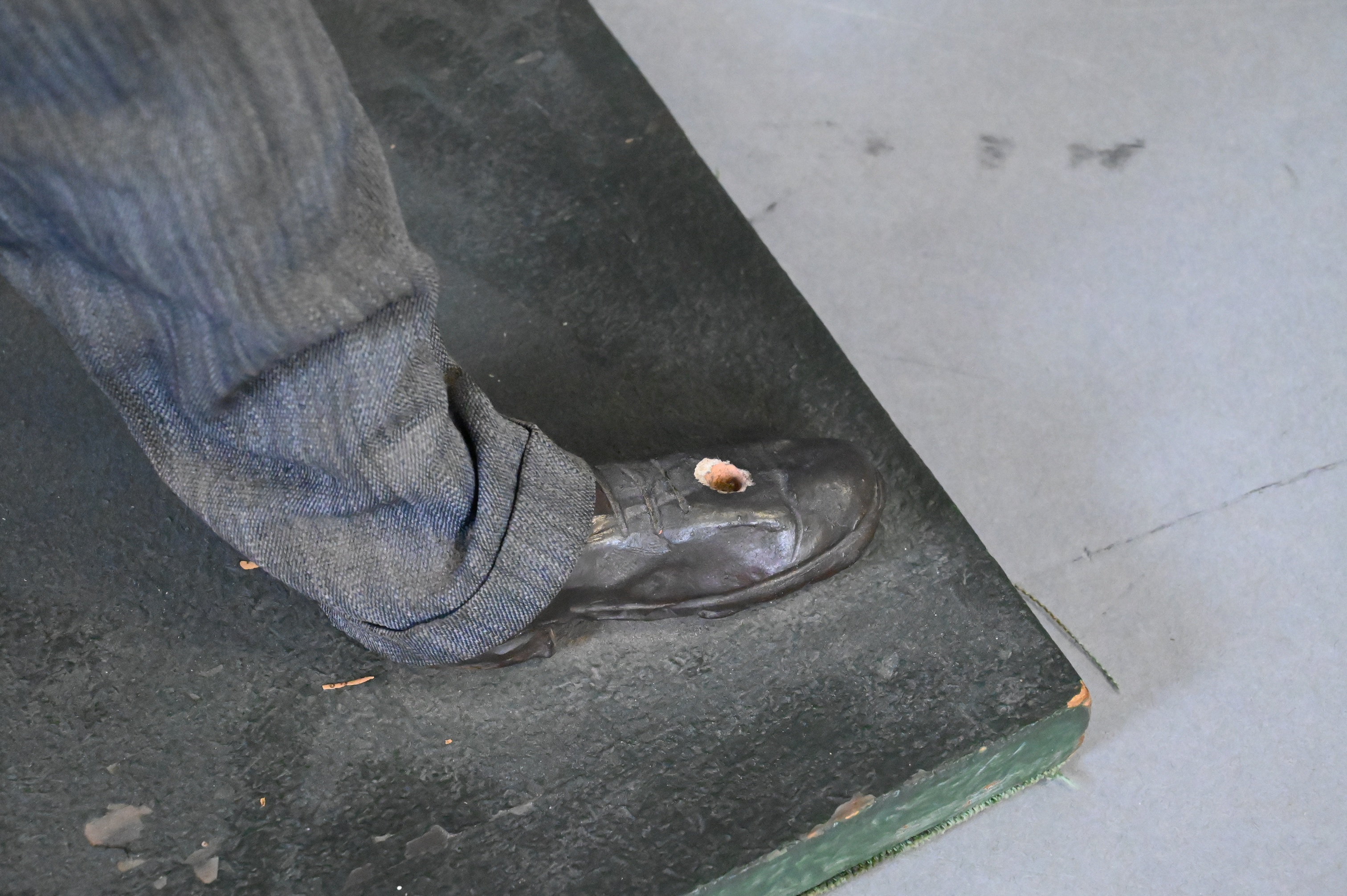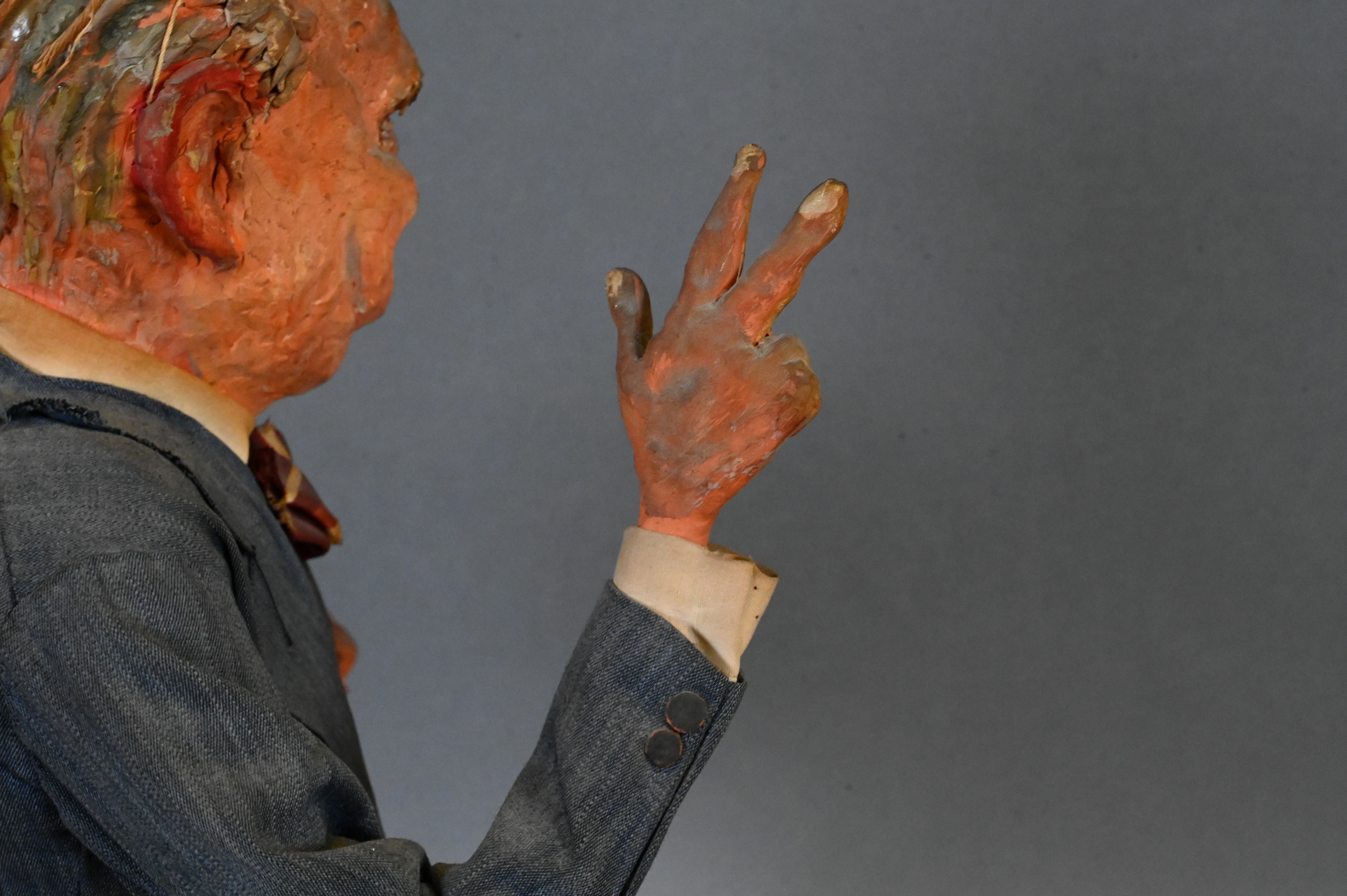 20th century, shown in a humorous caricature style with exaggerated facial features, dressed in a three-piece pinstripe suit with bow tie and pocket square the figure stands with cane in hand and makes the iconic V-sign gesture closely associated with this leader, painted with textured surface detail and mounted on a rectangular base, minor wear and paint losses consistent with age
