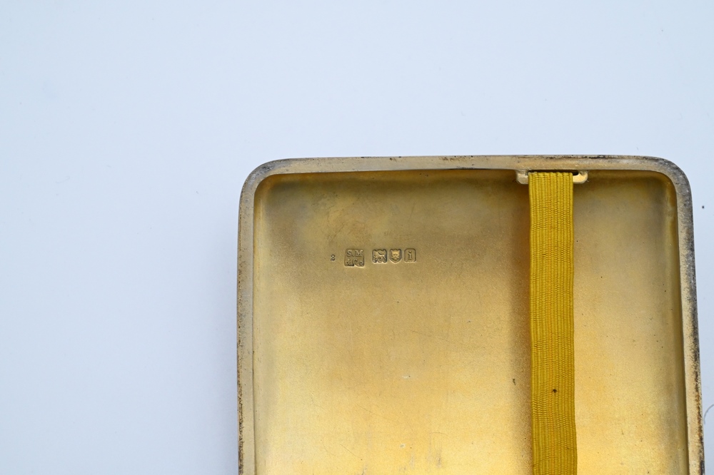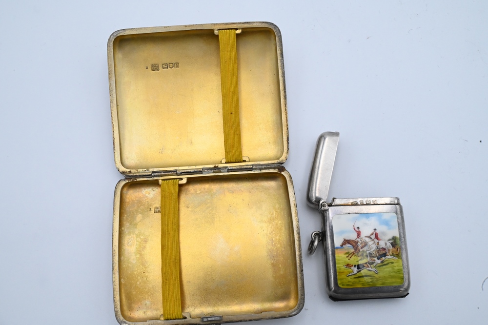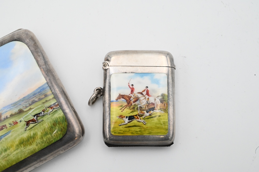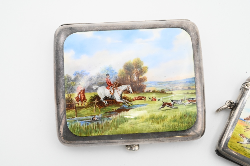 English Sterling Silver Two Piece Enameled Smoking Set, to include a cigarette case and match case, each enameled with fox hunt, largest 2 3/4 x 3 1/4 inches, 5 t.oz. Provenance: Collection of Anton Peek previously from the Hague.