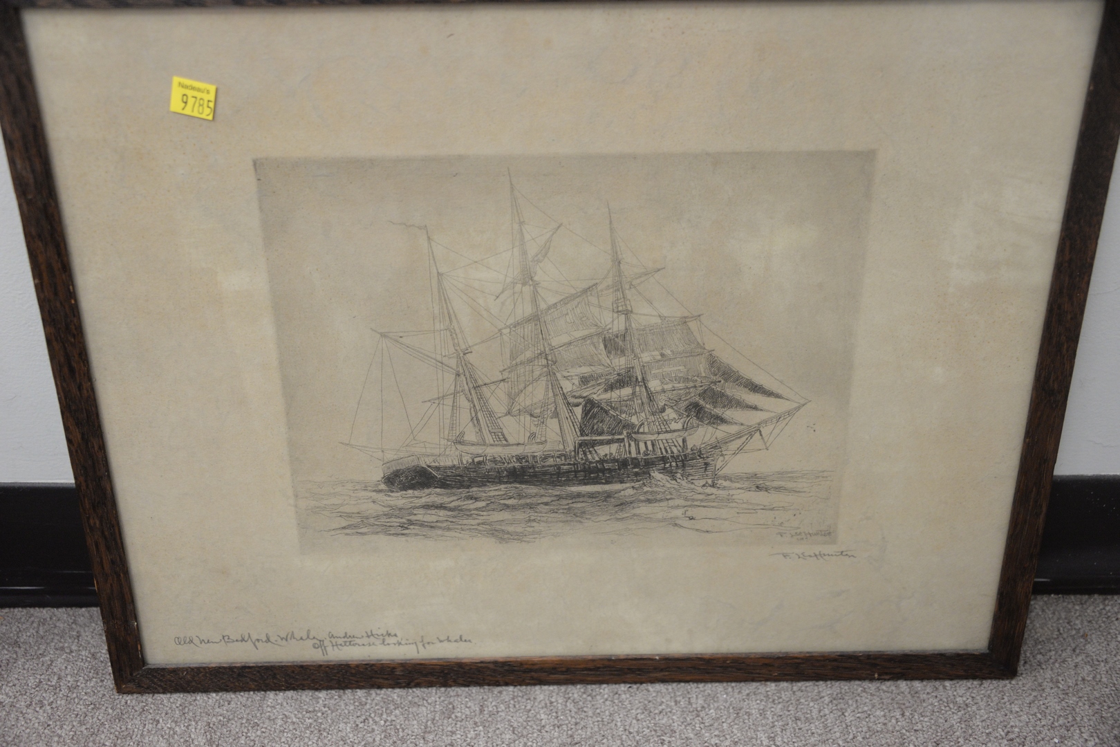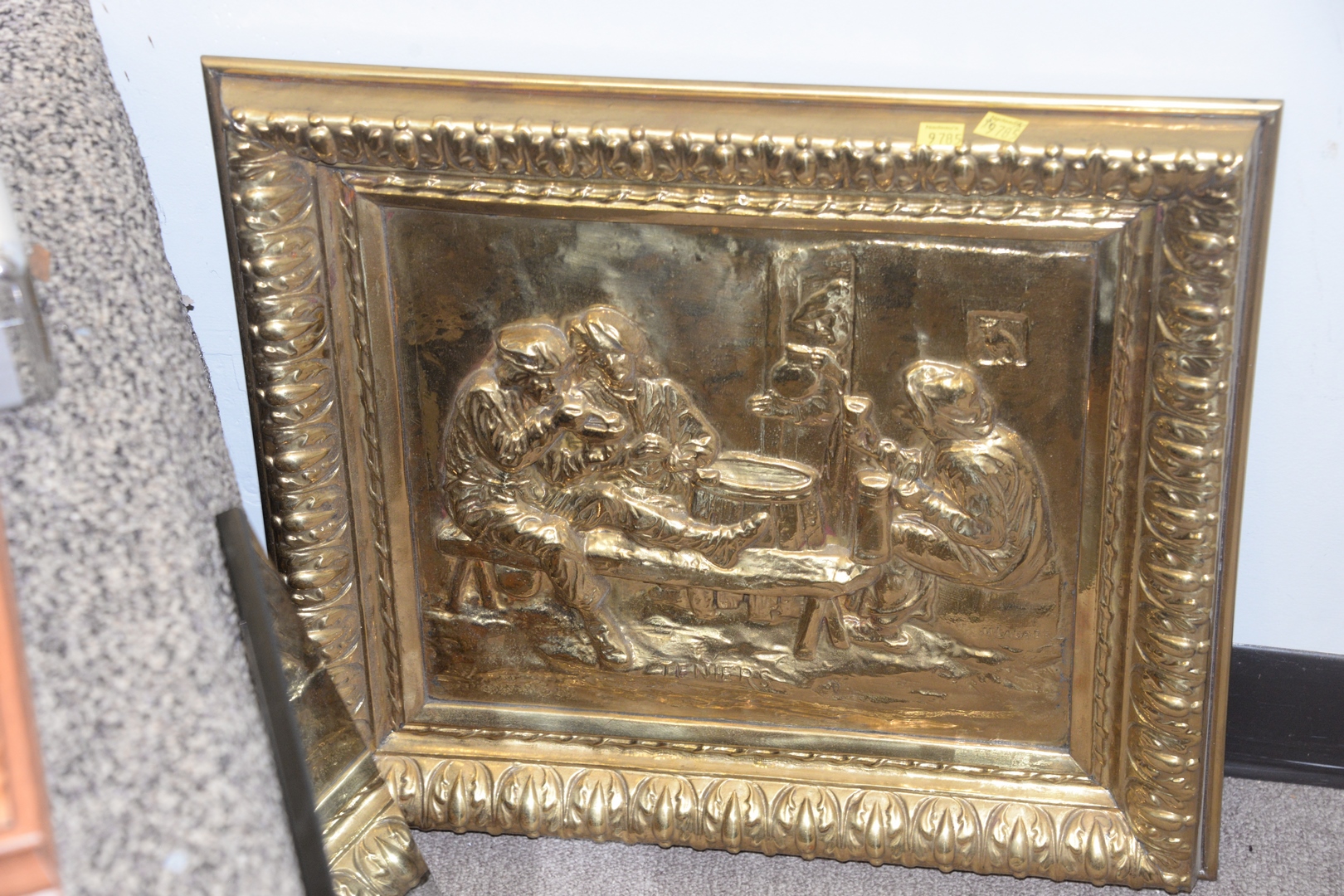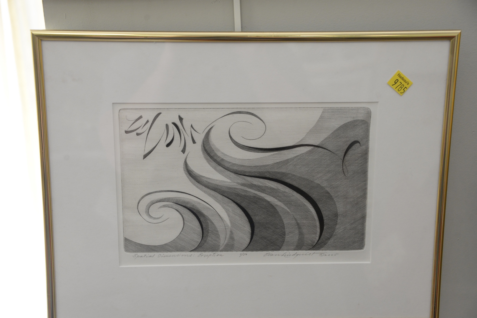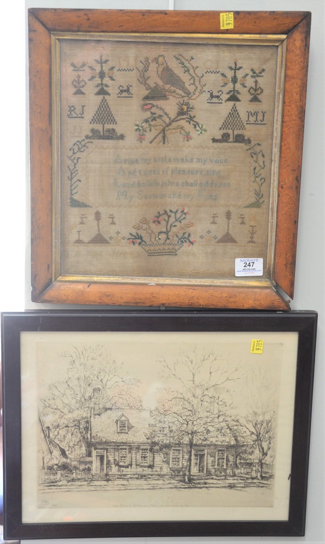 Lot 247: Five Piece Group, to include a framed needlepoint school sampler with a prayer and a bird; a brass relief wall hanging after David Teniers the Younger; Old “New Bedford Whaler” etching on paper, signed in pencil; “Hugh Mercer’s Apothecary Shop – Fredericksburg, VA” by E.D. Roth, etching on paper; along with a contemporary engraving “Spatial Dimensions: Eruption”, signed, dated, titled, and editioned in pencil along the lower margin.