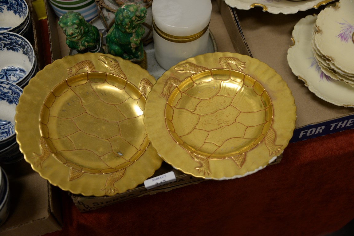 Lot 247: Four box lots to include gilt turtle plates, cameo porcelain set, Bristol glass vase, Mid-Eastern dish, etc.
