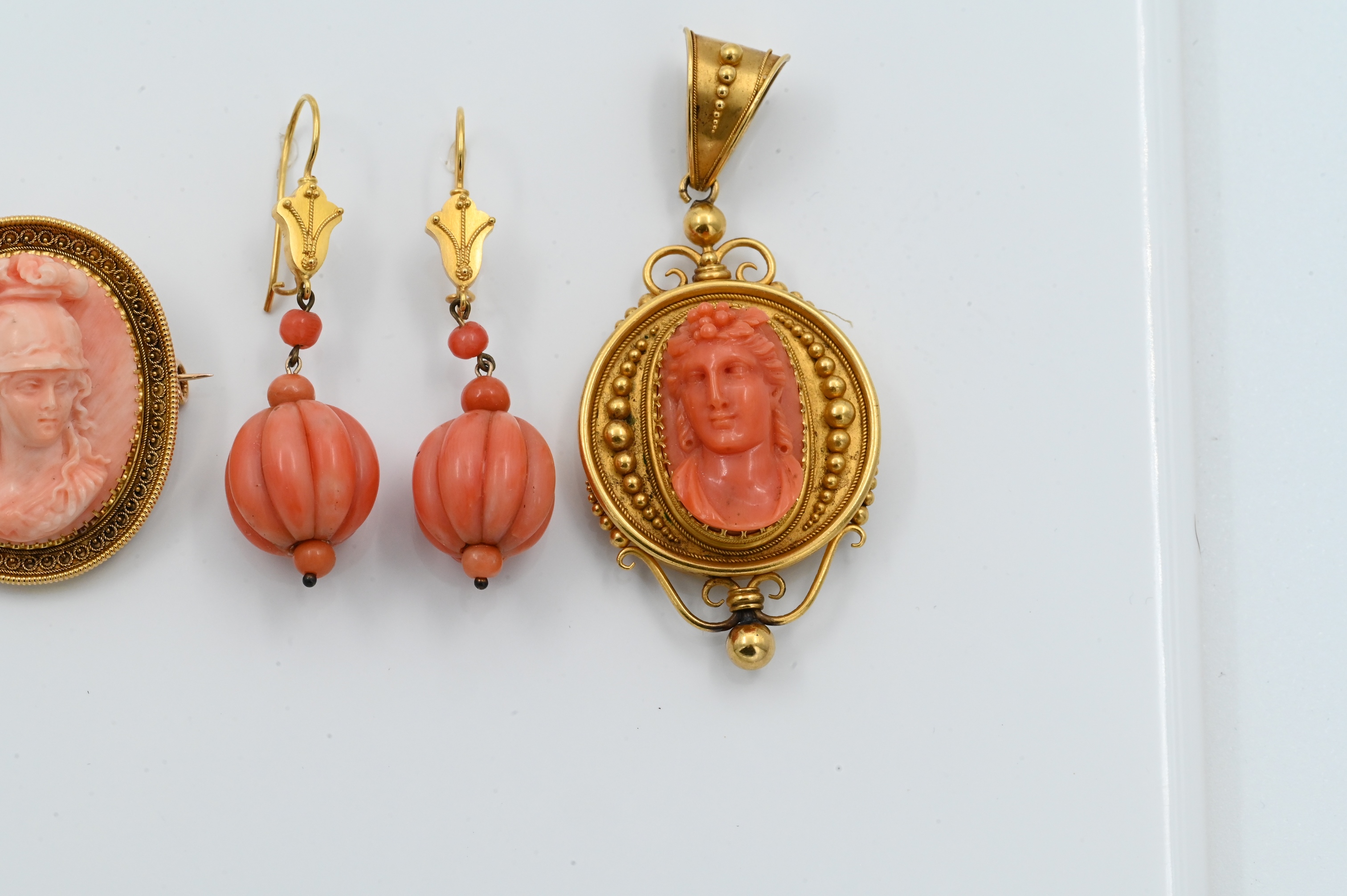 and 14K gold and coral cameo brooch,