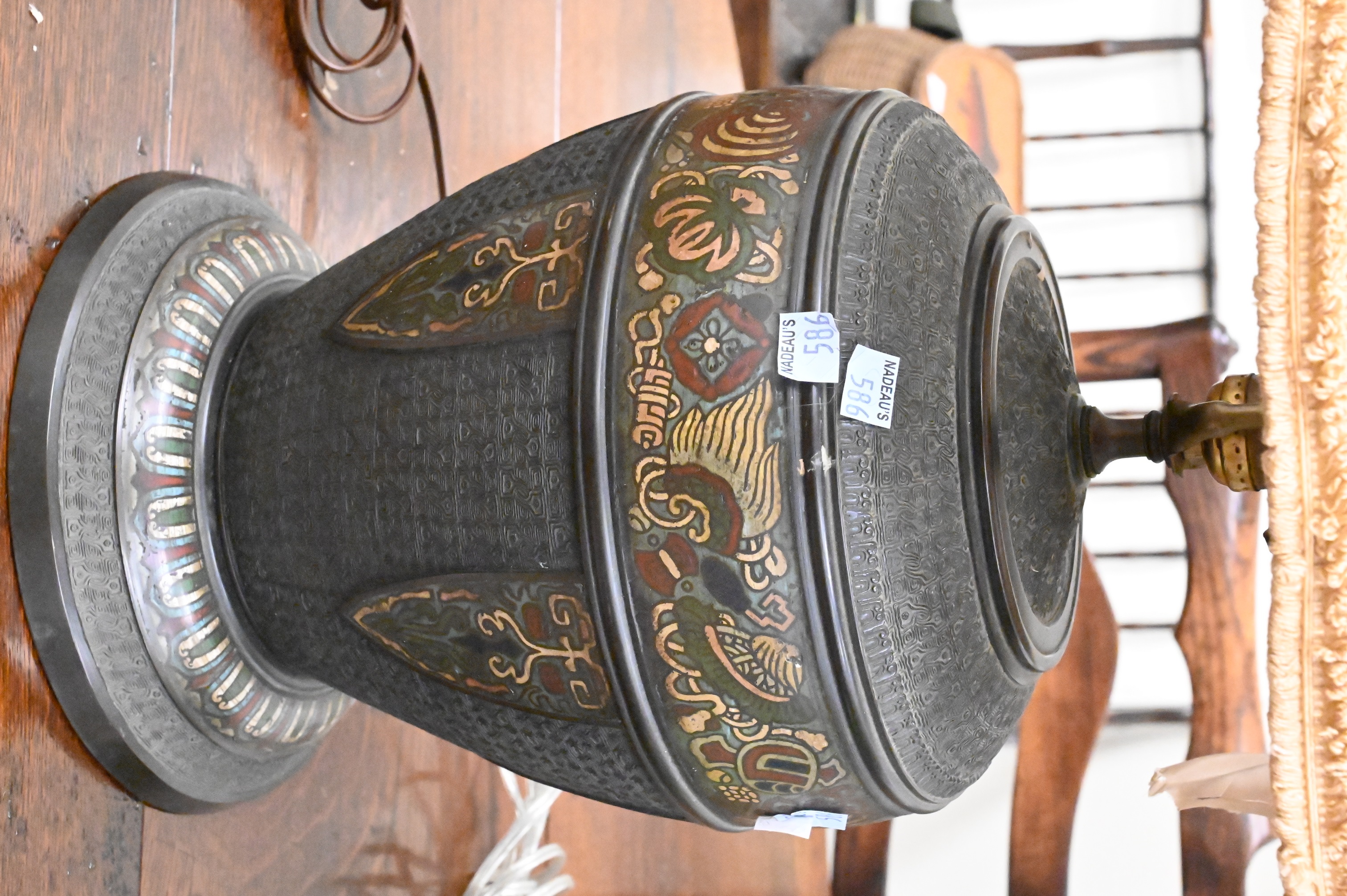to include Champleve, figural pair of tole jars made into lamps, etcetera