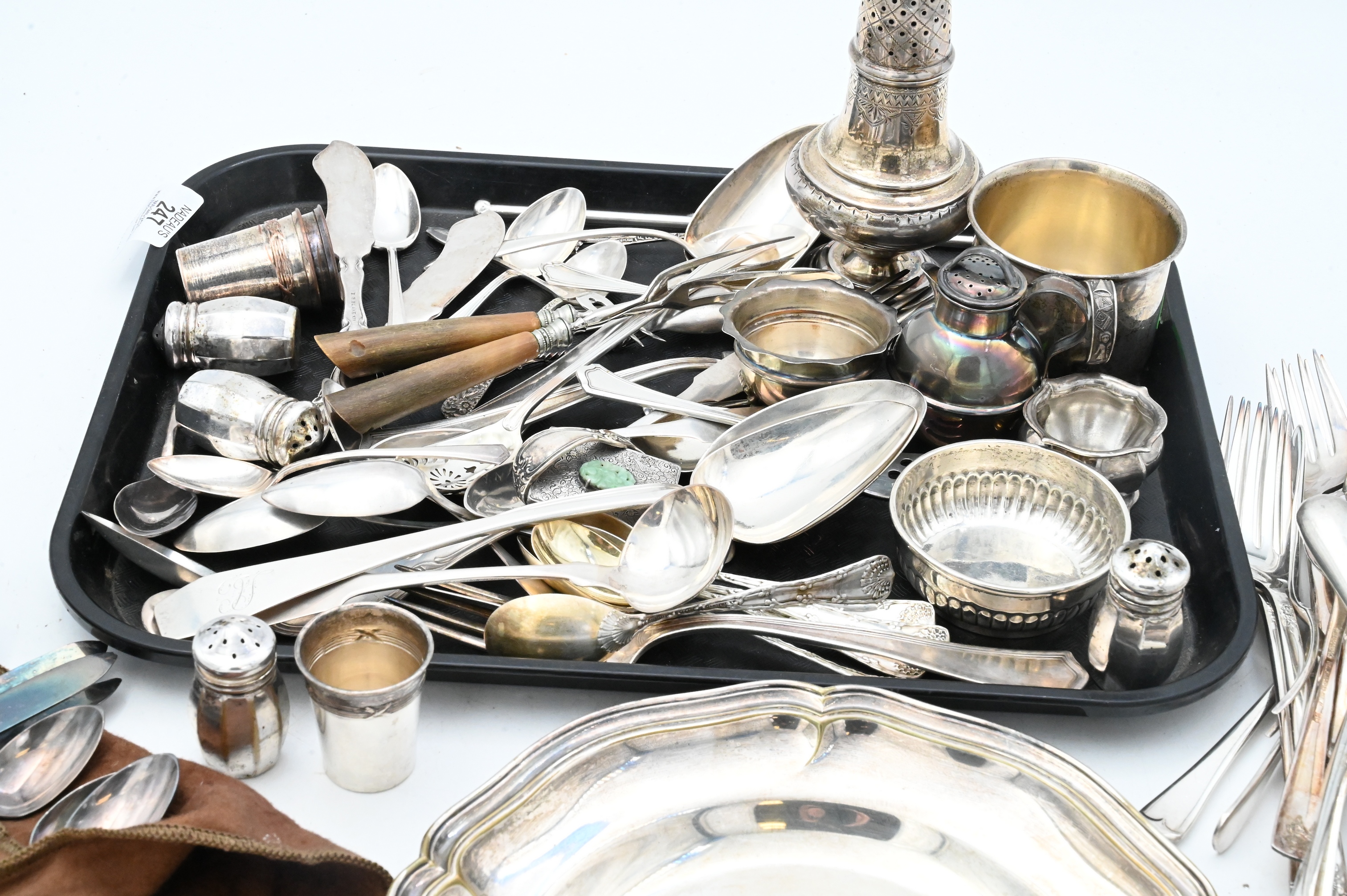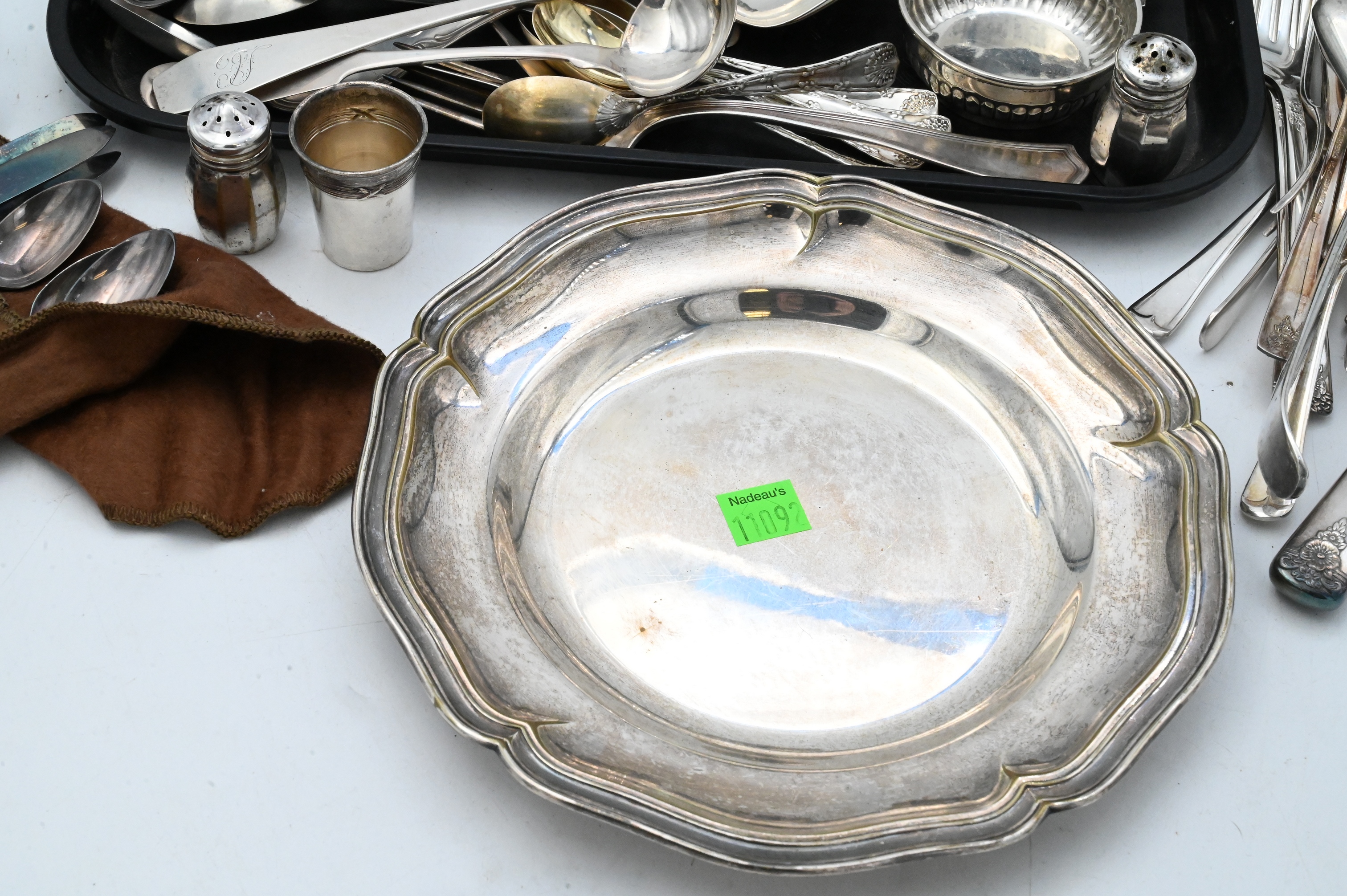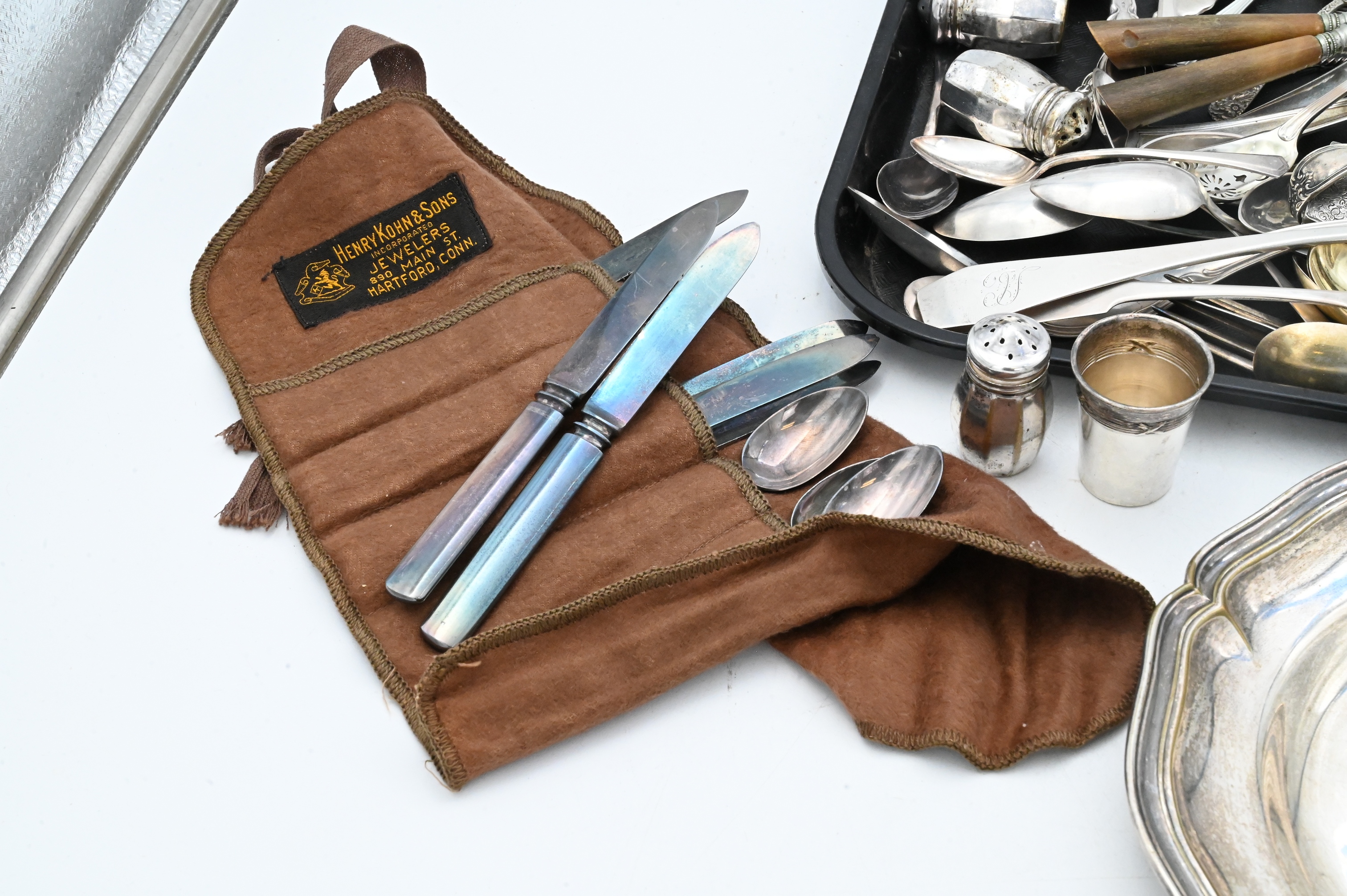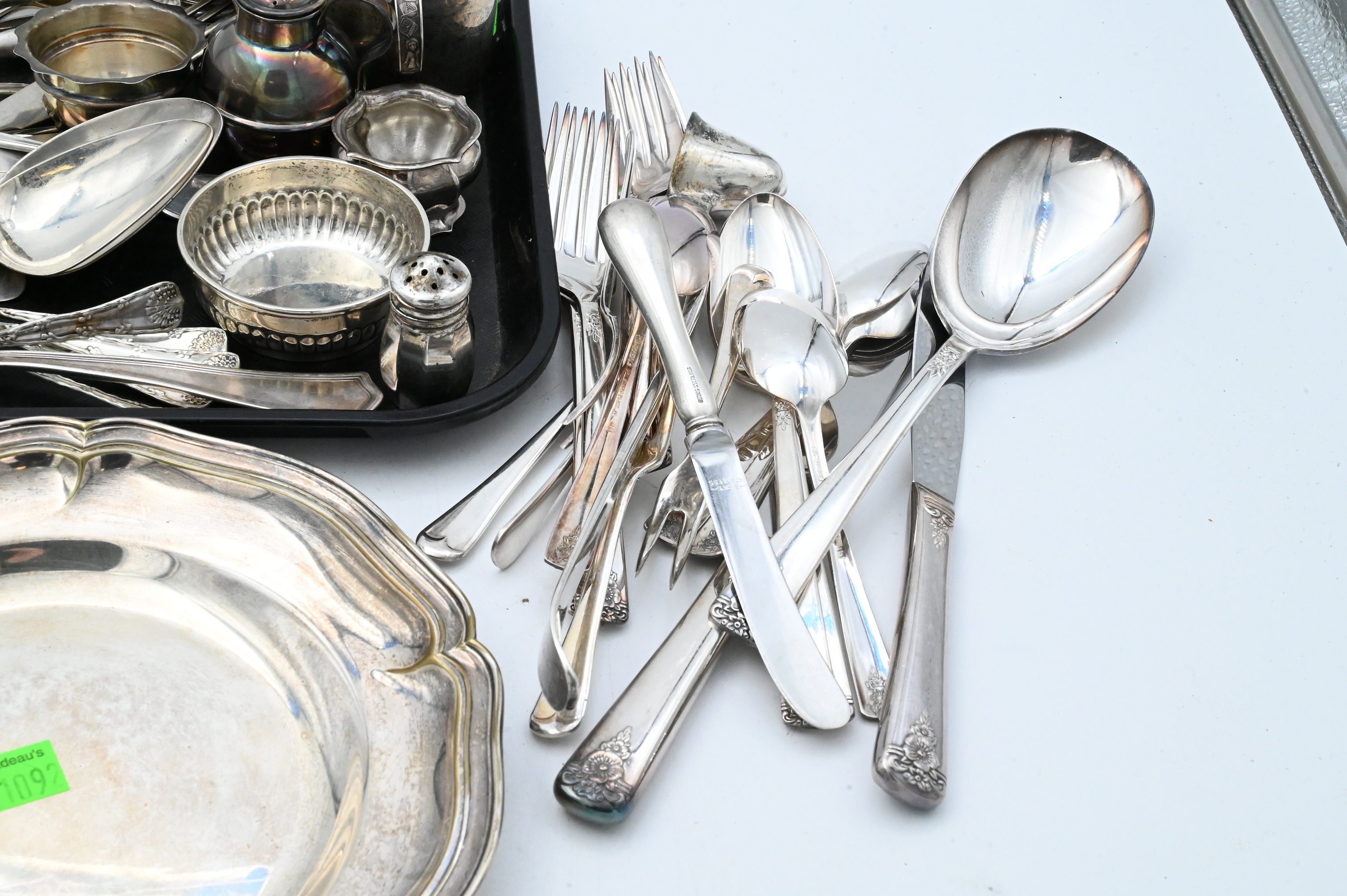 to include two large spoons, one ladle, and six coin silver spoons, with various sterling flatware and salts, plus one weighted knife, together with silver plate
