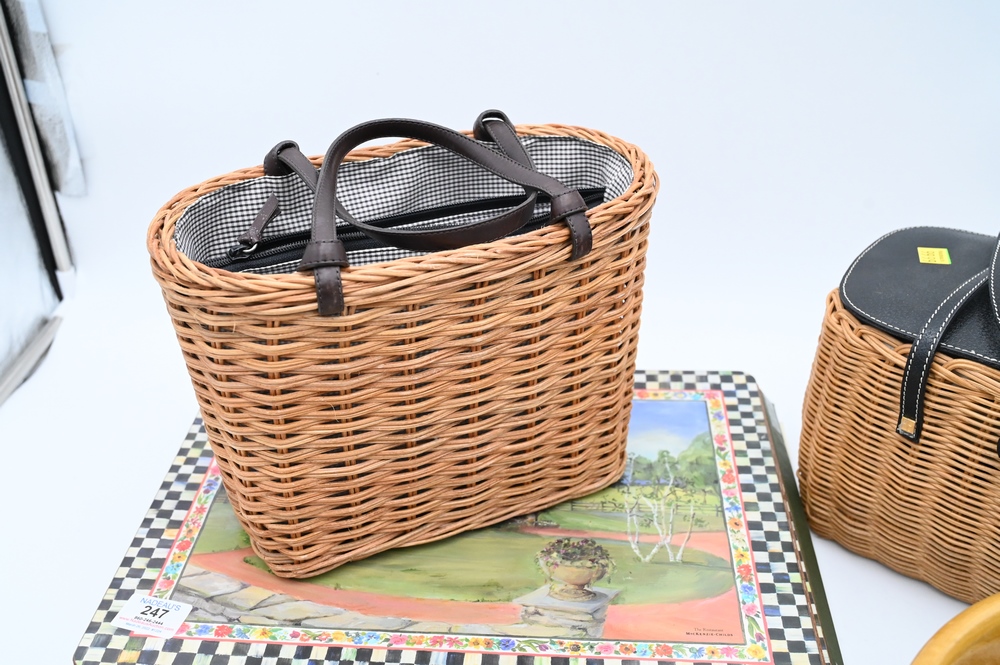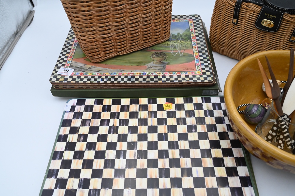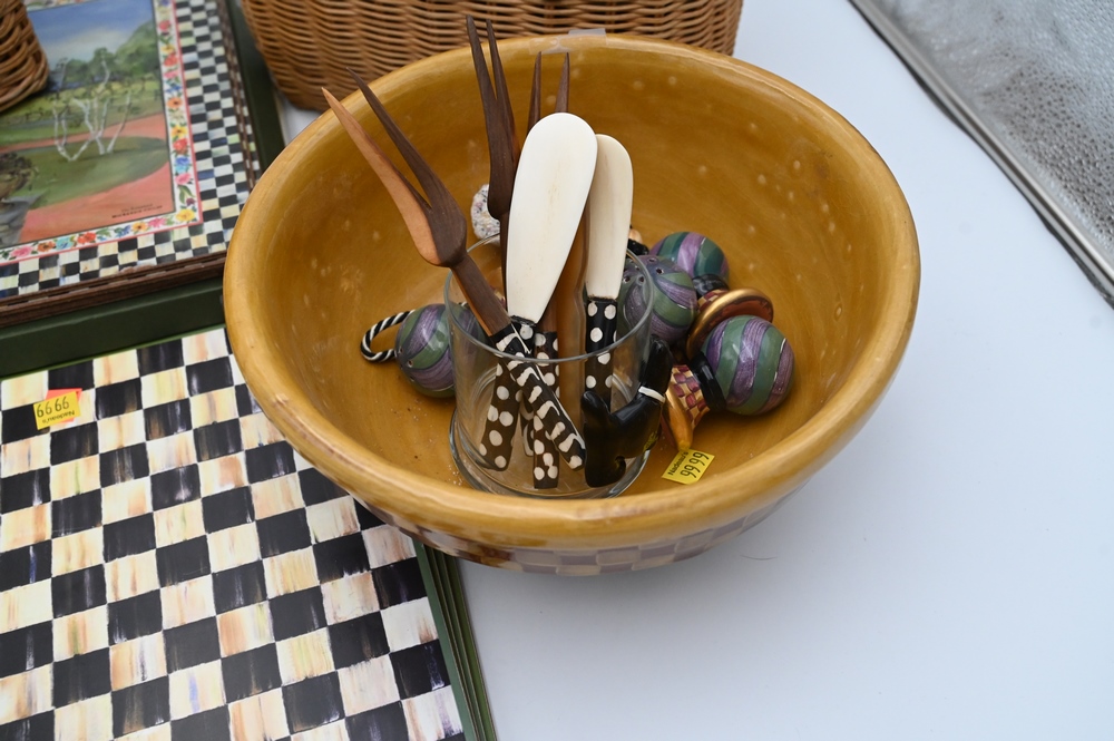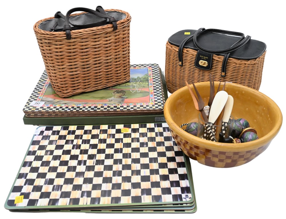 Large Group of Mackenzie-Childs, to include a painted redware bowl, 16 placemats of two different patterns, checkered and “The Restaurant”, 5 salt and peppers, 2 Kate Spade wicker purses, glass with dog, along with misc. items.