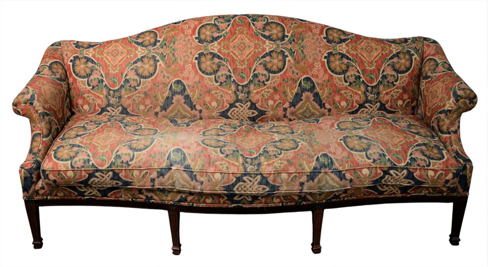 Lot 247: Margolis Federal Style Upholstered Sofa, having serpentine front and camelback, height 37 1/2 inches, length 79 inches.