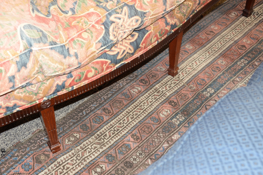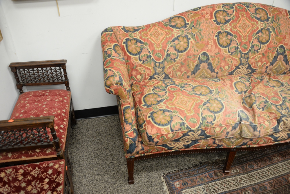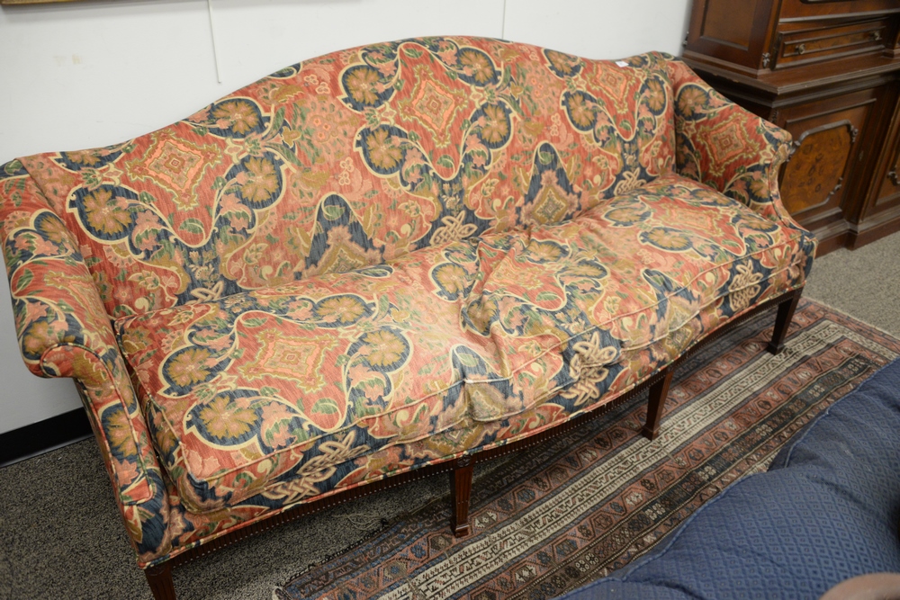 Lot 247: Margolis Federal Style Upholstered Sofa, having serpentine front and camelback, height 37 1/2 inches, length 79 inches.