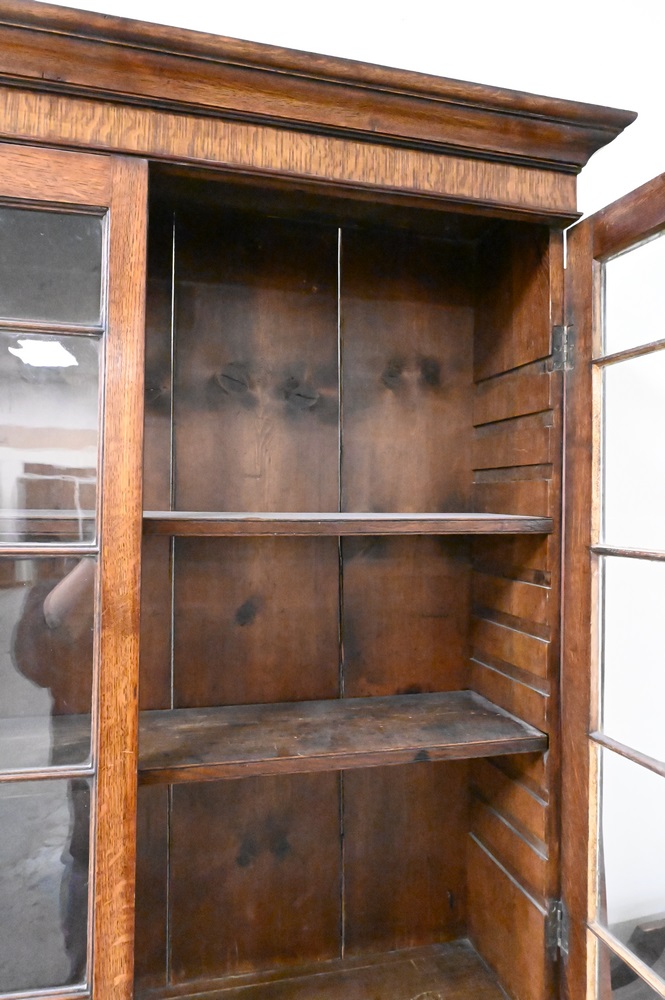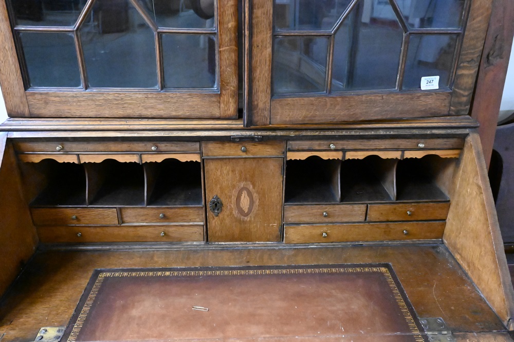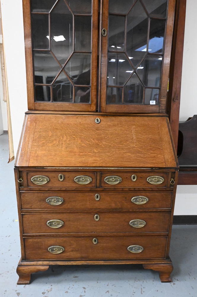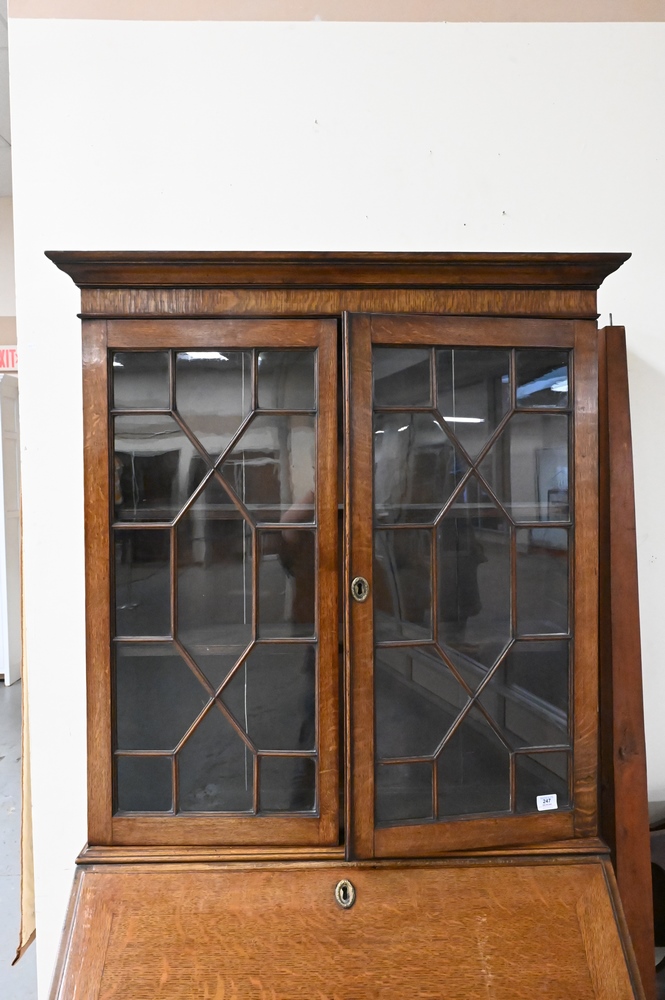 Lot 247: Oak Secretary Desk, in two parts, upper section with two glazed doors, on lower section with slant lid over drawers, all set on ogee feet, England, late 18th/early 19th century, height 83 inches, upper width 36 1/2 inches, depth 22 inches.