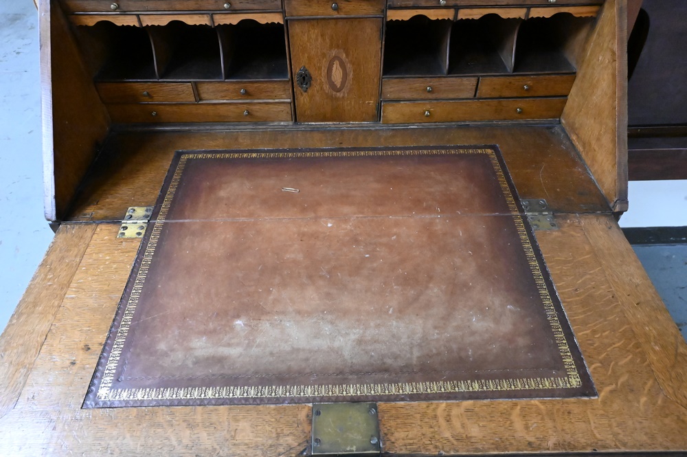 Oak Secretary Desk, in two parts, upper section with two glazed doors, on lower section with slant lid over drawers, all set on ogee feet, England, late 18th/early 19th century, height 83 inches, upper width 36 1/2 inches, depth 22 inches.