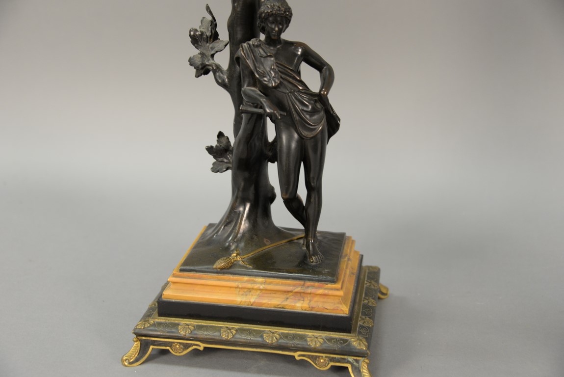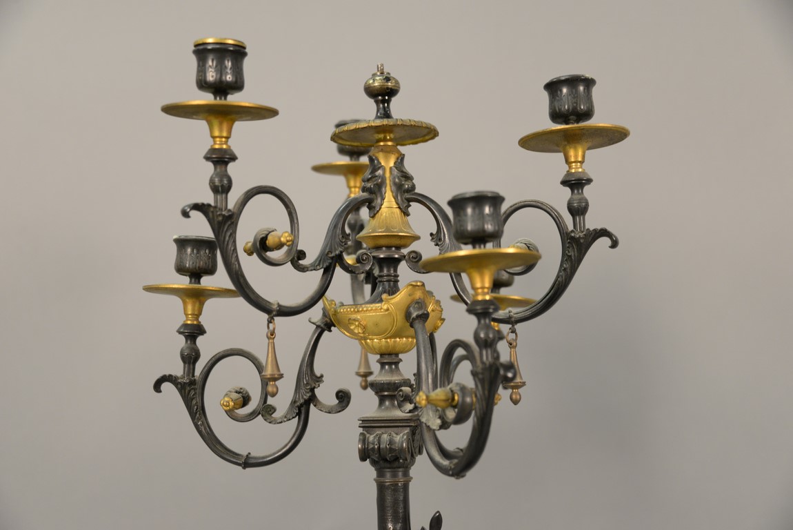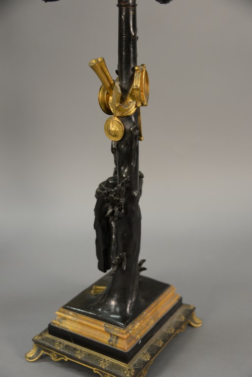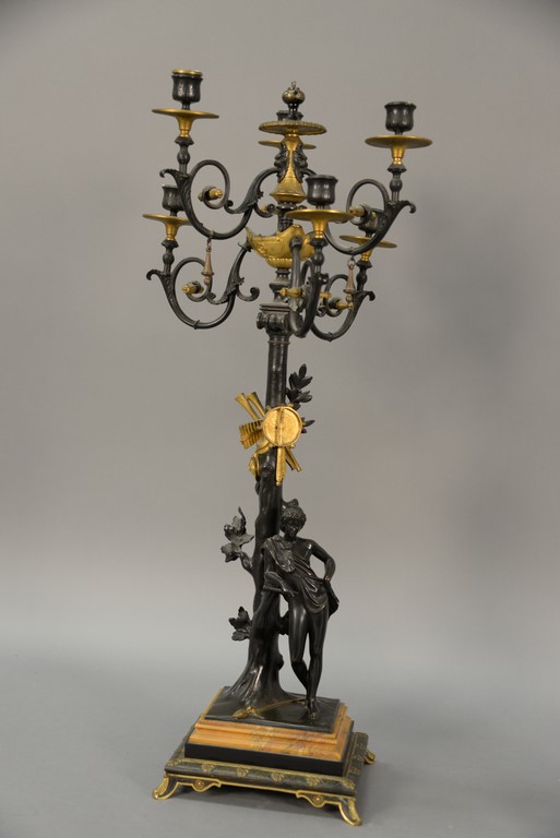 Lot 247: Pair of bronze, gilt bronze, and marble classical figural candelabras, each with six lights