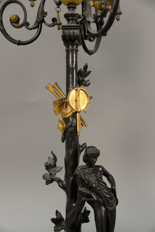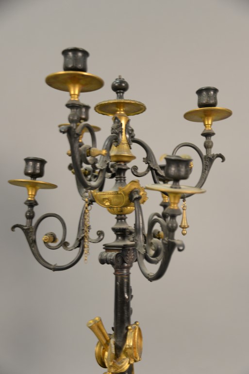 Pair of bronze, gilt bronze, and marble classical figural candelabras, each with six lights. ht. 29in.