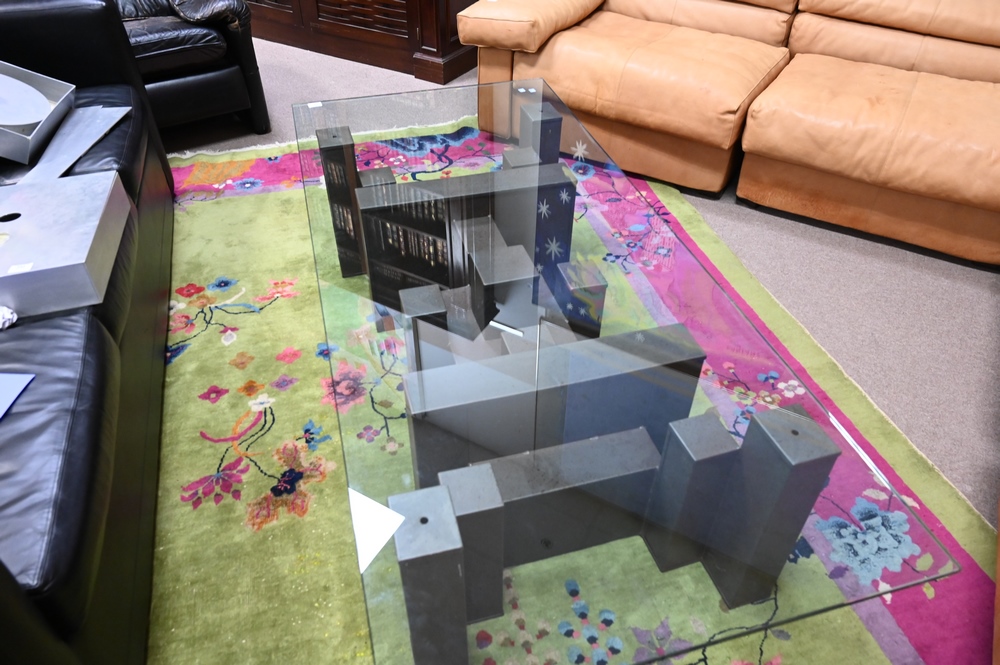 Lot 247: Paul Evan Style Coffee Table, having metal cityscape base with glass top, height 17 1/2 inches, top 31″ x 71″.