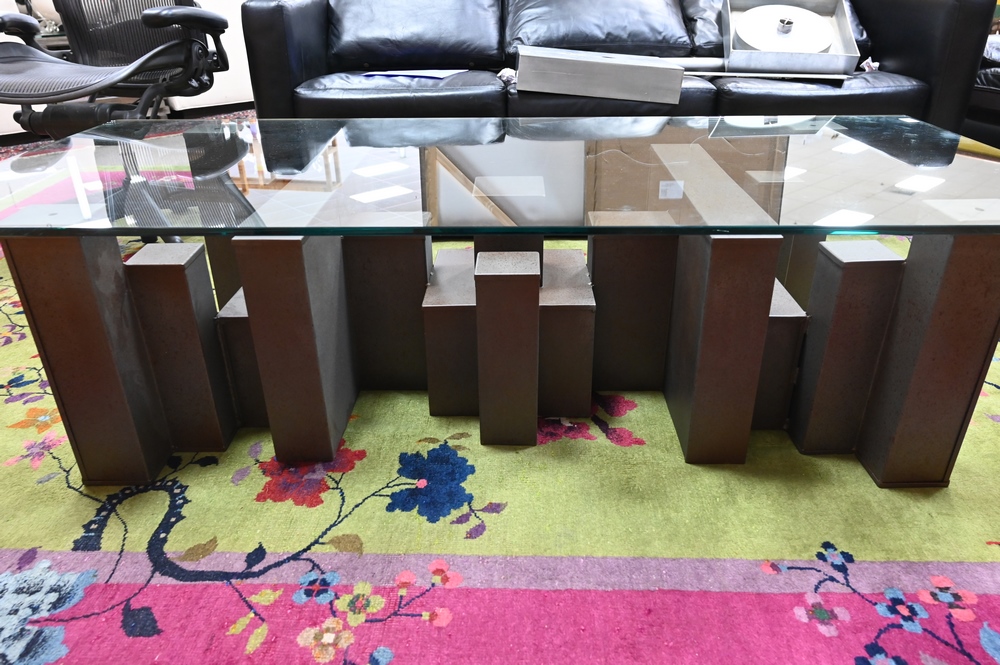 Paul Evan Style Coffee Table, having metal cityscape base with glass top, height 17 1/2 inches, top 31″ x 71″.
