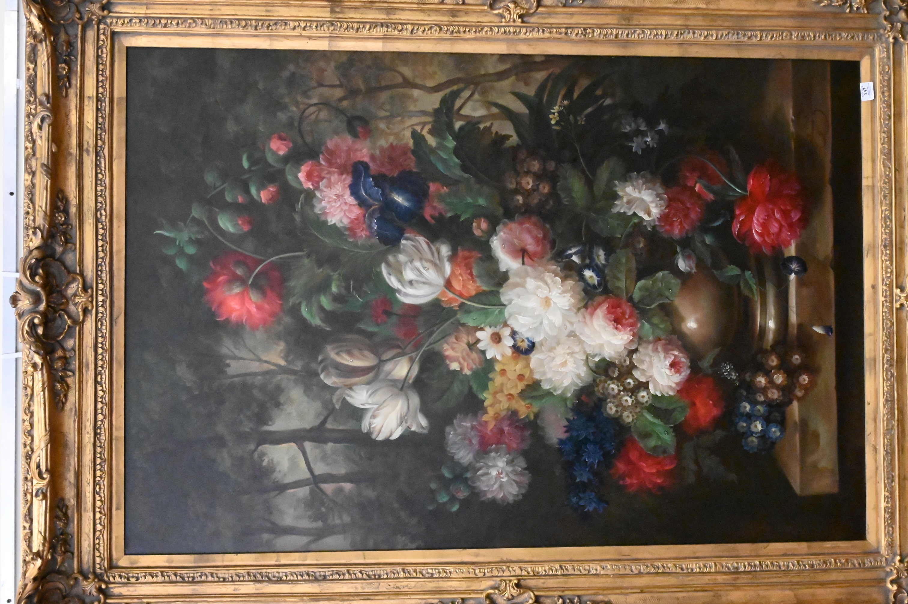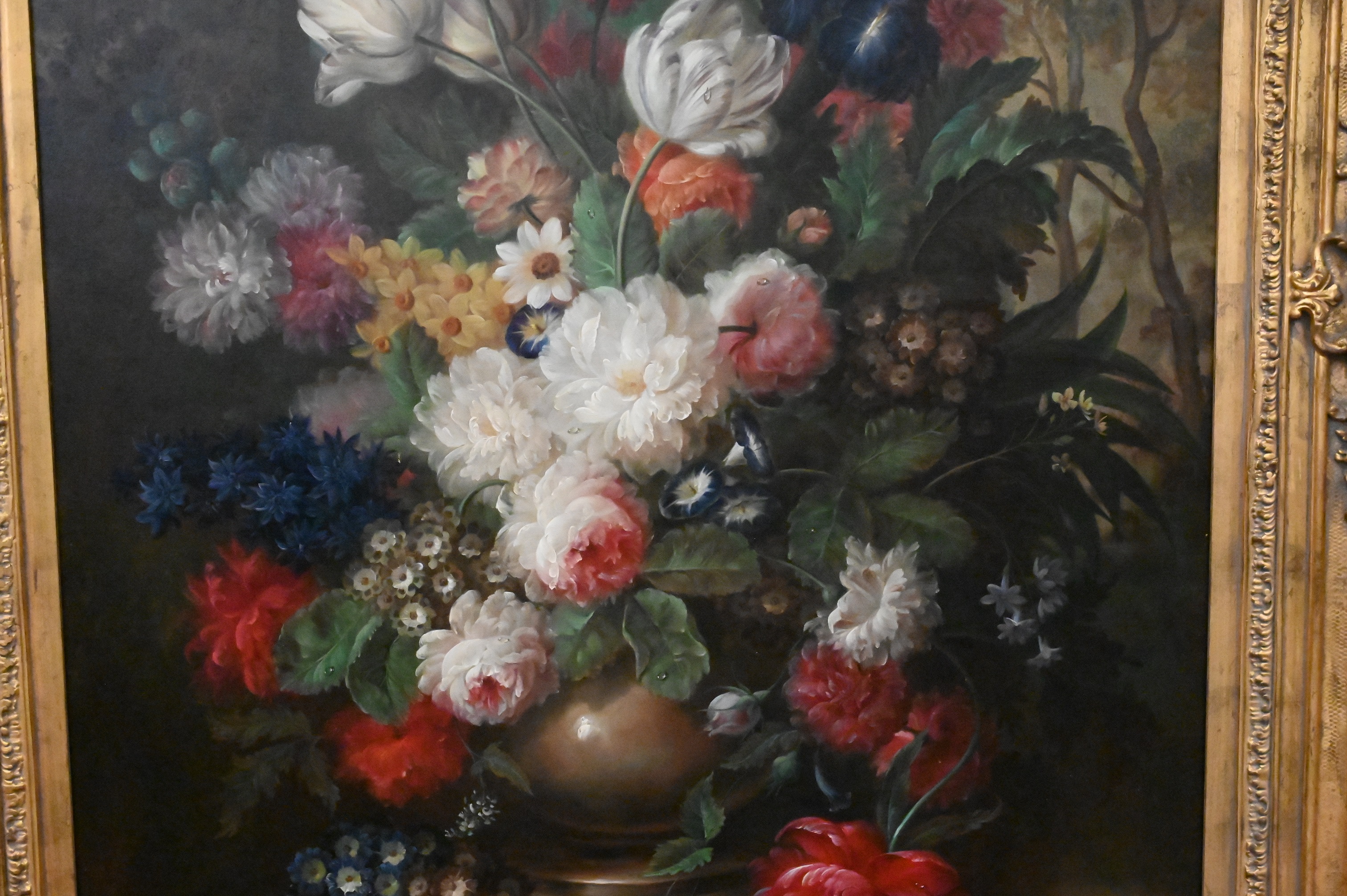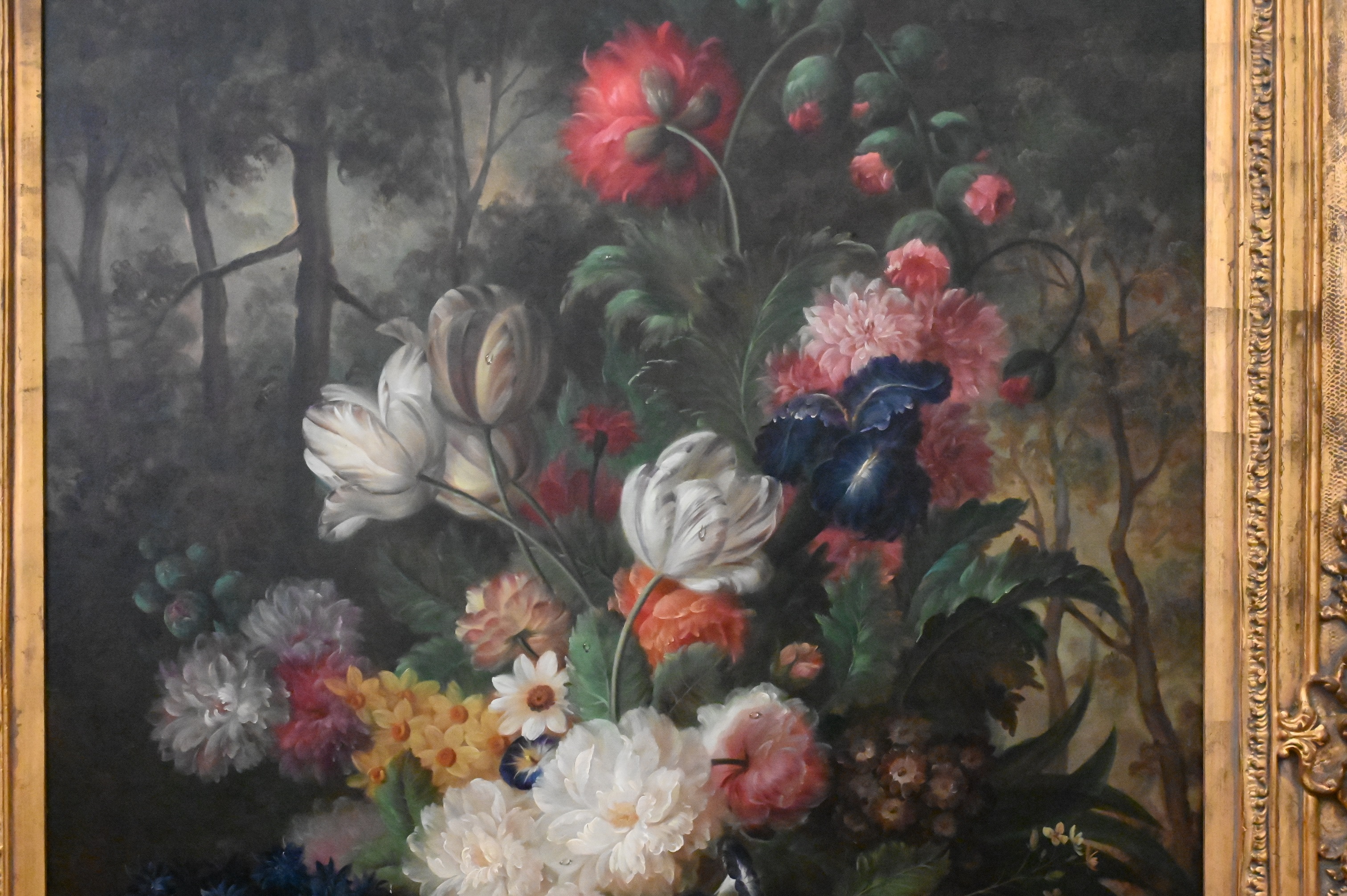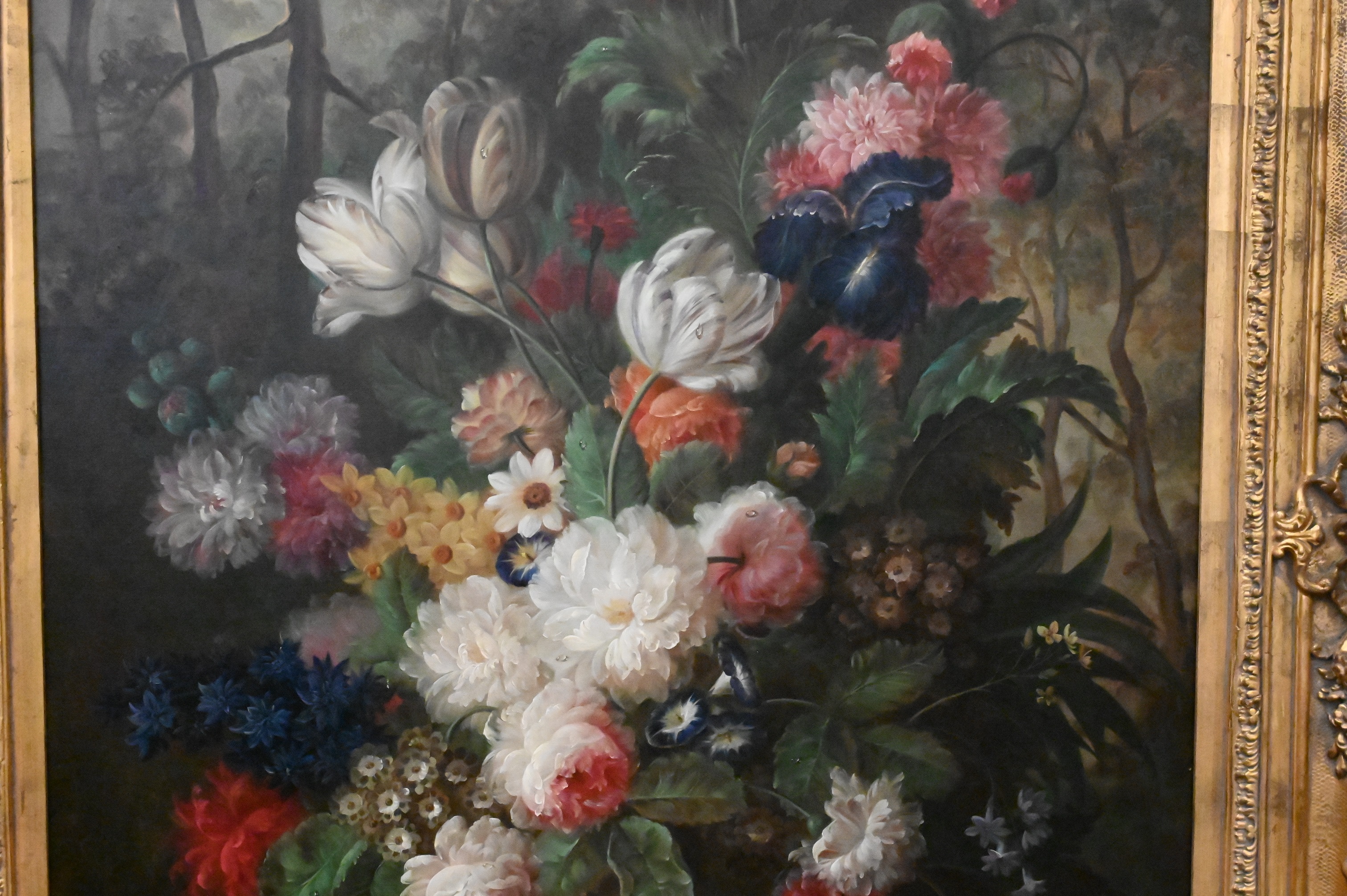 Dutch Style Still Life of Tulips in a forest landscape
