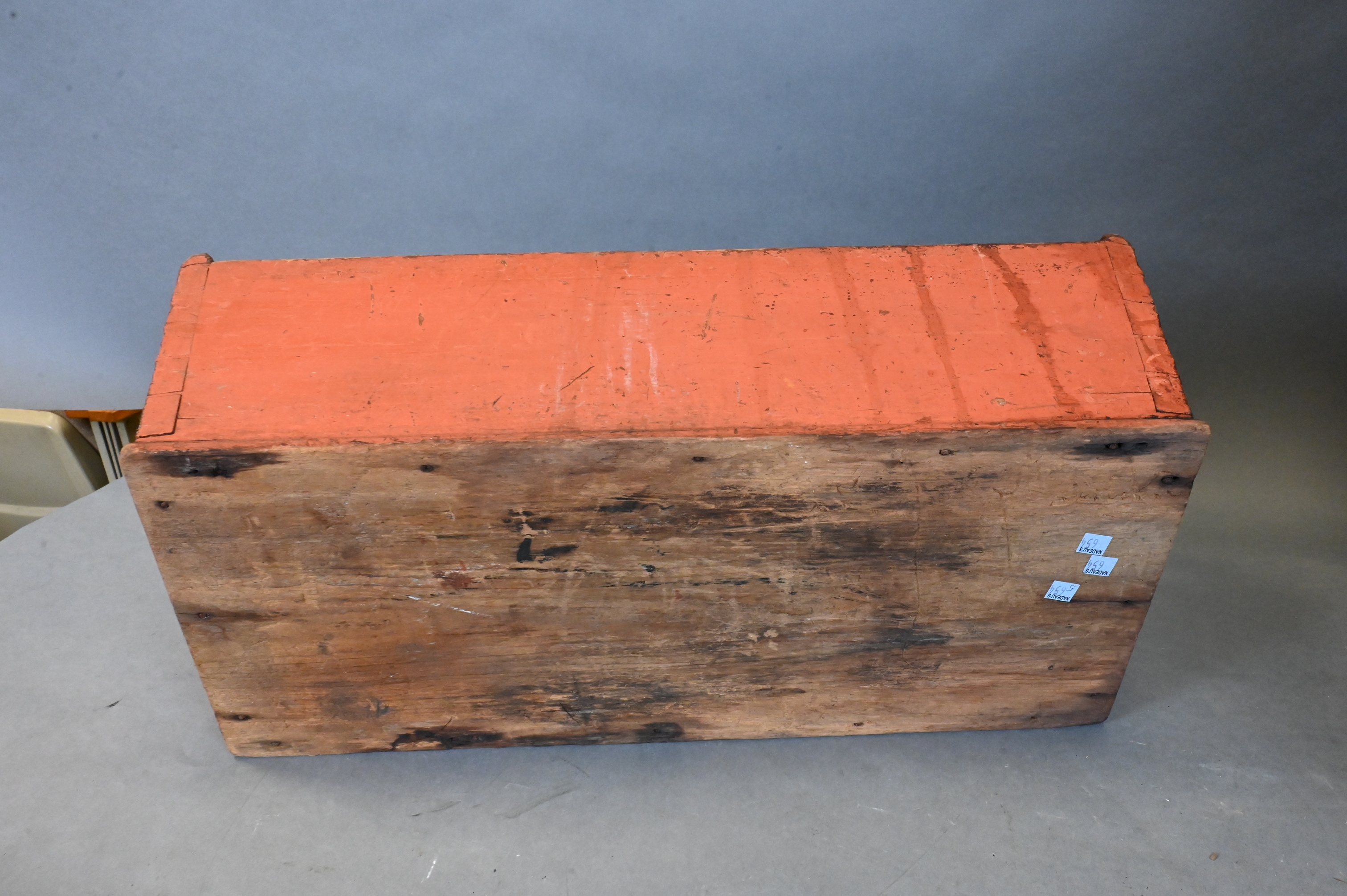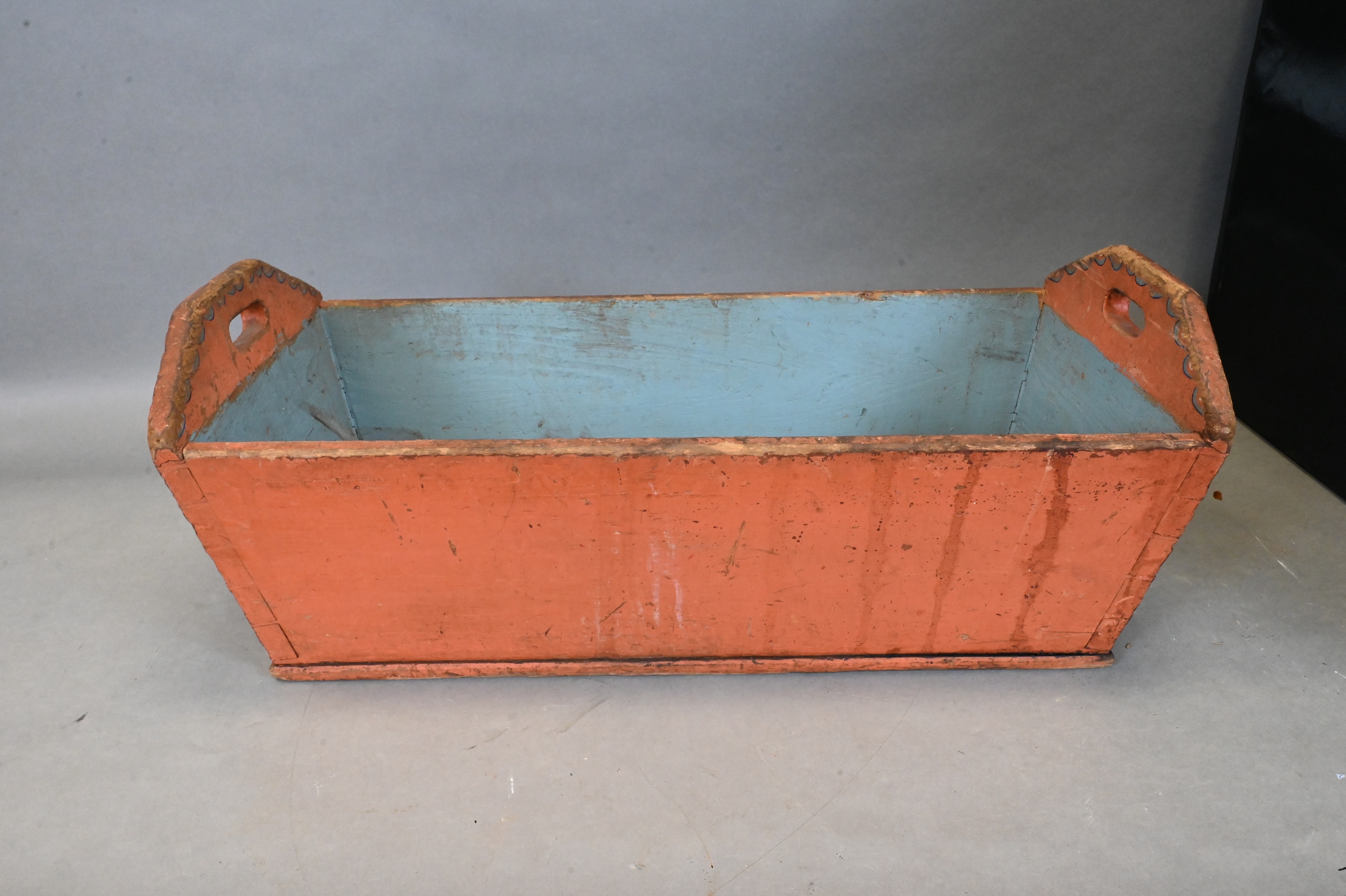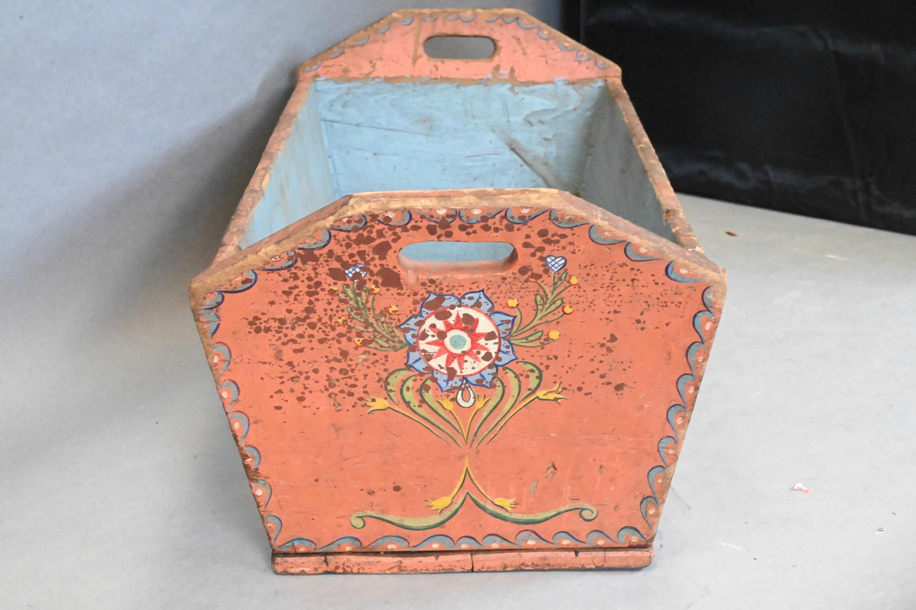 red and blue painted, having flower and heart motif, double handled, possibly baby cradle or open box