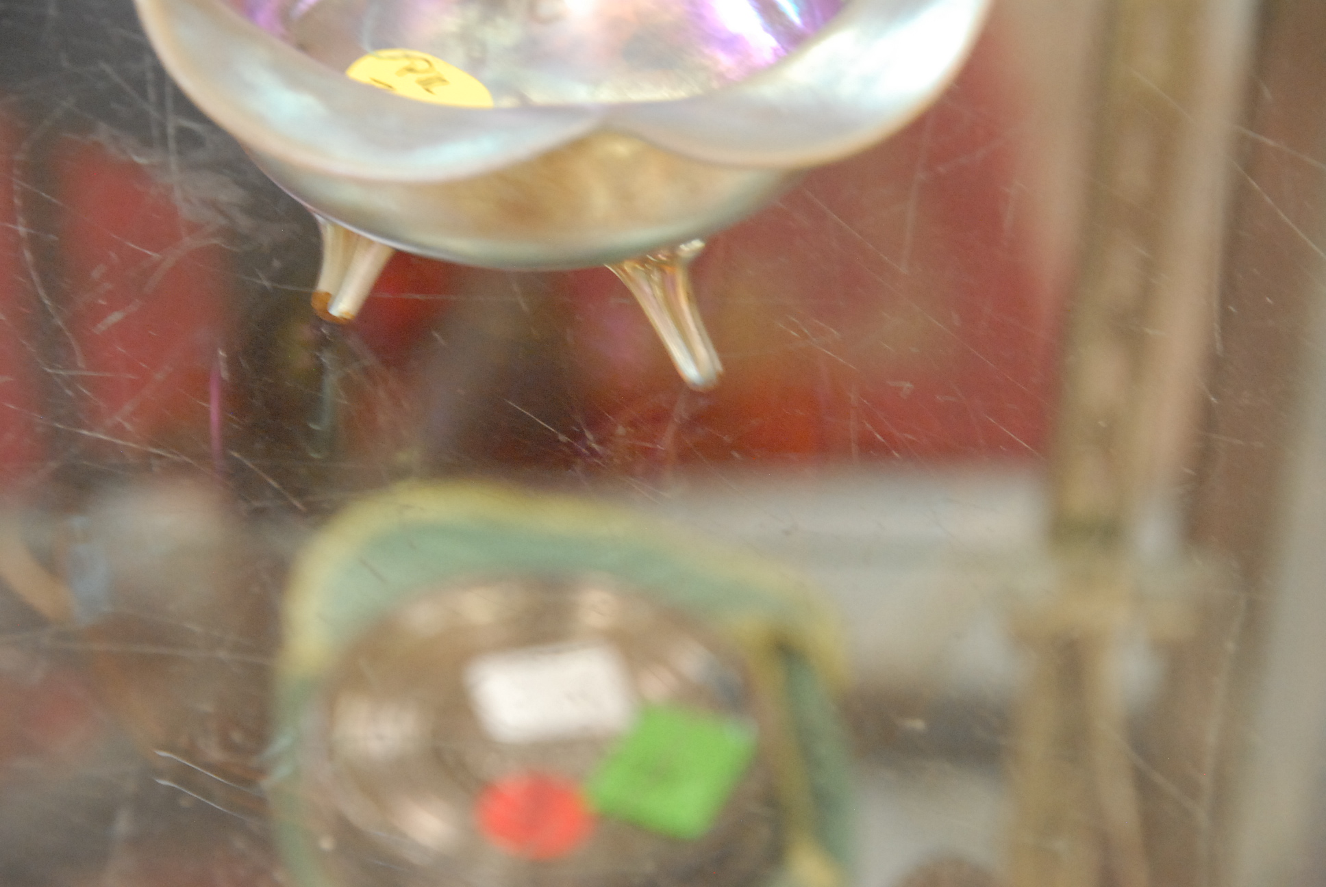 Signed Aurene small footed bowl, minor foot chips, gold iridescent art glass.