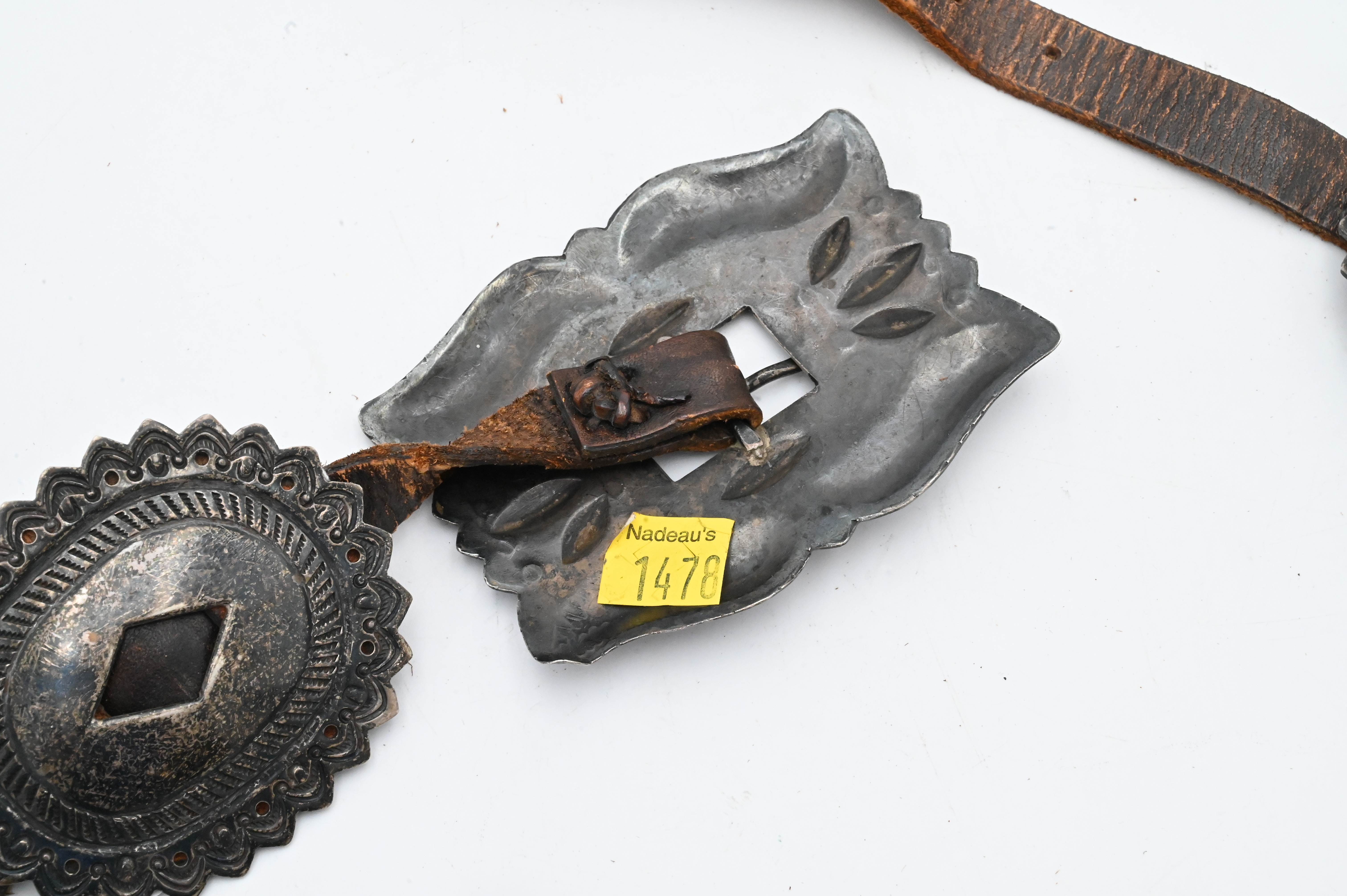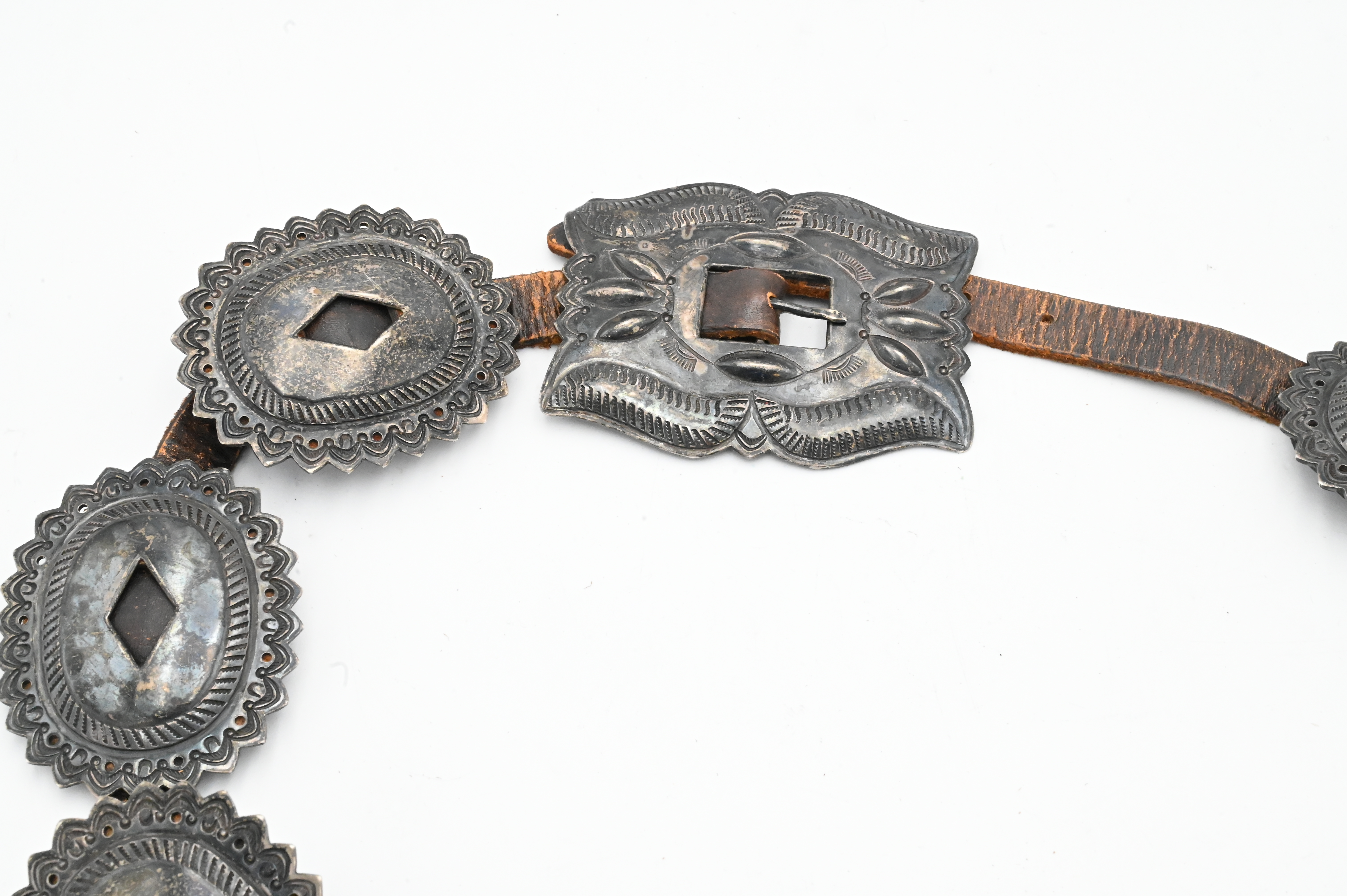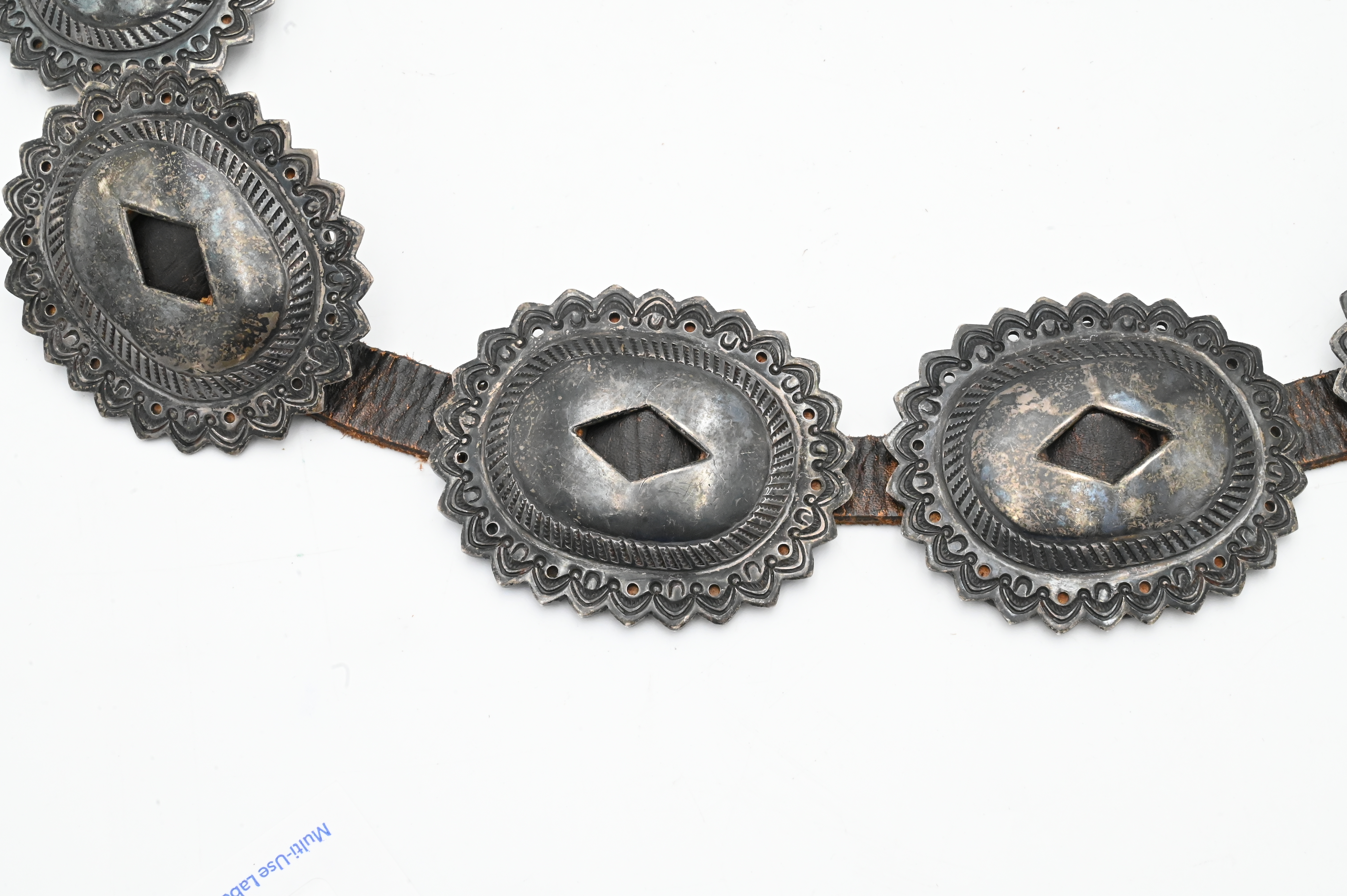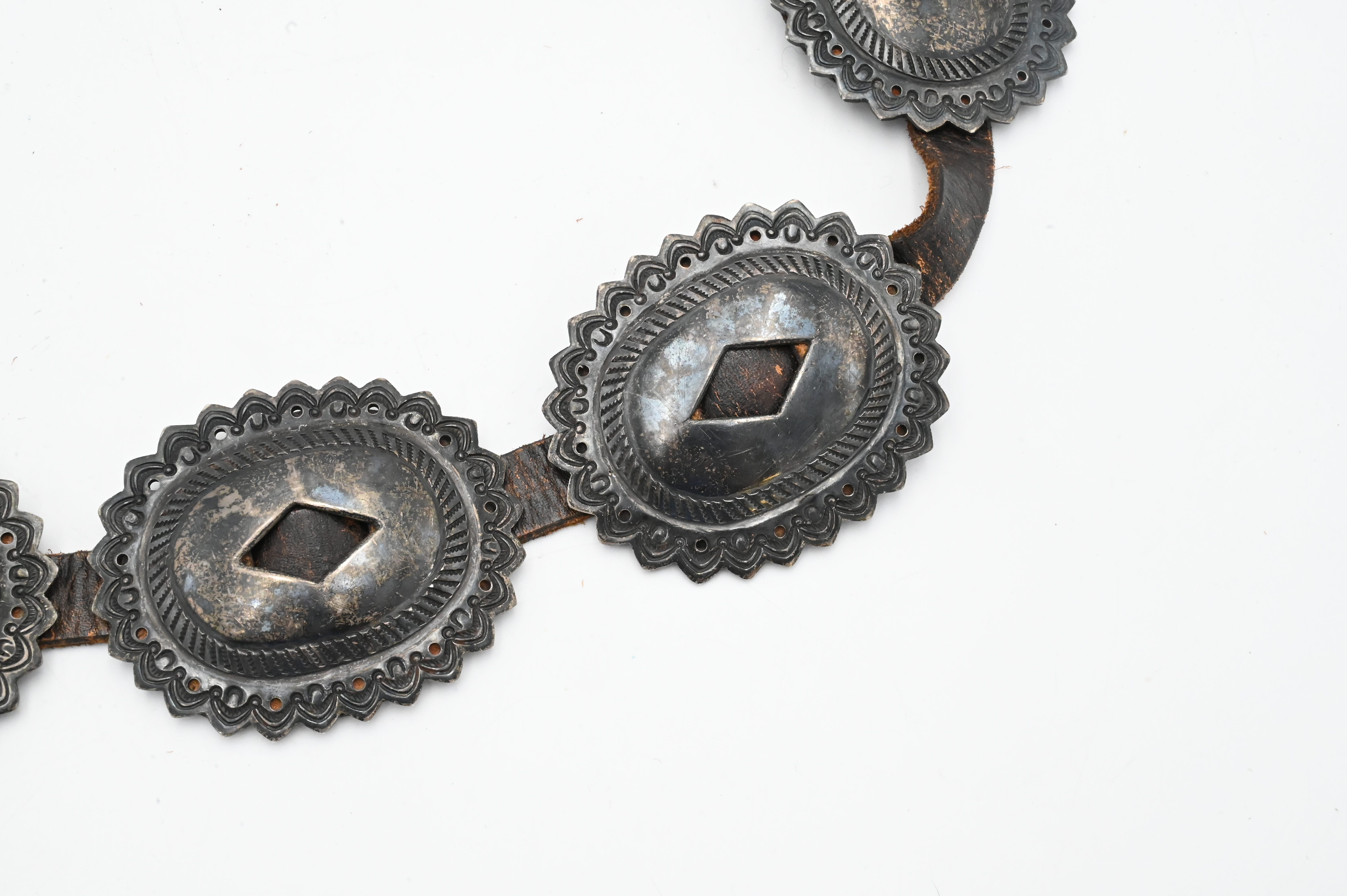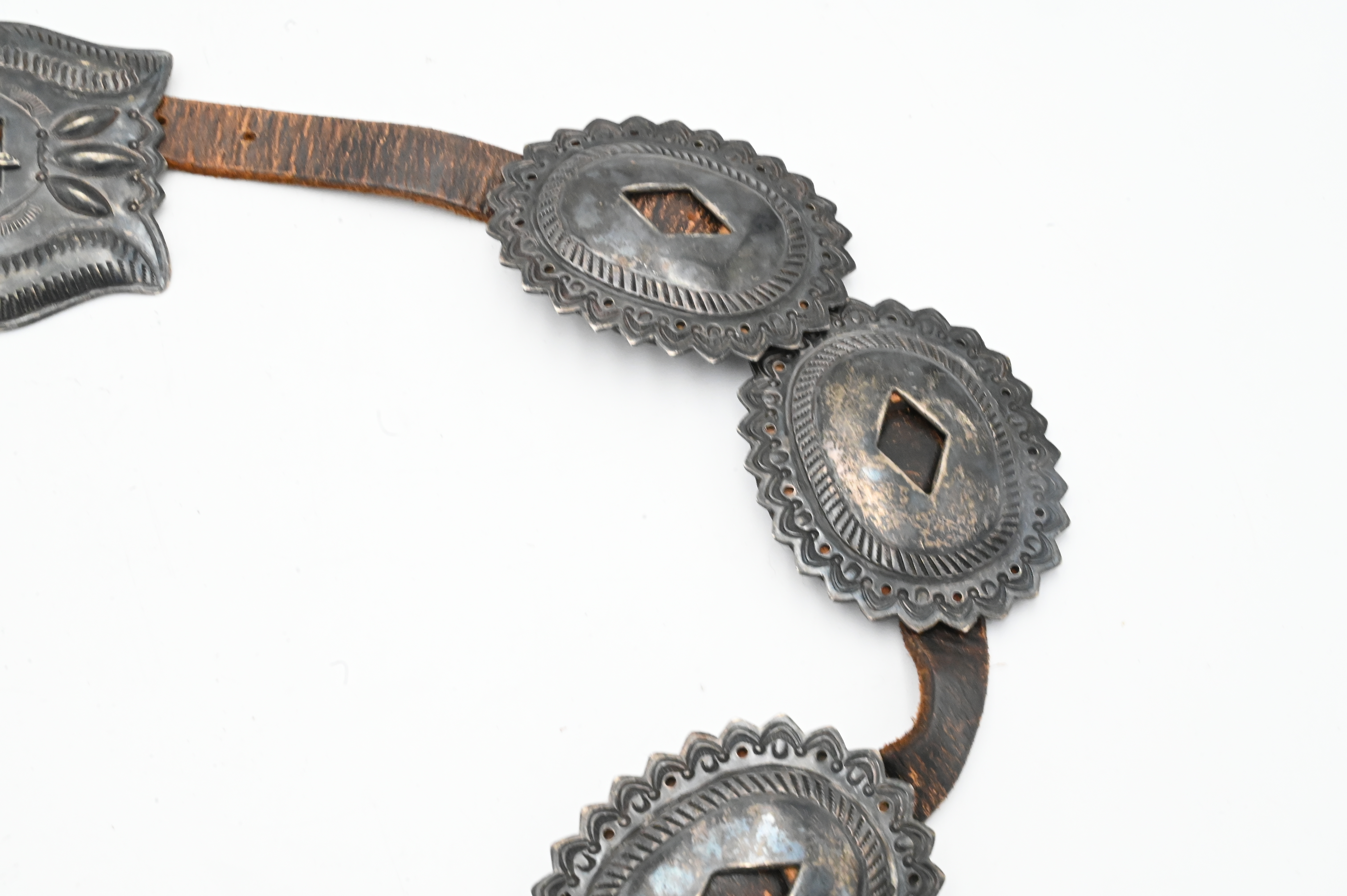 Silver and Leather Concho Belt, each silver piece backed by leather, including belt and leather backings, 19. t.oz.