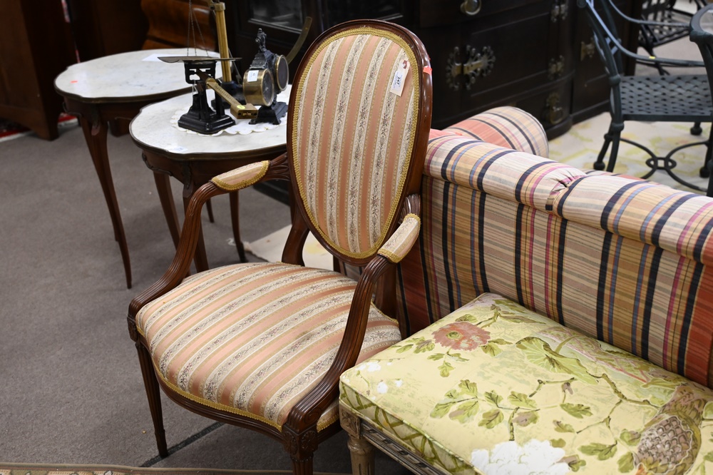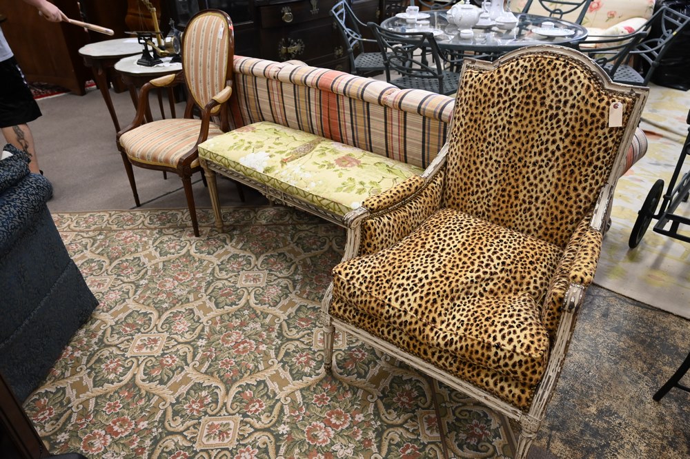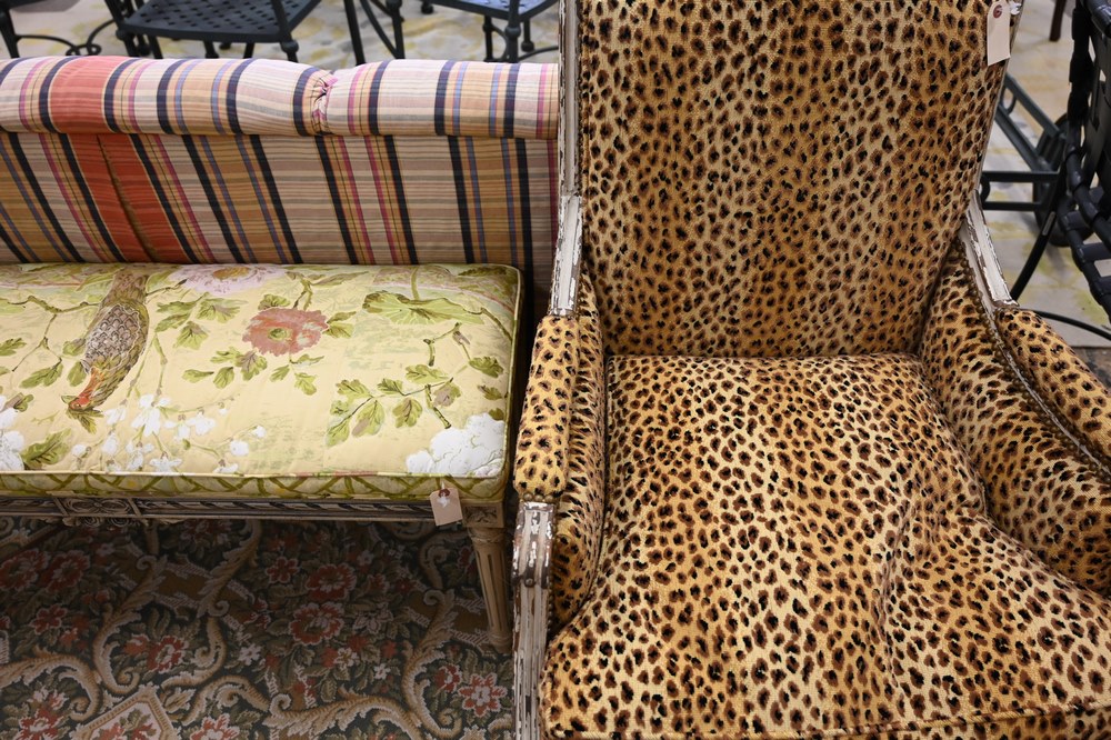 Lot 247: Three Piece Lot of Louis XVI Style Furniture, to include two armchairs, one having faux cheetah upholstery, along with a bench having green floral upholstery and bow form carving to the frame, bench length 43 inches.