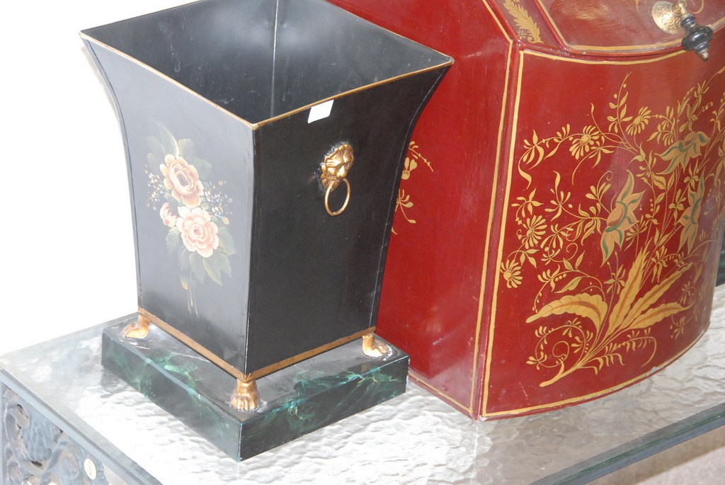 Three piece tole lot pair of large tin waste baskets, and tole tea box repainted.