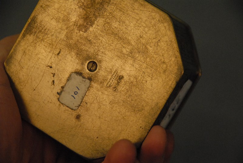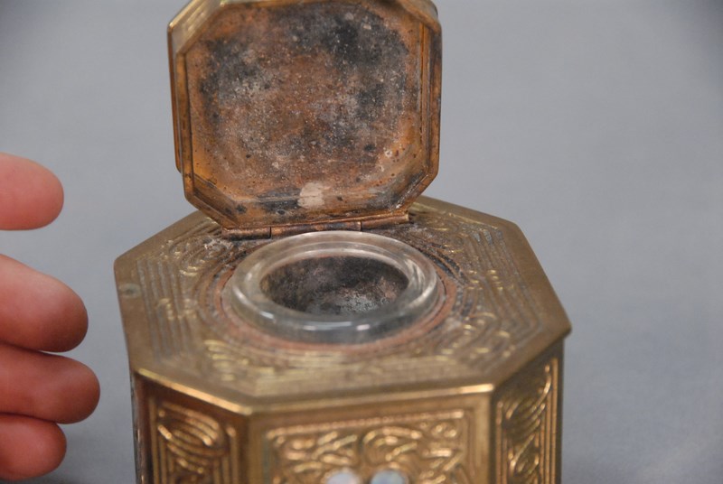 Tiffany inkwell, gilt bronze with inlaid mother of pearl, ht. 3in. 3 3/4in. square