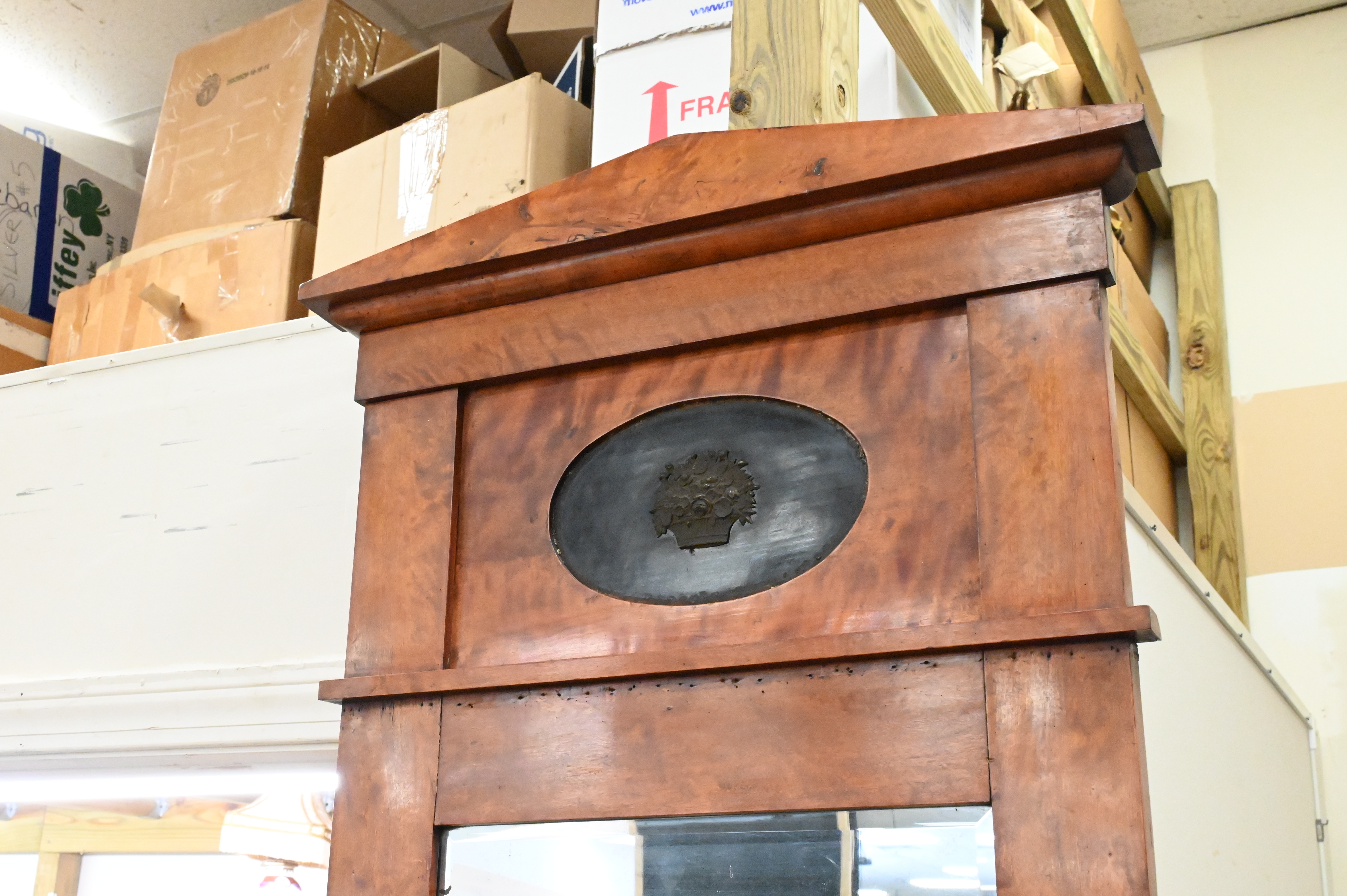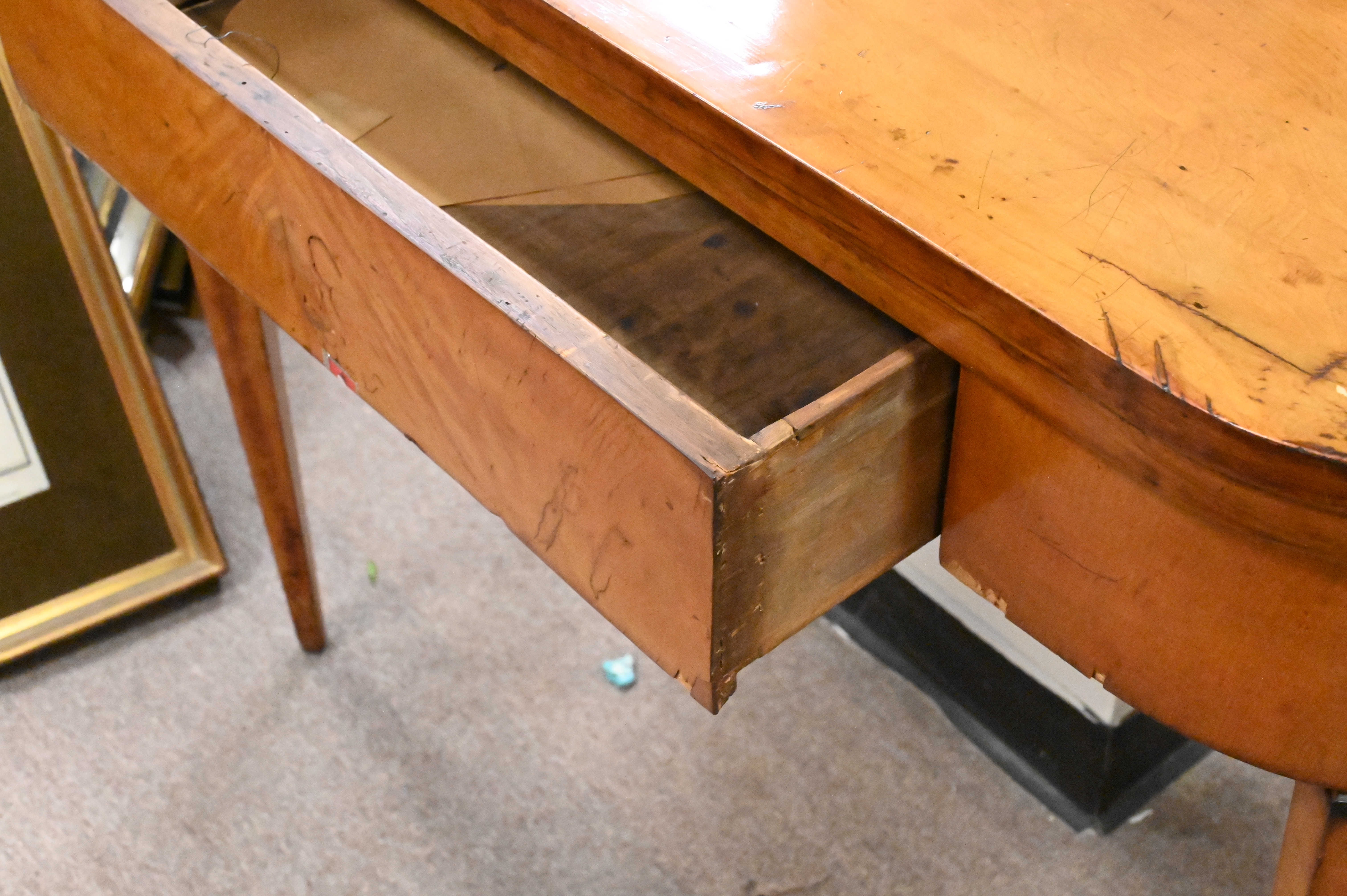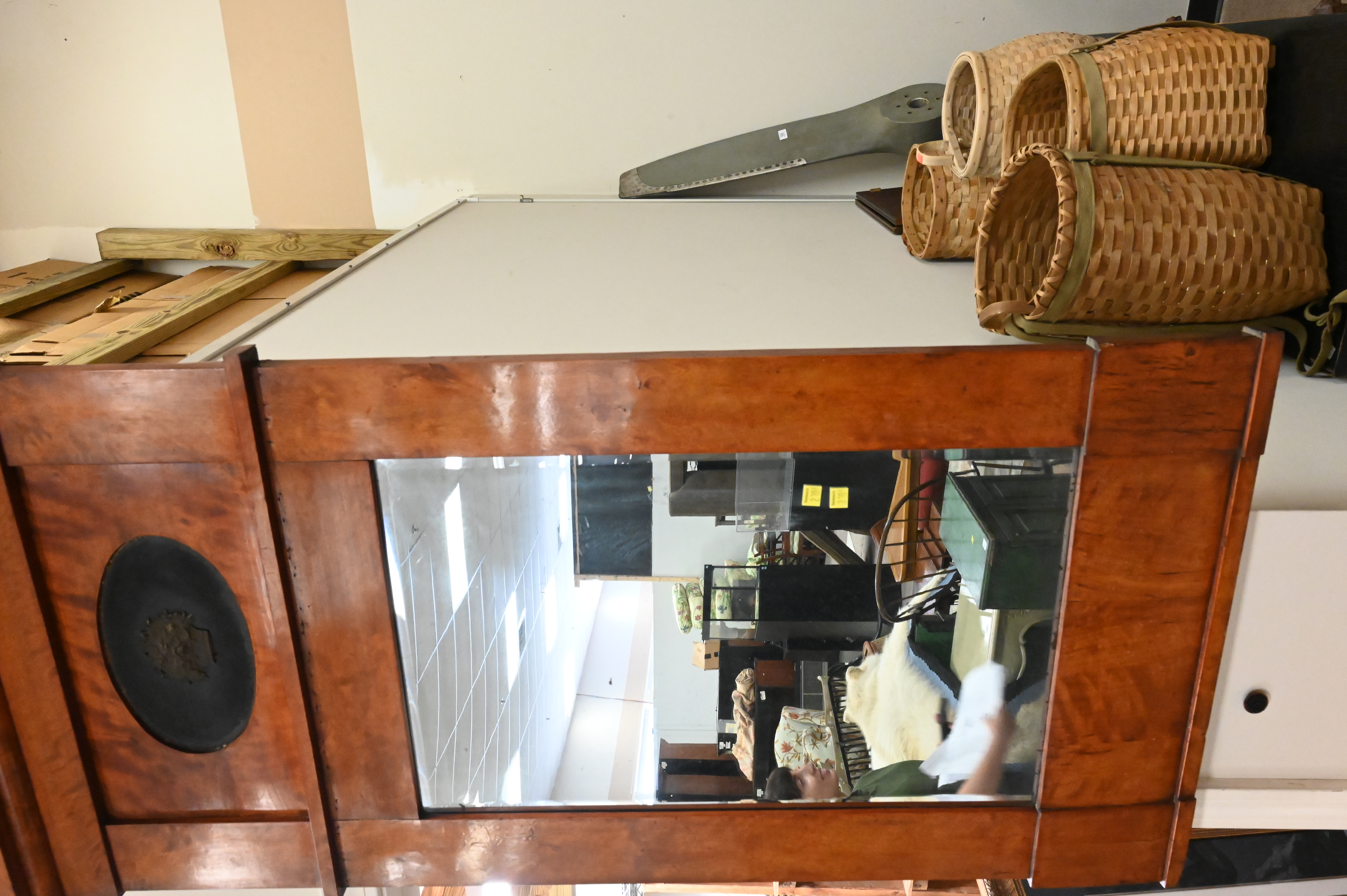 Two Piece Lot Biedermeier Fruitwood Game Table, with leather interior and drawer along with Biedermeier mirror both 19th century, table height 31 inches, mirror height 51 1/2 inches.