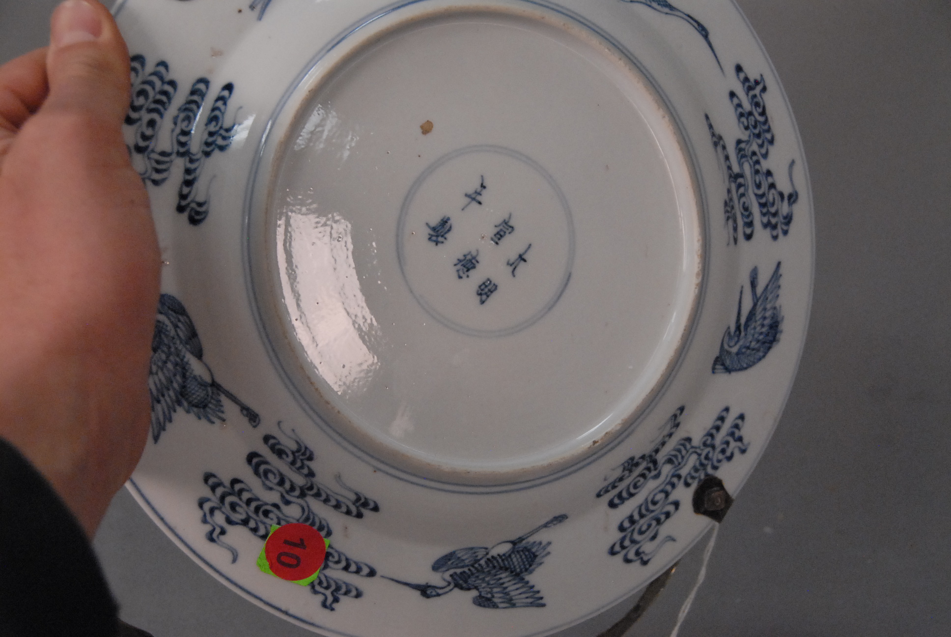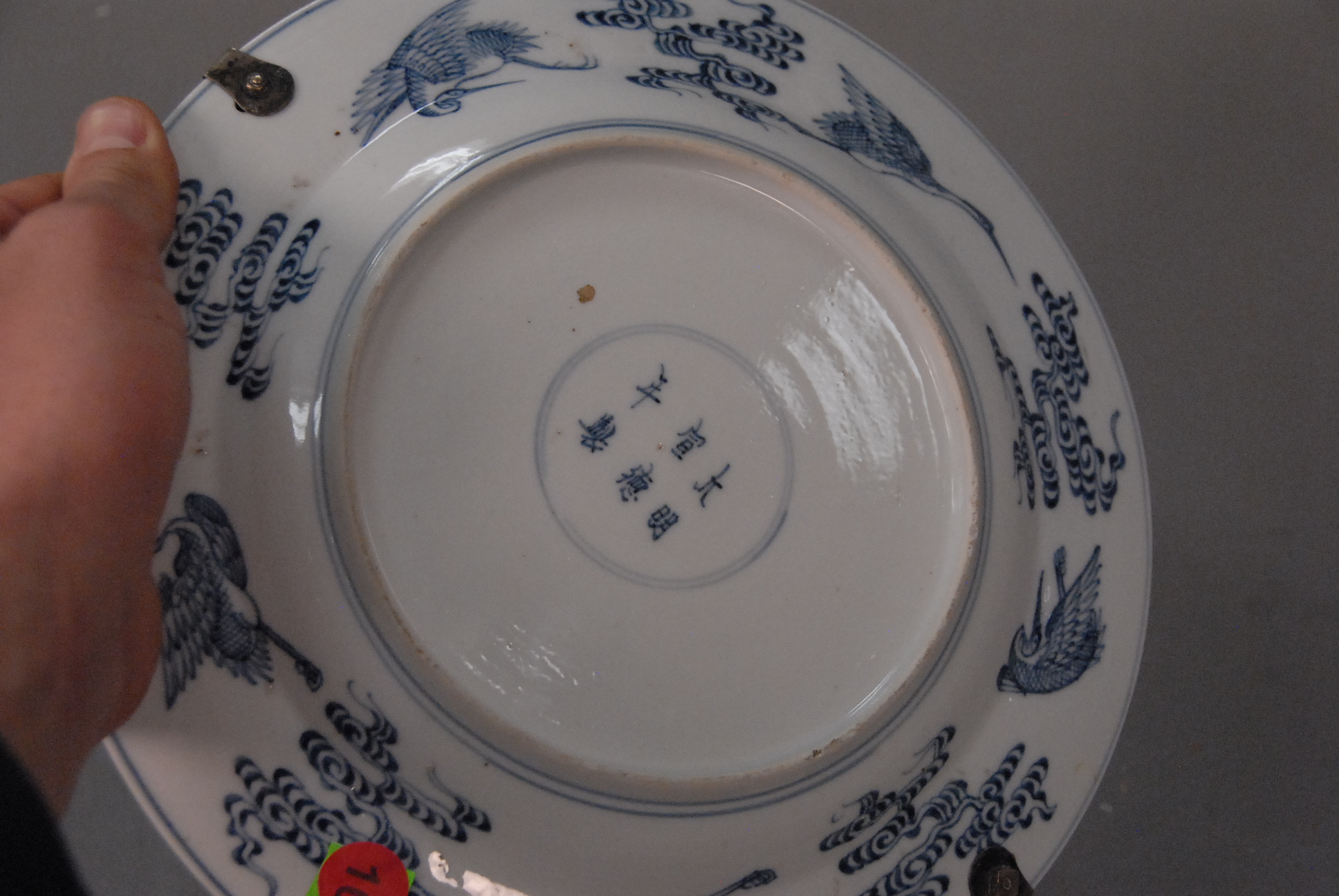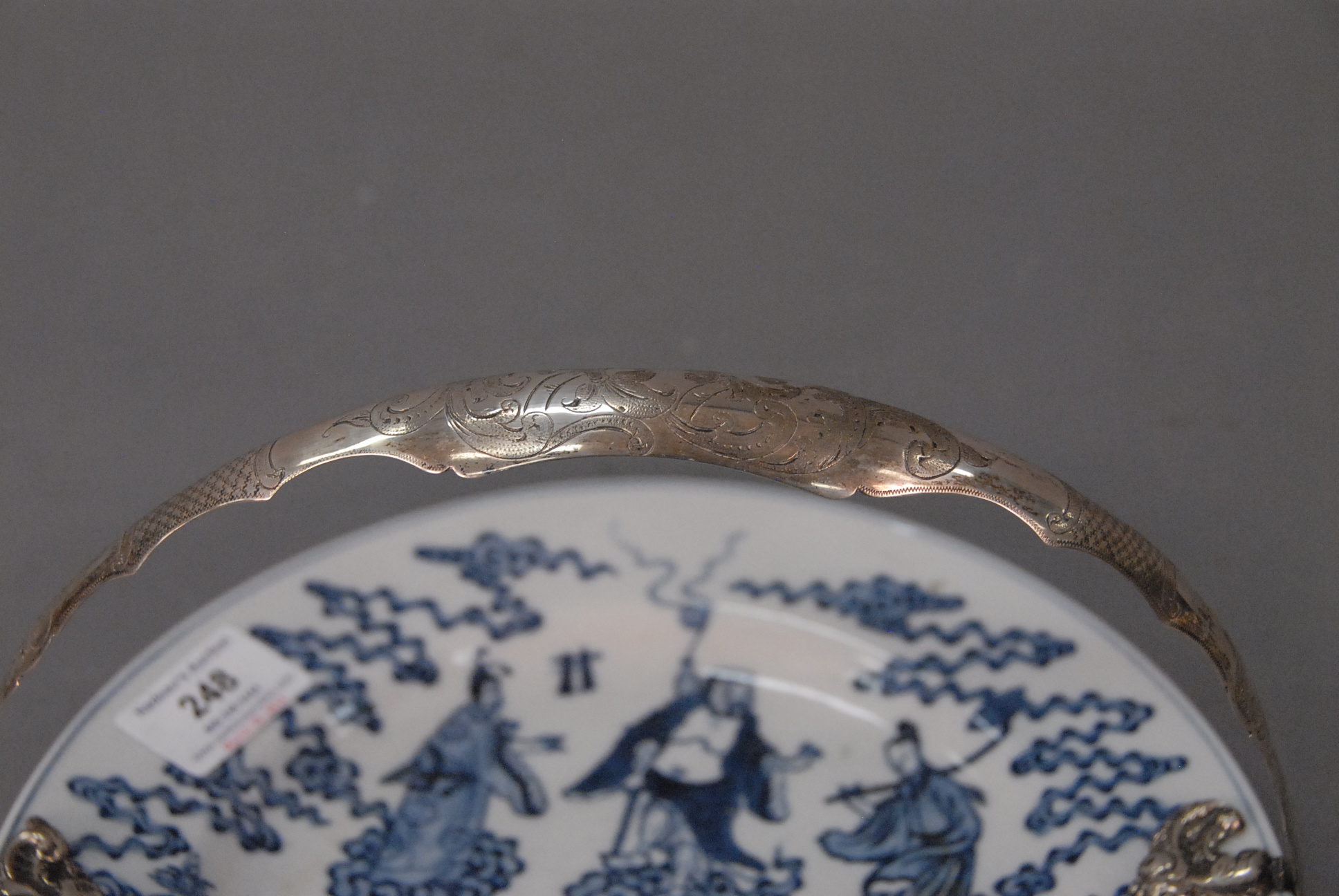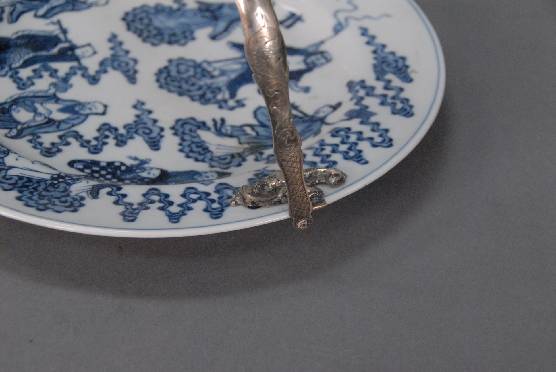 Lot 248: Blue and white Kangxi plate depicting the Eight Immortals, with American/European silver handle mounts and six-character underglaze Ming Zhengde mark, China 18th century one hinge lose. dia. 10in.