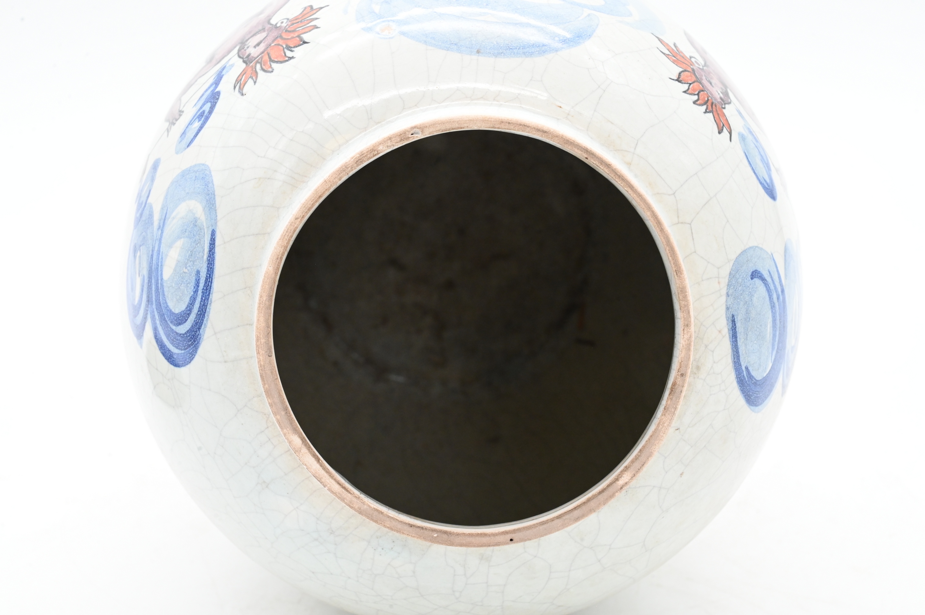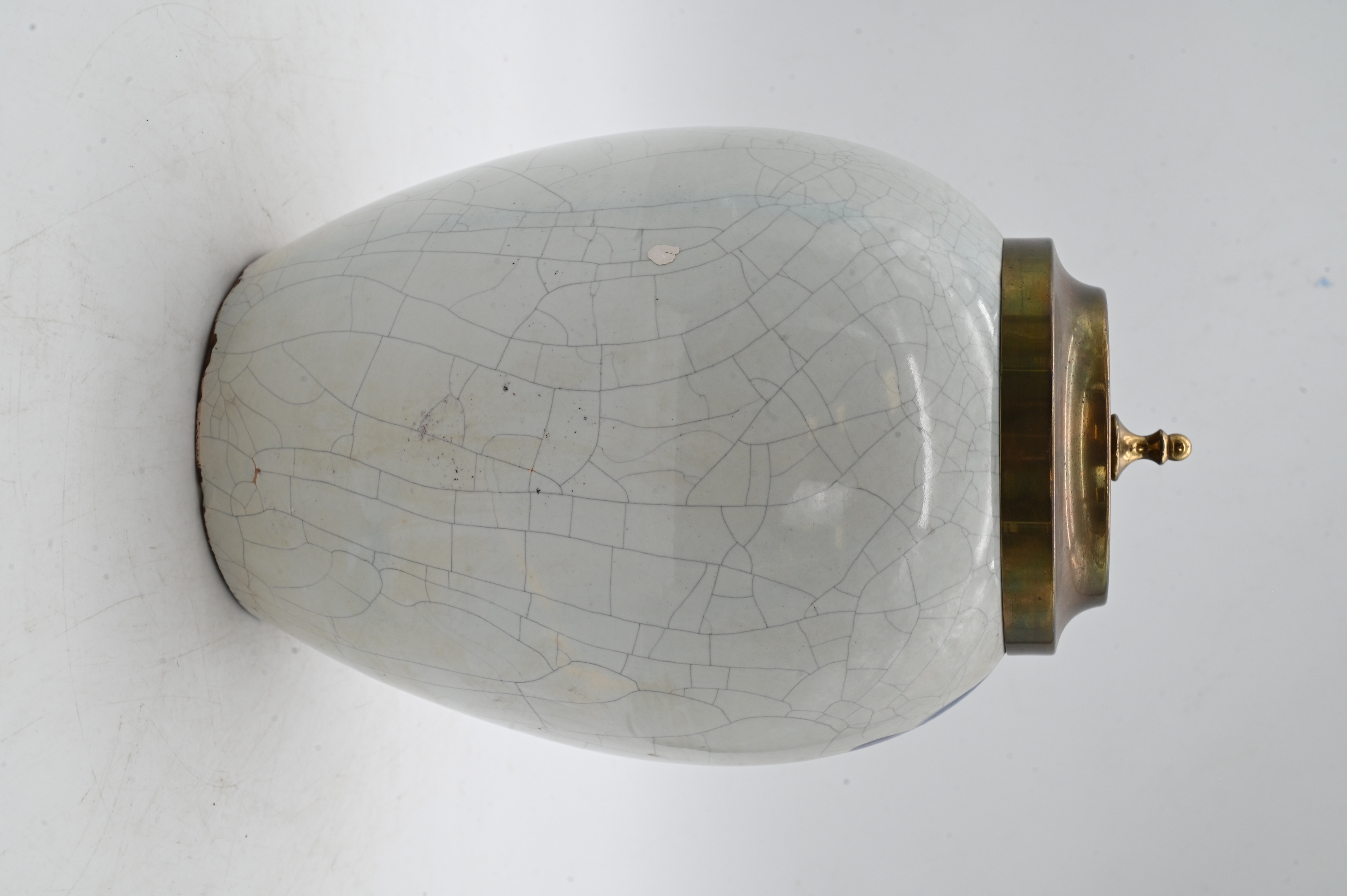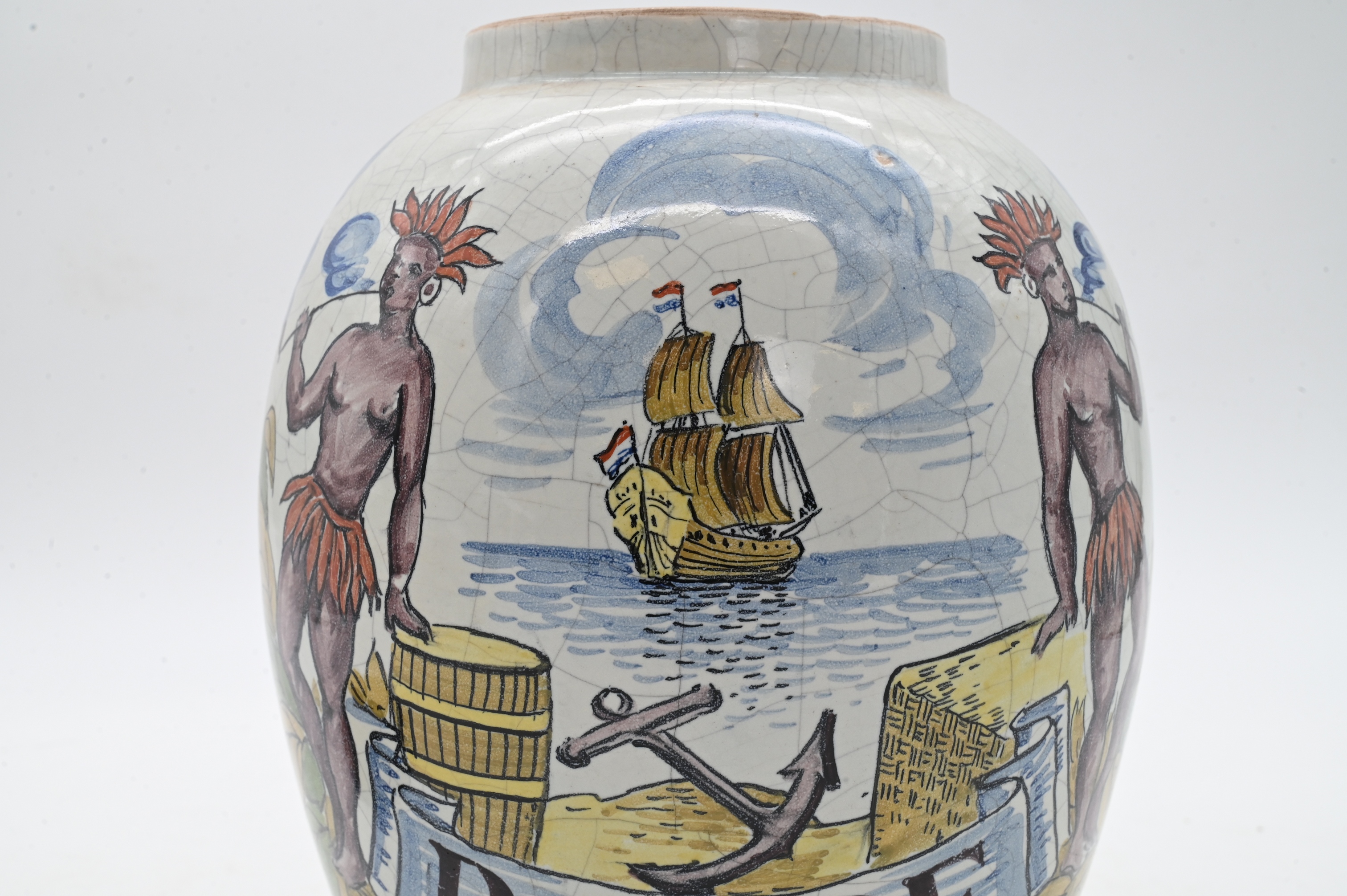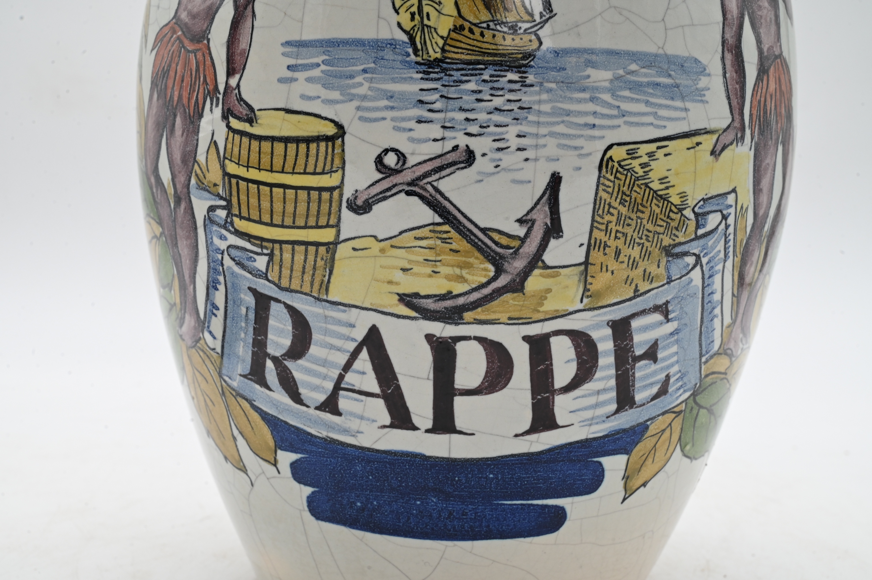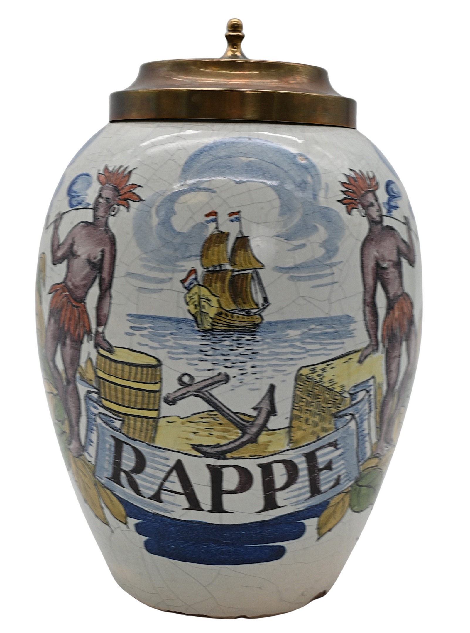 of ovoid form with everted rim and crackle glazed surface, hand-painted depicting Native figures engaged in smoking tobacco within a landscape and distant tea with East India Trade ship, labeled “Rappe,” decorated in tones of blue, green, ochre, surmounted by brass lid