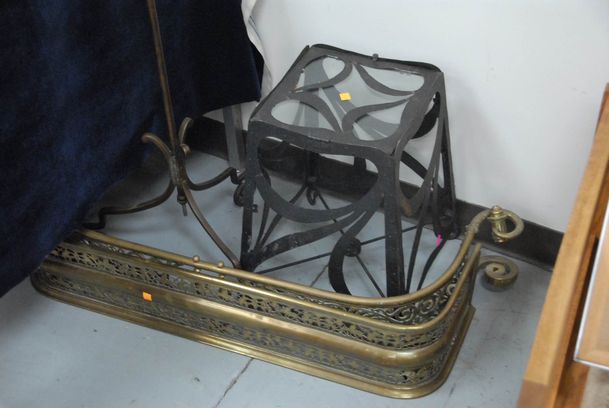 Lot 248: Four piece lot to include brass floor lamp, two fire fenders lg. 36in. & lg. 41in., and an iron table,