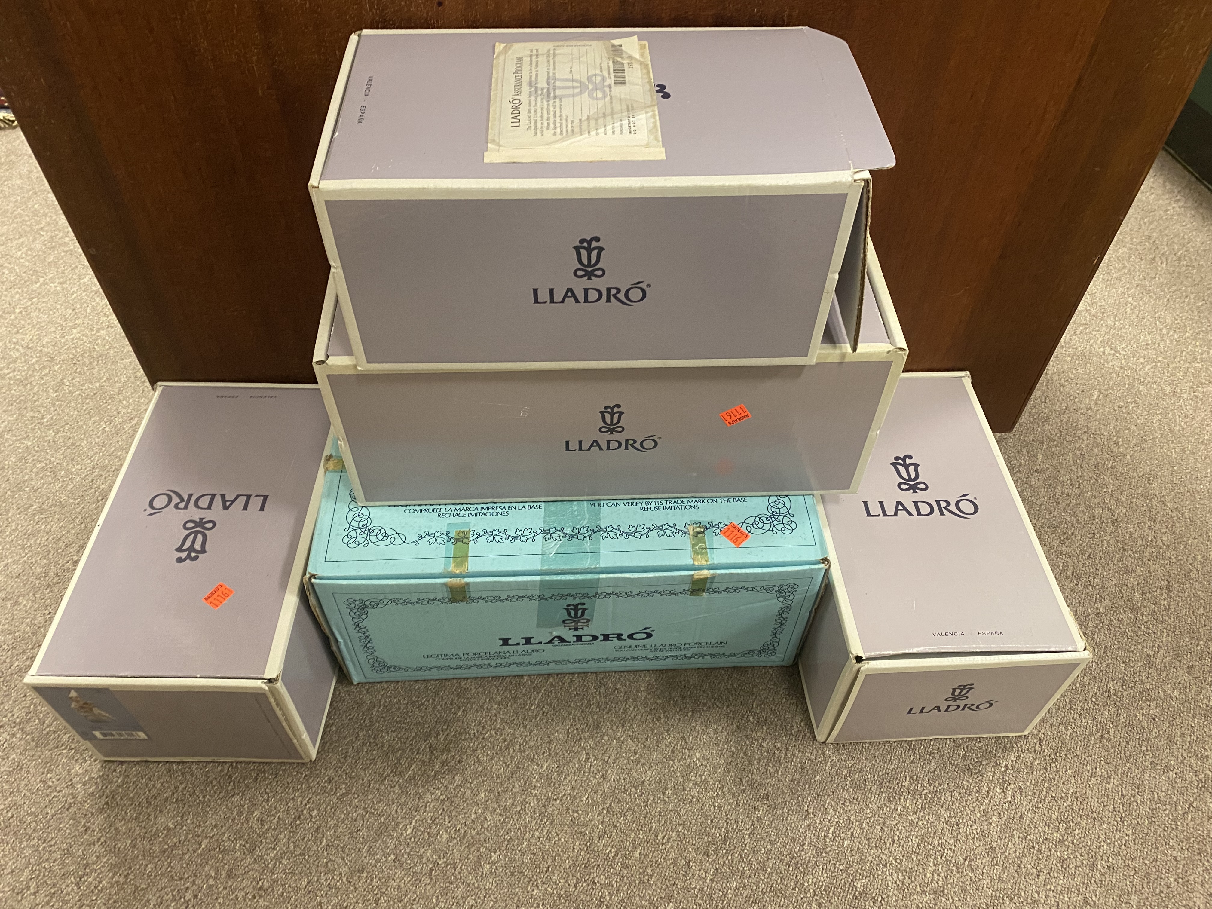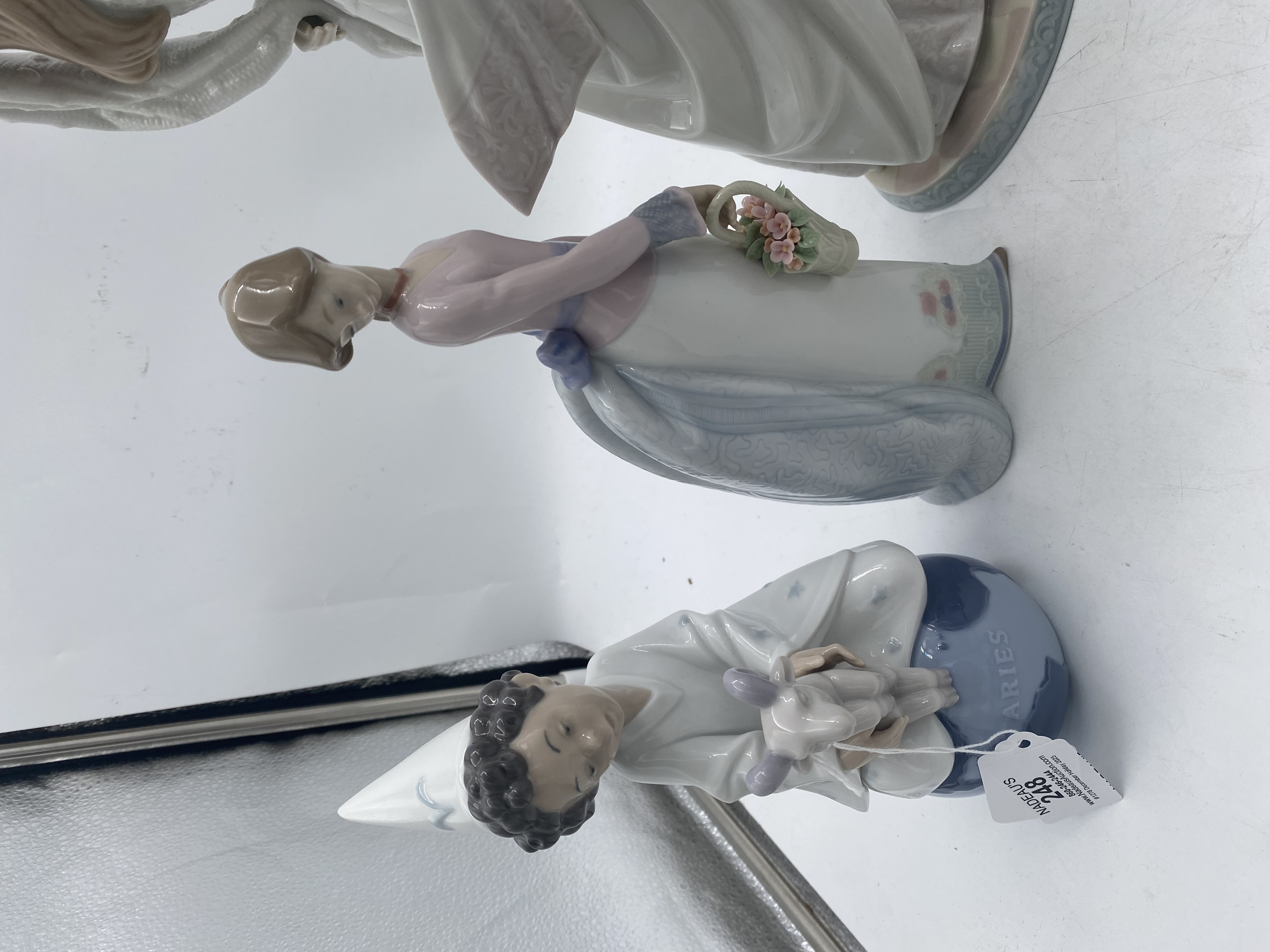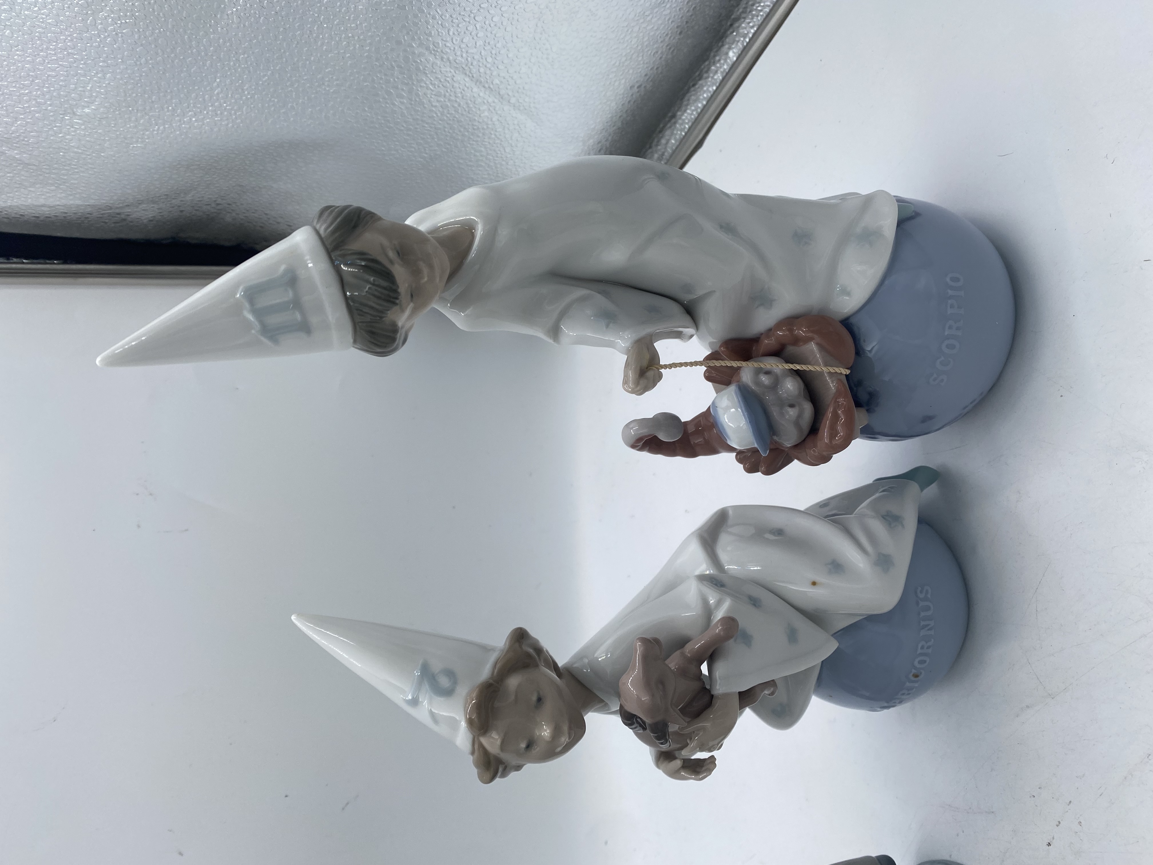 Including “Baile de Boda” (Wedding Dance) no. 1528, “Flores de Mi Jardin” (Basket of Love) no. 7622, “Horoscopo Capricornus” no. 6222, “Horoscopo Aries” no. 6221, and “Horoscope Scorpio” no. 6225; each in original Lladro box.