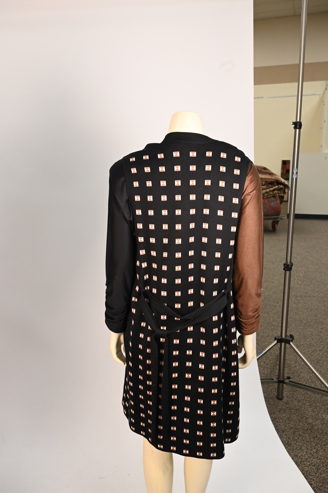 Hermes Dress and Knit Vest, black and brown jersey knit, zip back, ruched sleeve dress; along with a sleeveless knit vest with waist tie, size S/M, dress missing label, condition consistent with normal wear.