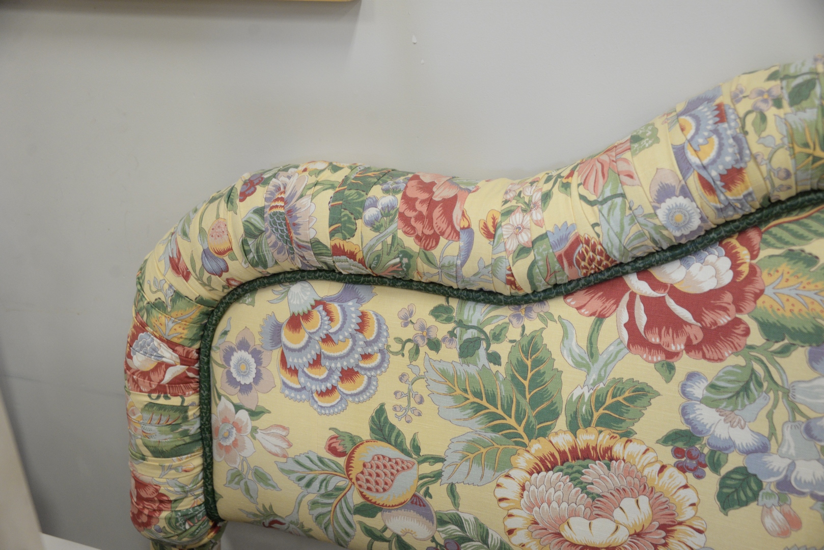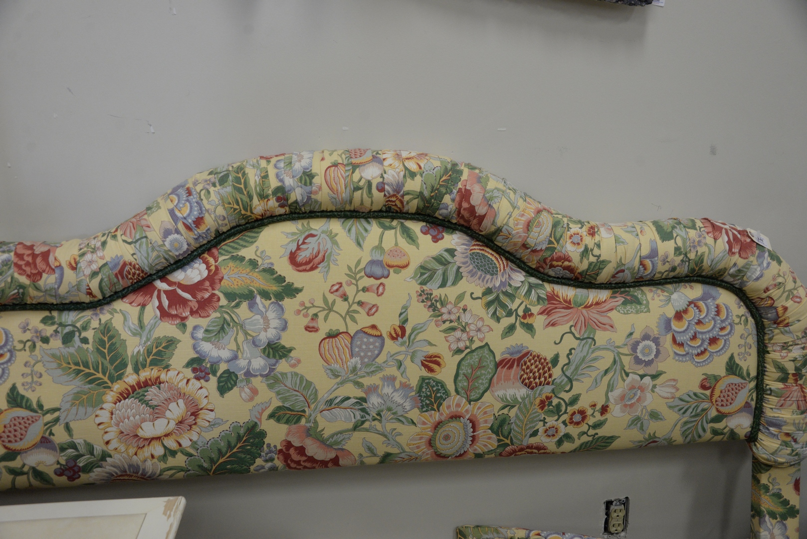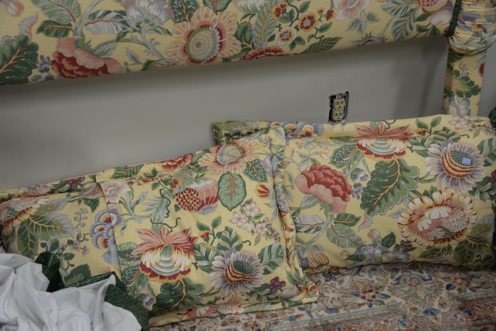 King Size Upholstered Headboard having matching yellow custom quilted comforter and pillows; along with matching comforter and pillows, height 50 inches.