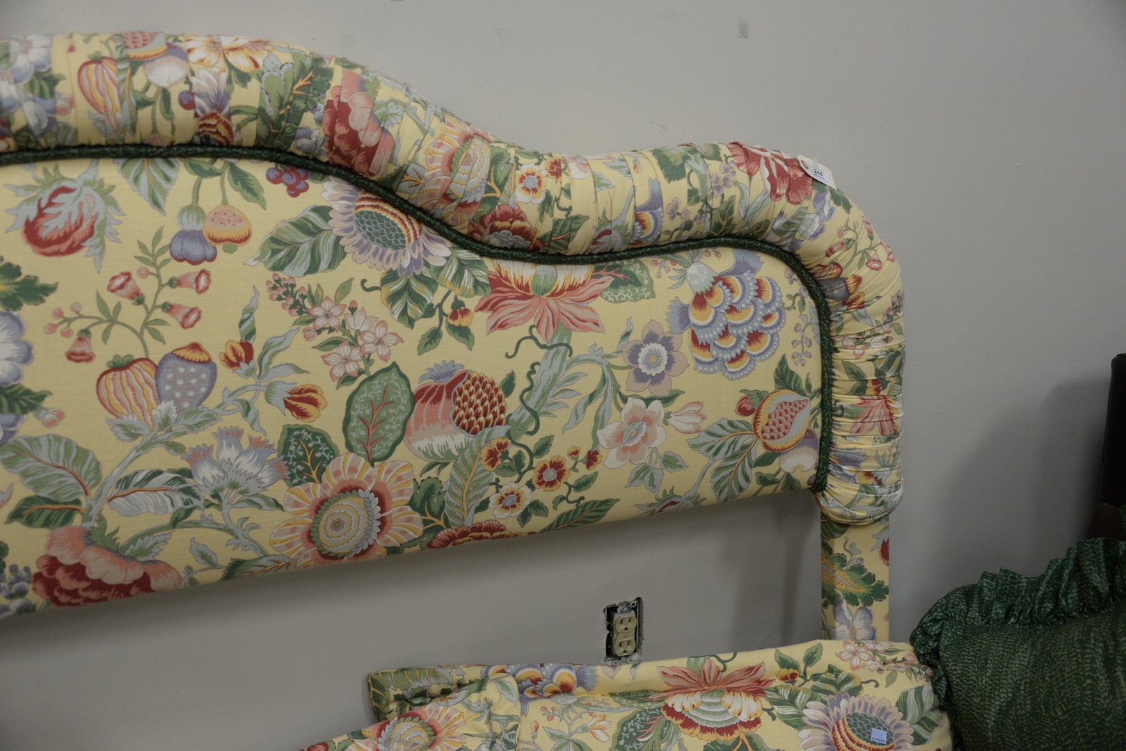 Lot 248: King Size Upholstered Headboard having matching yellow custom quilted comforter and pillows; along with matching comforter and pillows, height 50 inches.