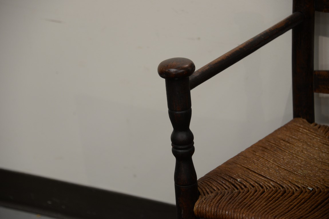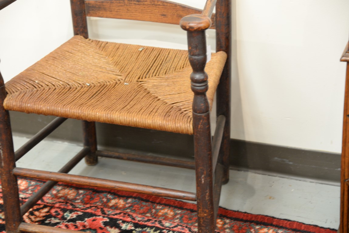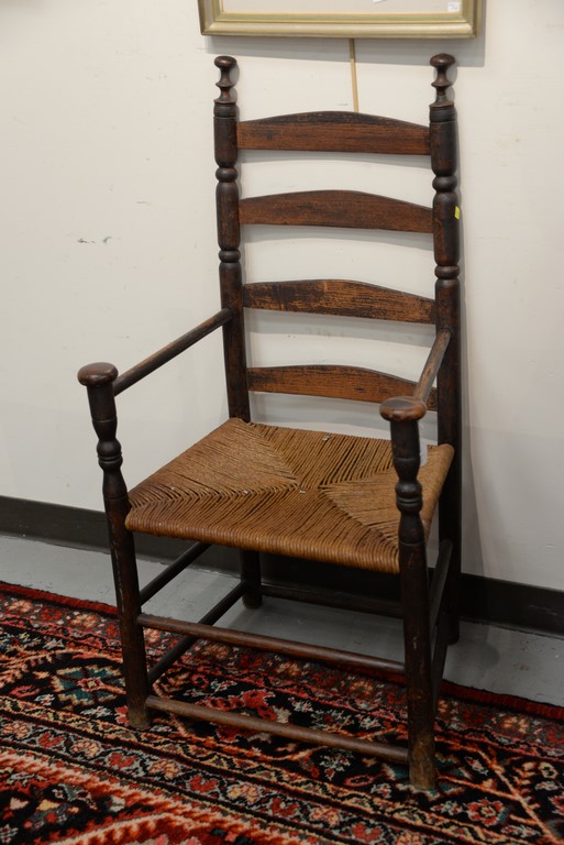 Lot 248: Ladderback great chair having turned finials, sausage turnings, four slats, and turned arms with mushroom hand supports on plain turned legs in old finish, late 17th to early 18th century woven seat replaced, one finial broken. ht. 42 3/4 in