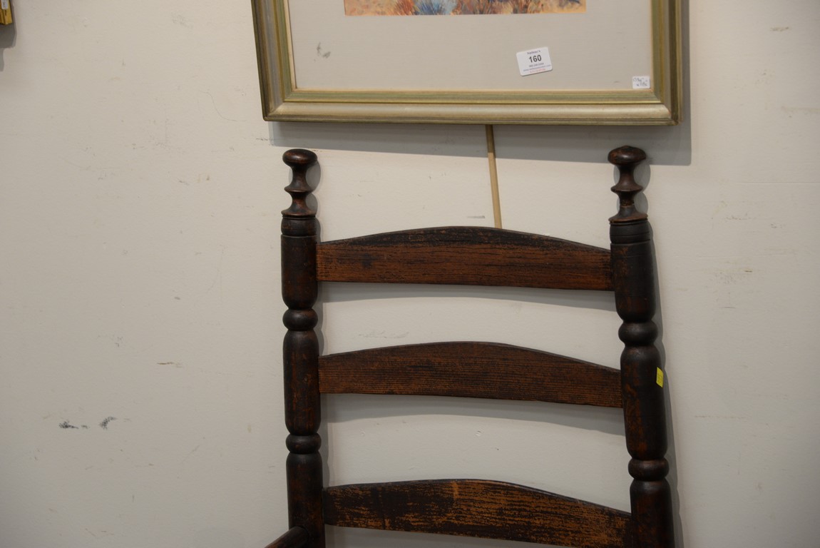 Ladderback great chair having turned finials, sausage turnings, four slats, and turned arms with mushroom hand supports on plain turned legs in old finish, late 17th to early 18th century woven seat replaced, one finial broken. ht. 42 3/4 in. seat ht. 16 1/2 in.