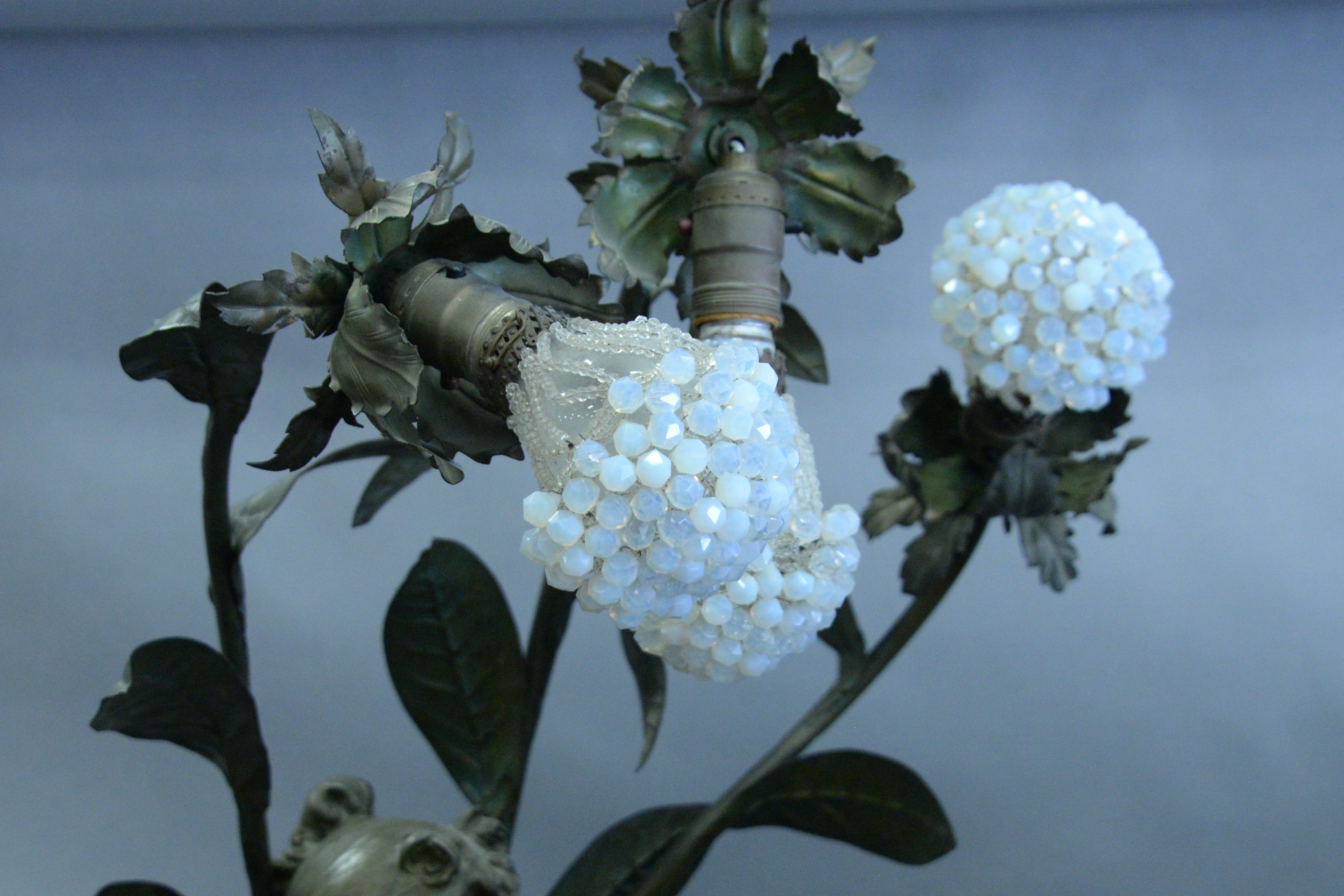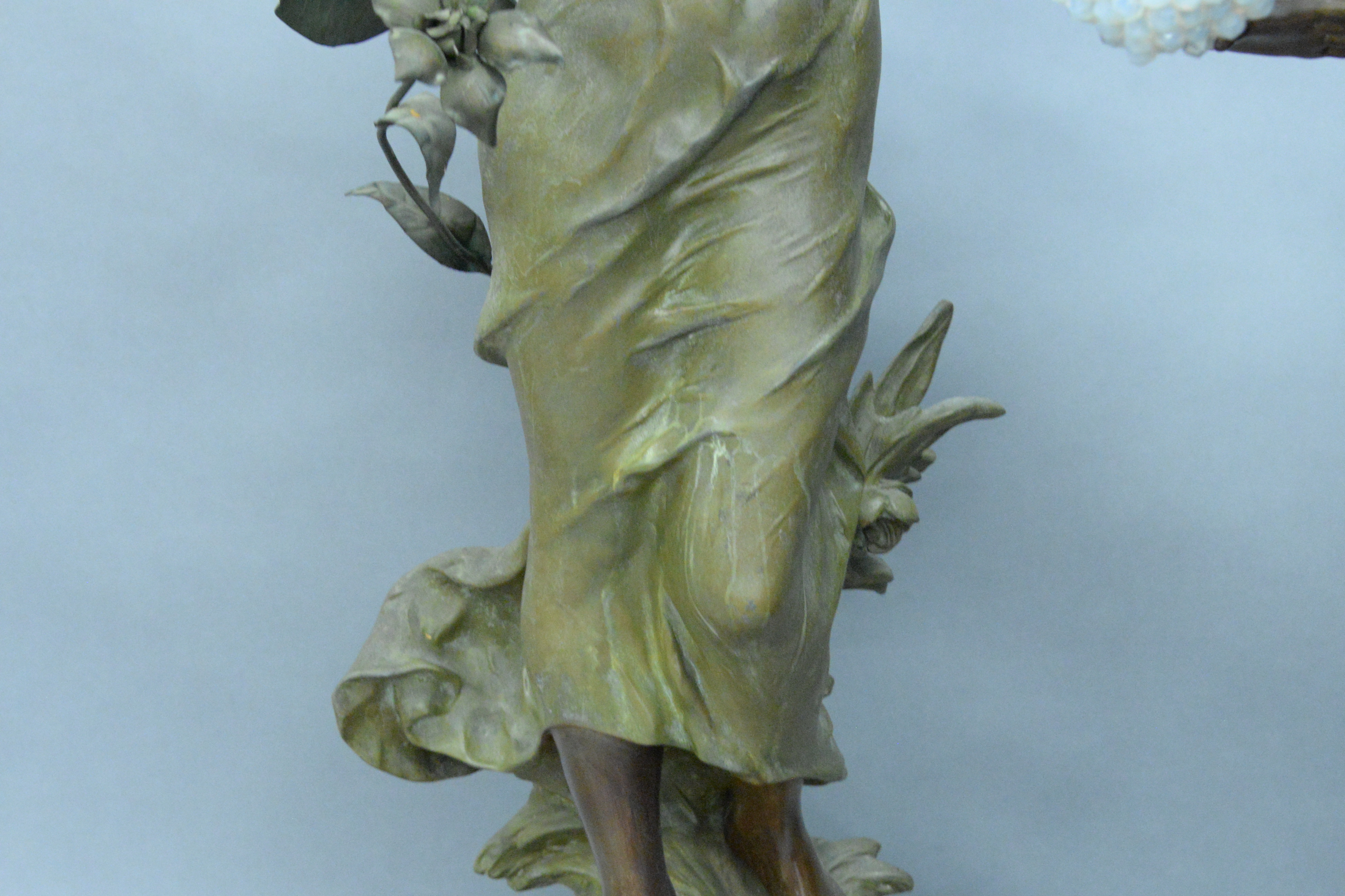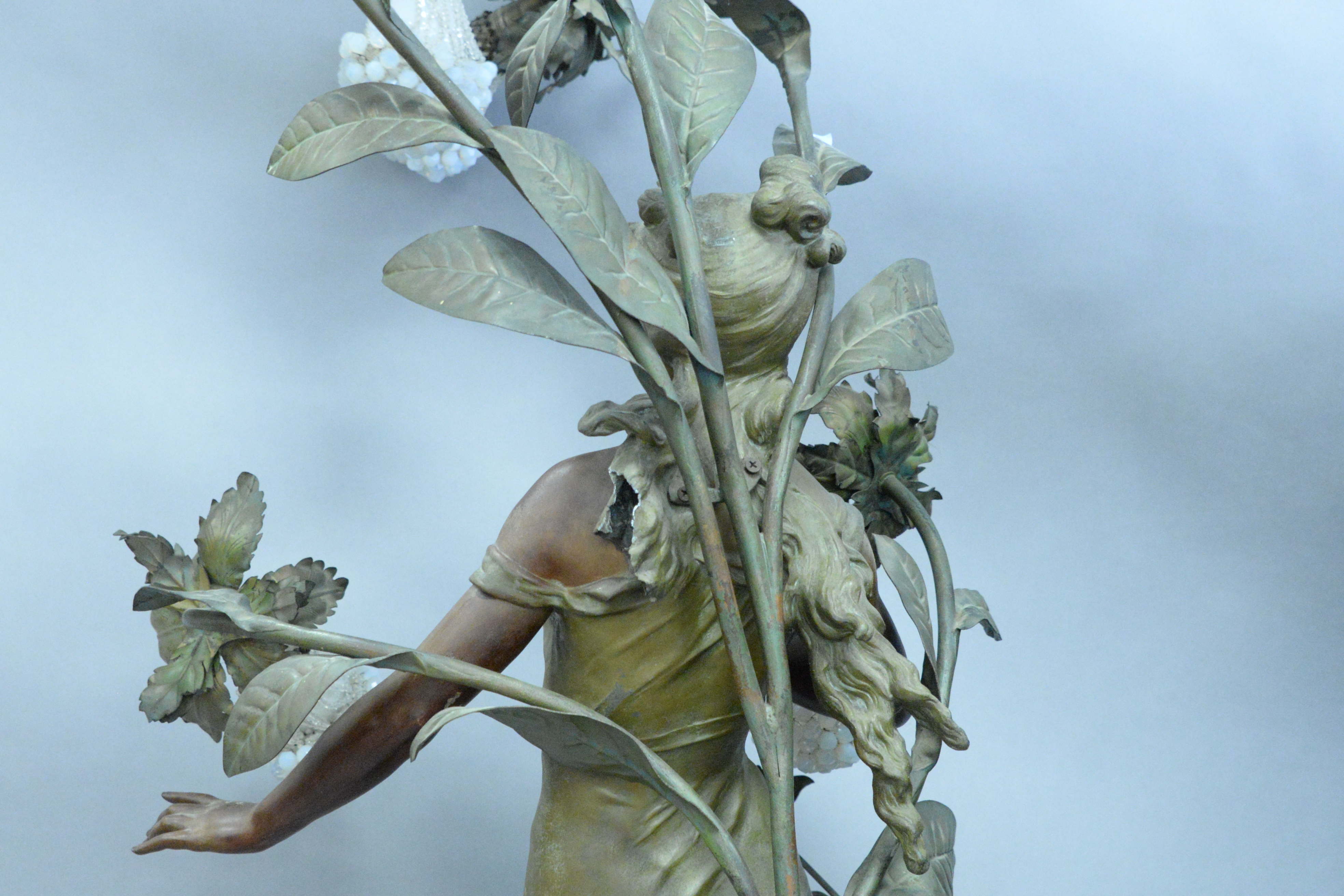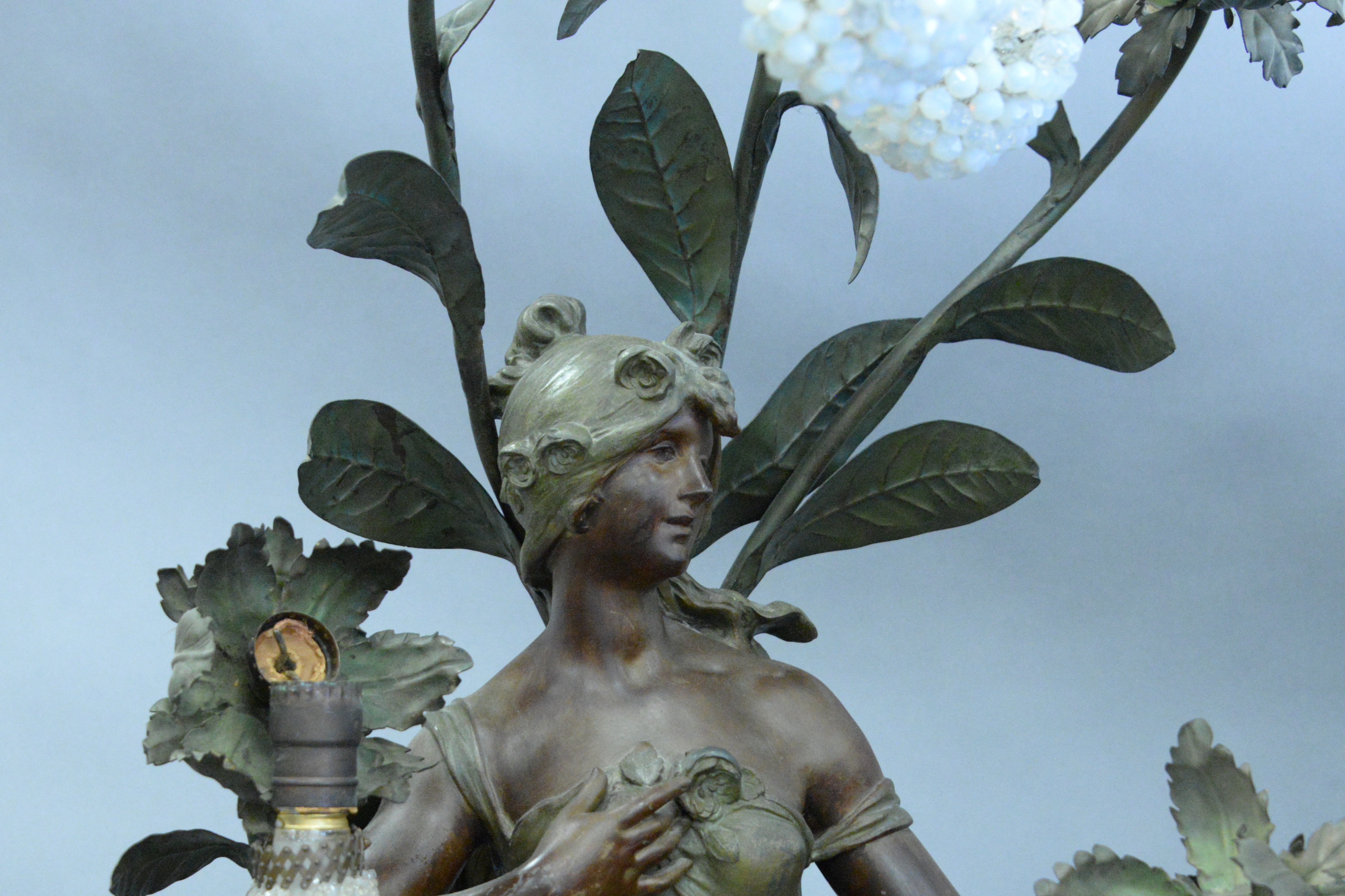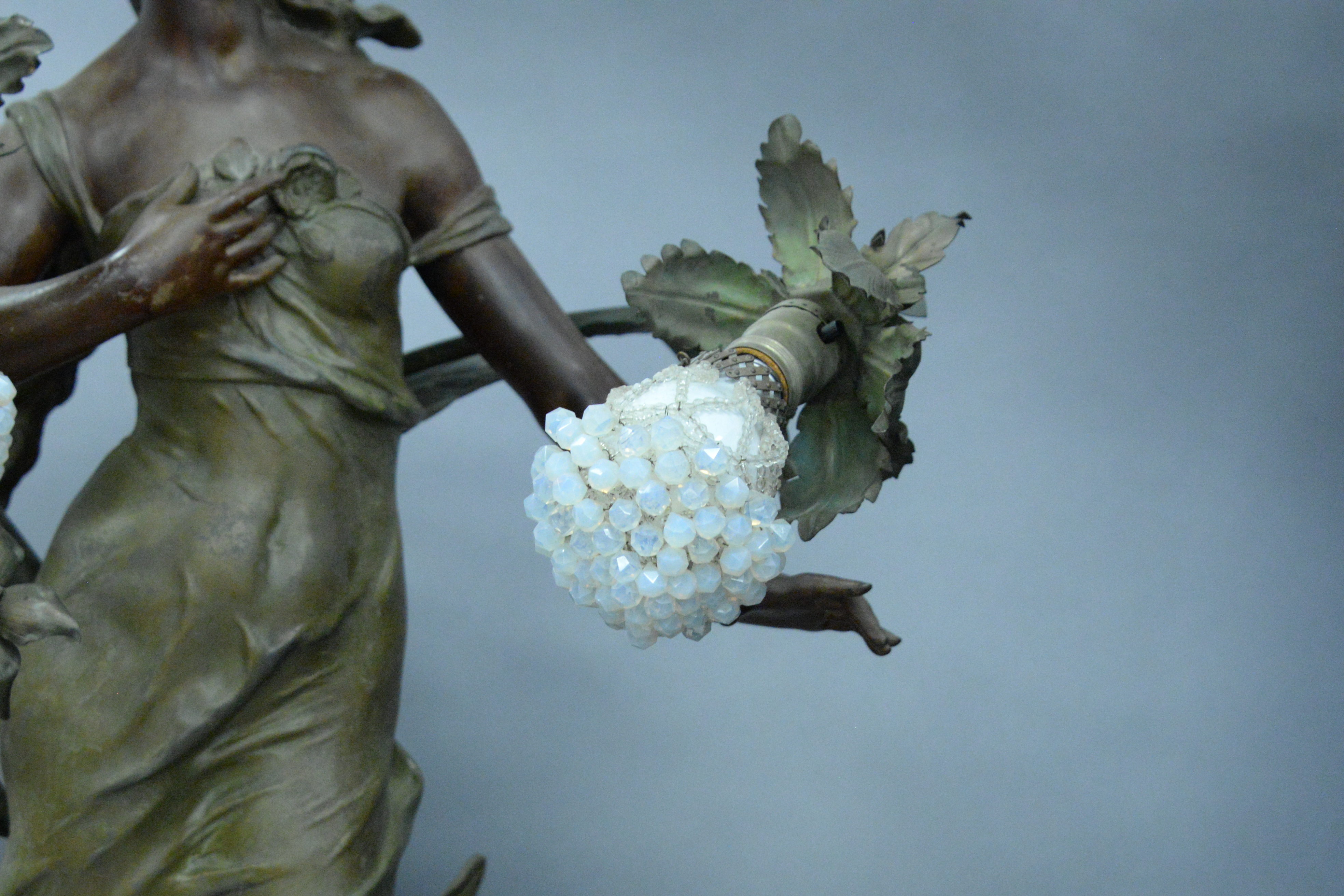 Large French Cast Metal Art Nouveau Lamp, of a woman and five floral beaded lights, piece of hair broken in back, probably Newel Post Lamp, height 50 inches