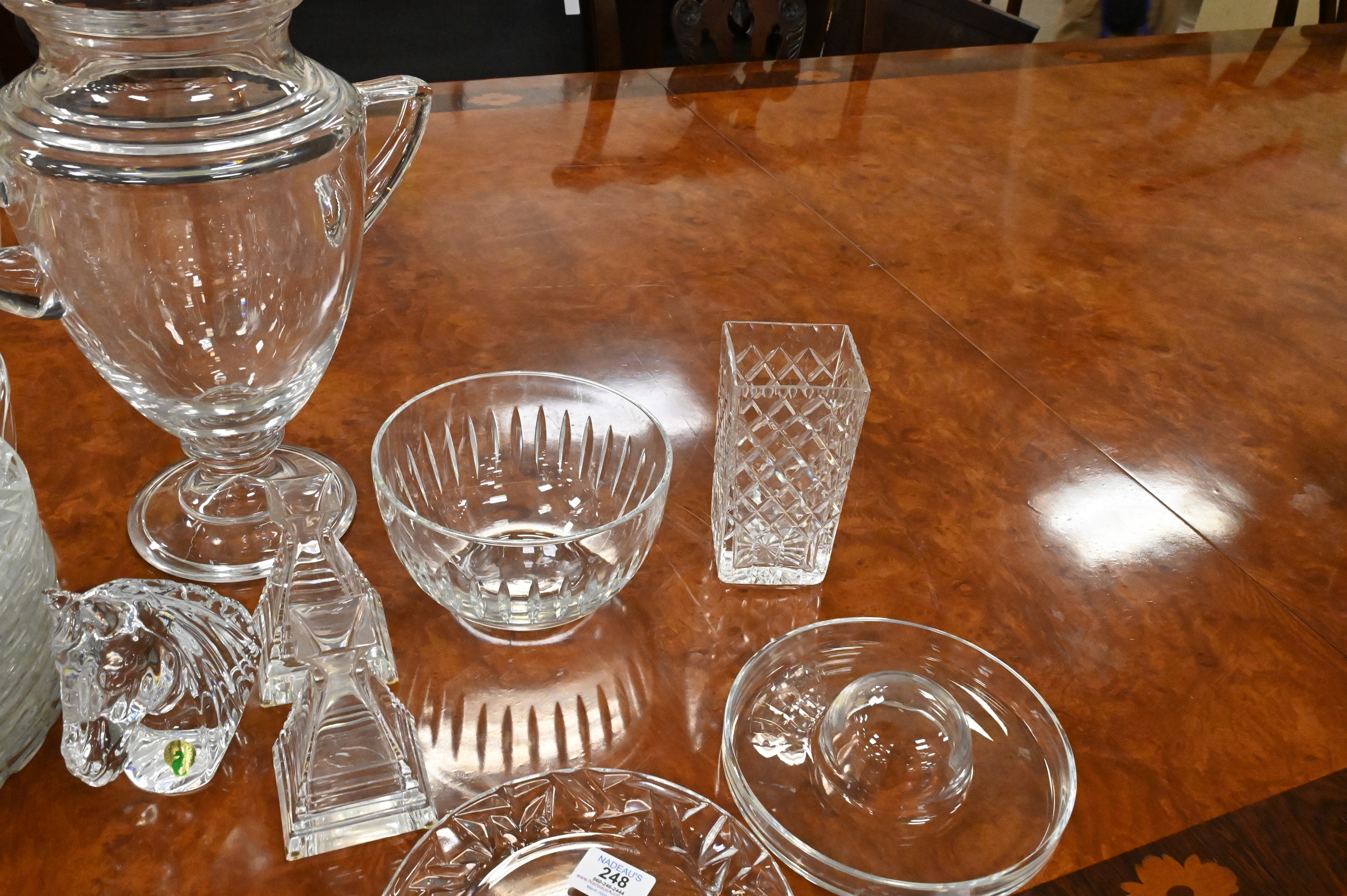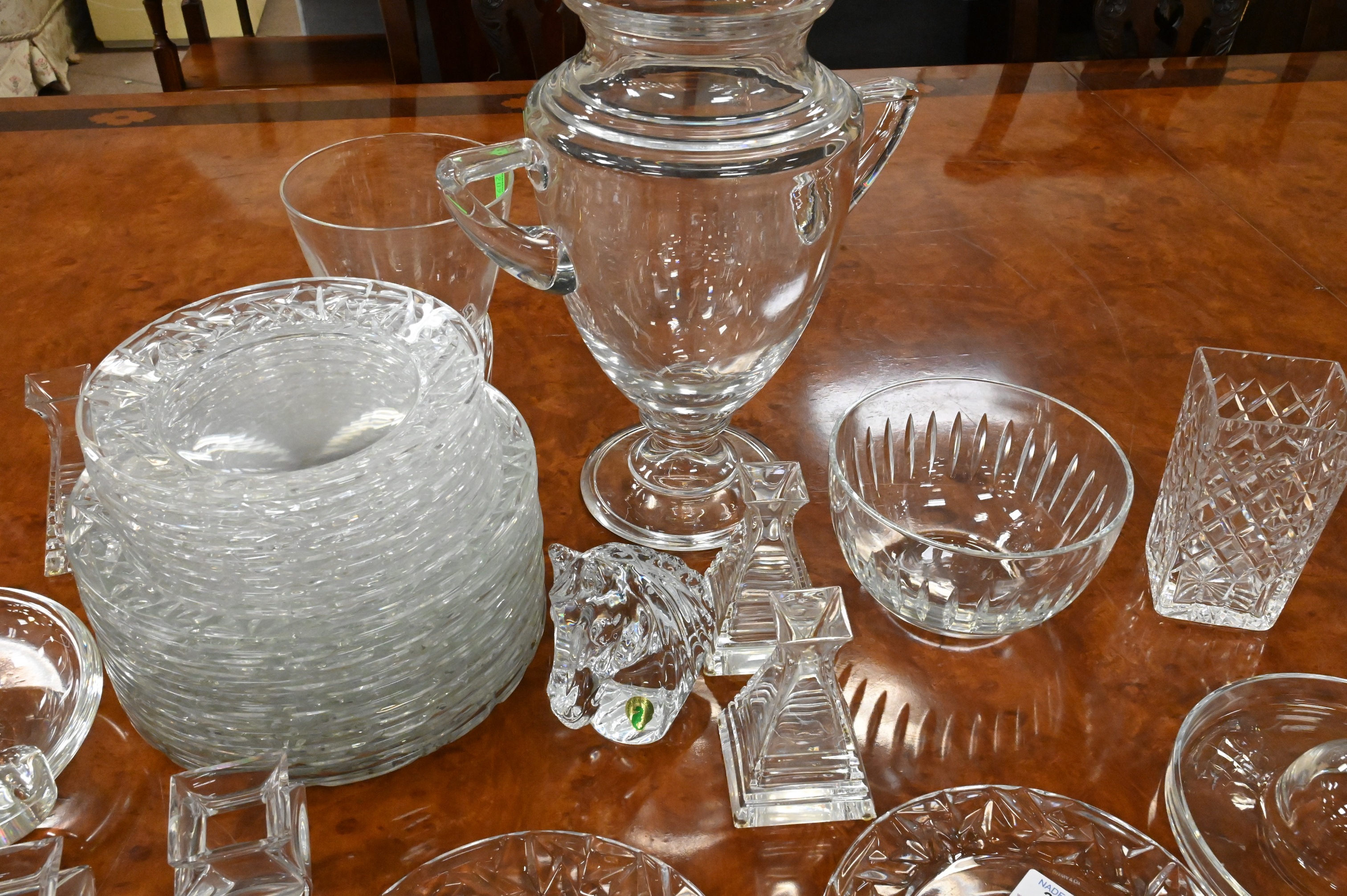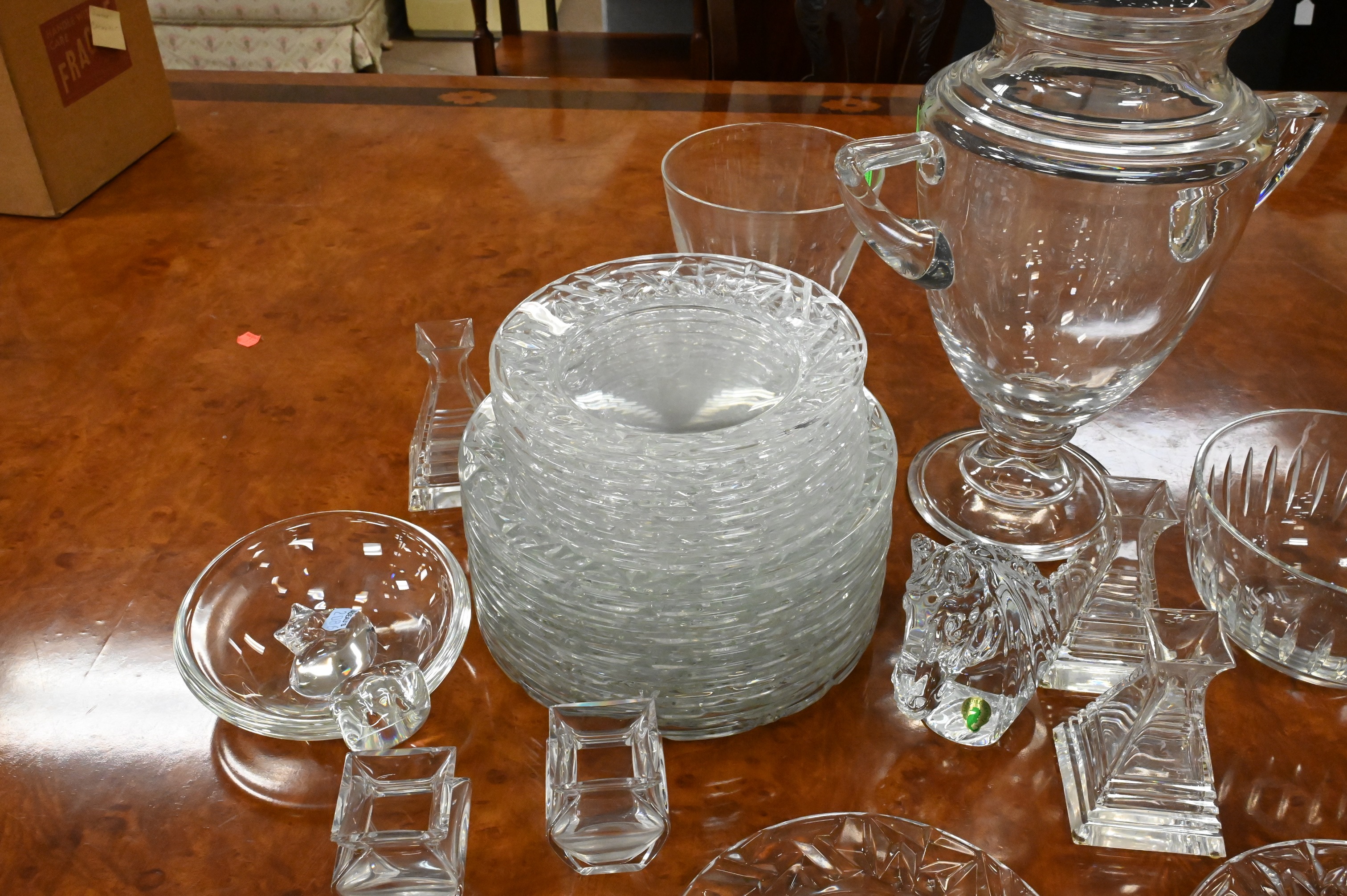 to include three Tiffany and Company square fluted vases, two Sevres small vases, Cartier diamond cut square vase, caviar dish, Waterford horse head Tiffany and Company plates, Val St. Lambert trophy, Steuben vase, dish, cat, and dog, along with two Tiffany ceramic vases in original boxes