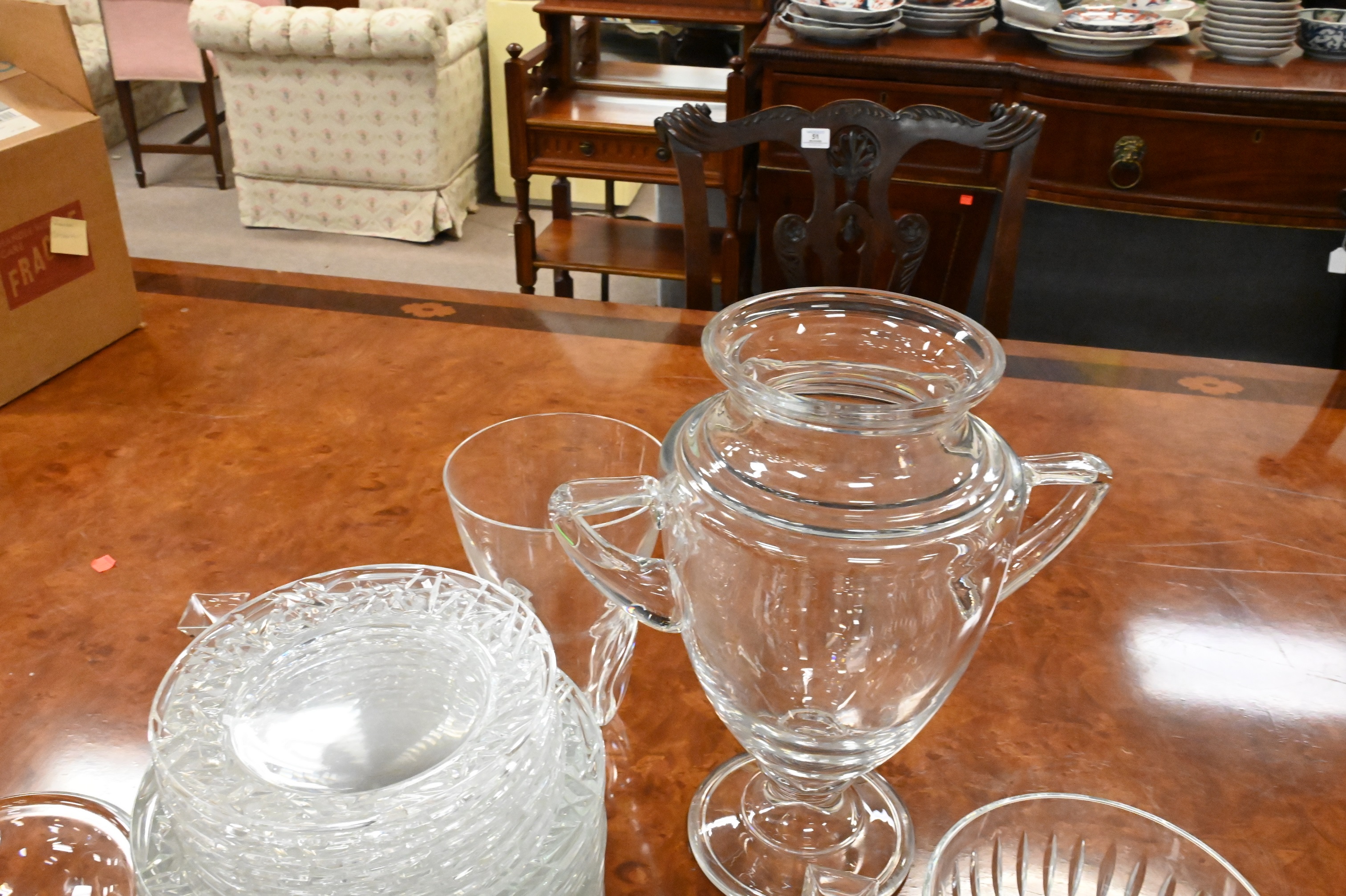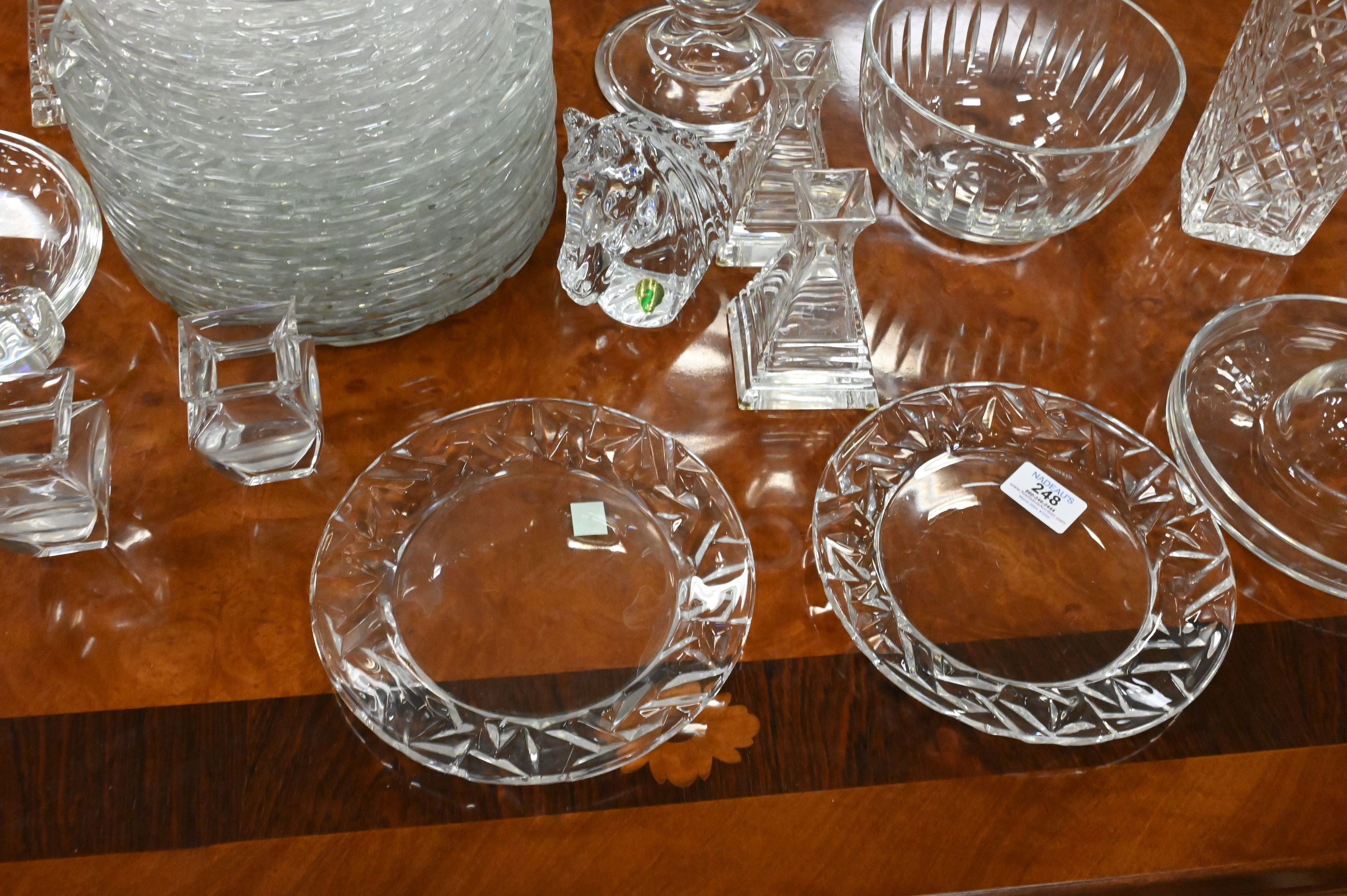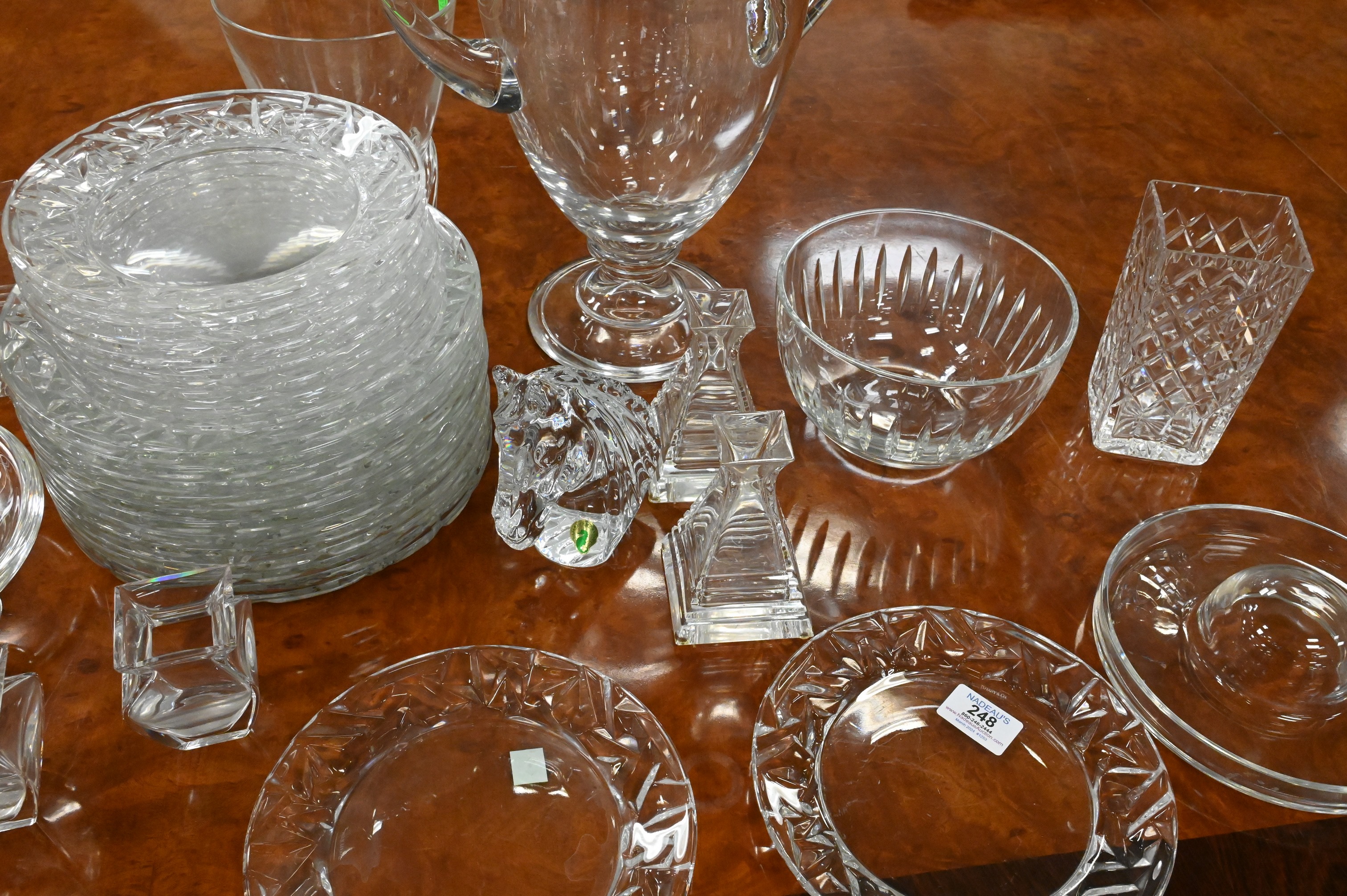to include three Tiffany and Company square fluted vases, two Sevres small vases, Cartier diamond cut square vase, caviar dish, Waterford horse head Tiffany and Company plates, Val St. Lambert trophy, Steuben vase, dish, cat, and dog, along with two Tiffany ceramic vases in original boxes