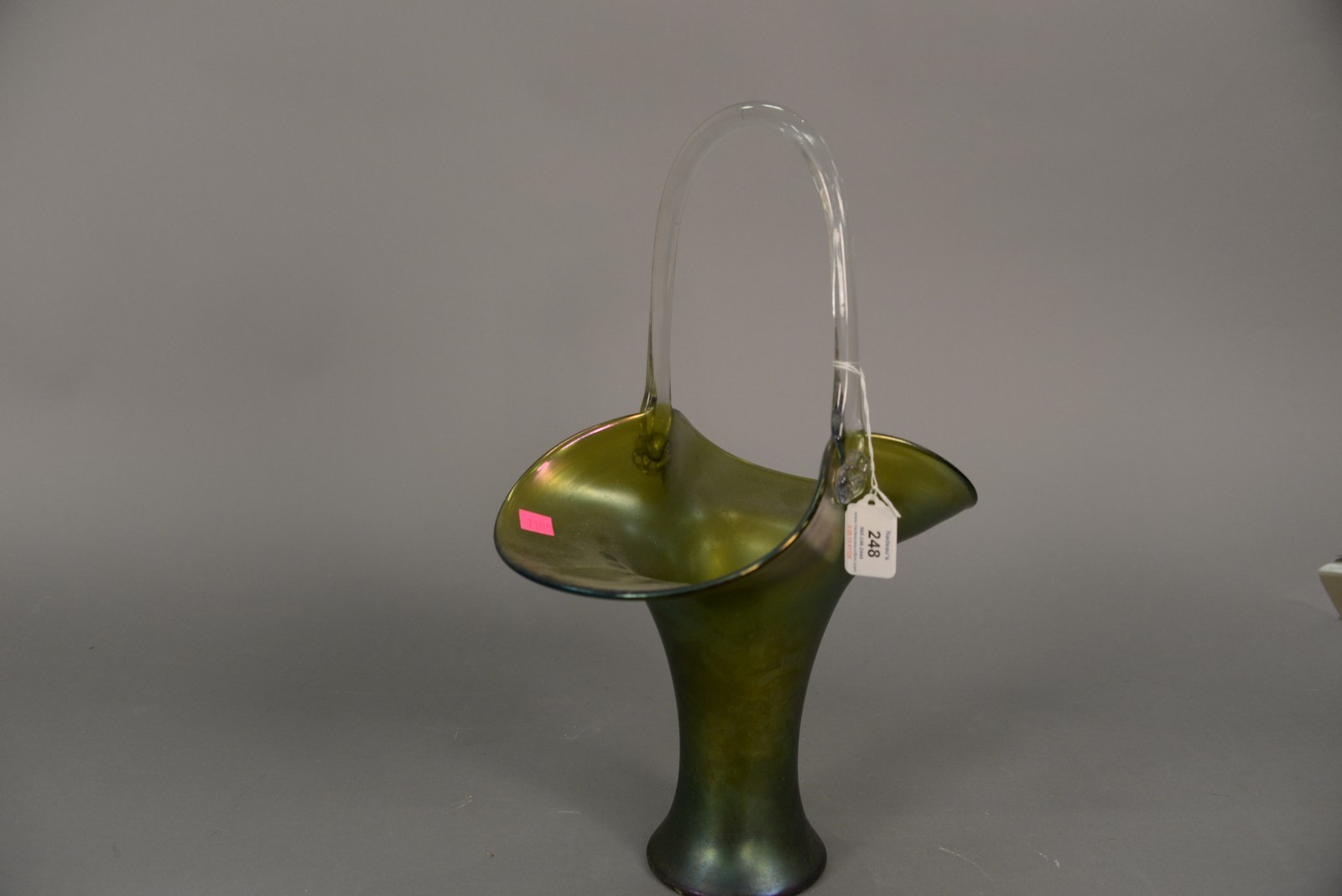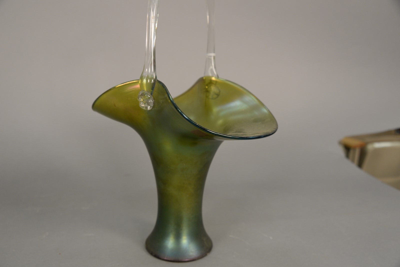 Loetz art glass basket having iridescent green body and clear handle. ht. 17 1/2 in.